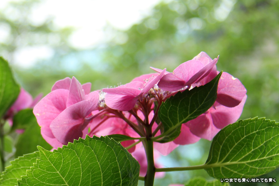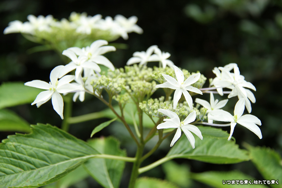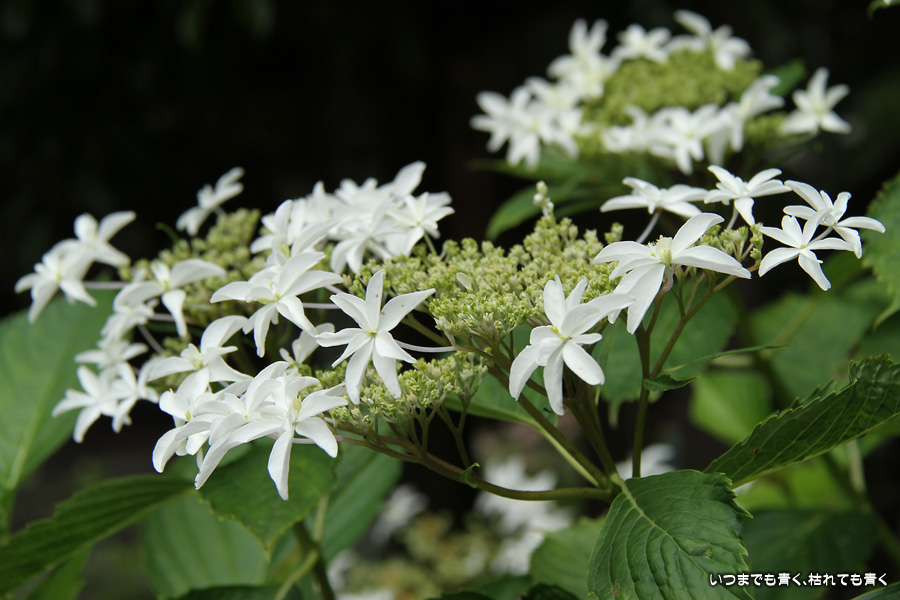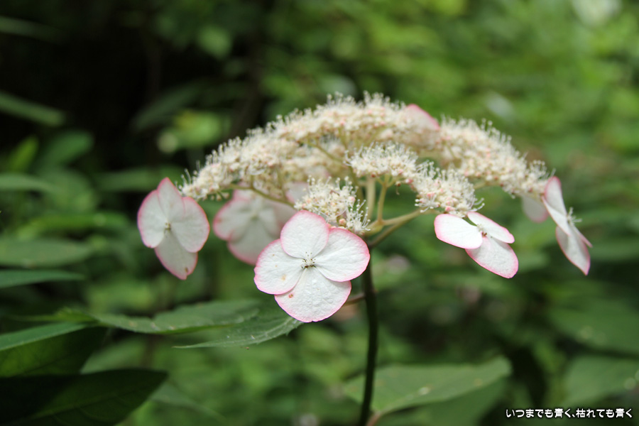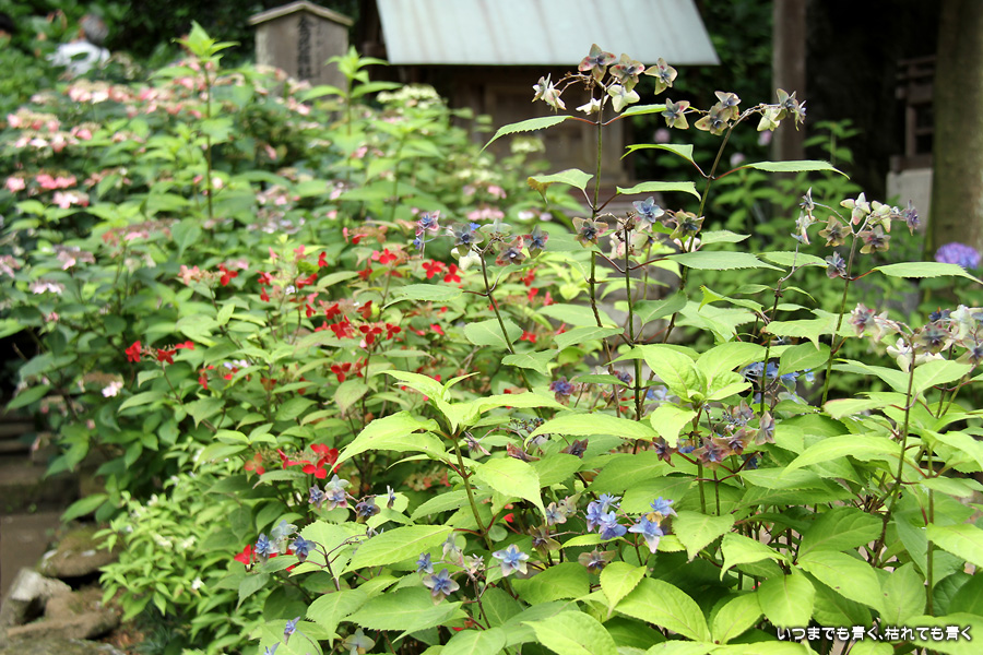 御霊神社の本堂の後ろをぐるりと巡るあじさいの小道の紫陽花です。いろんな種類の紫陽花がありますが、ここでは八丈千鳥という1年に二度咲きするあじさいが珍しいとのことです。