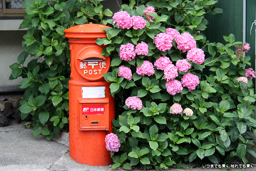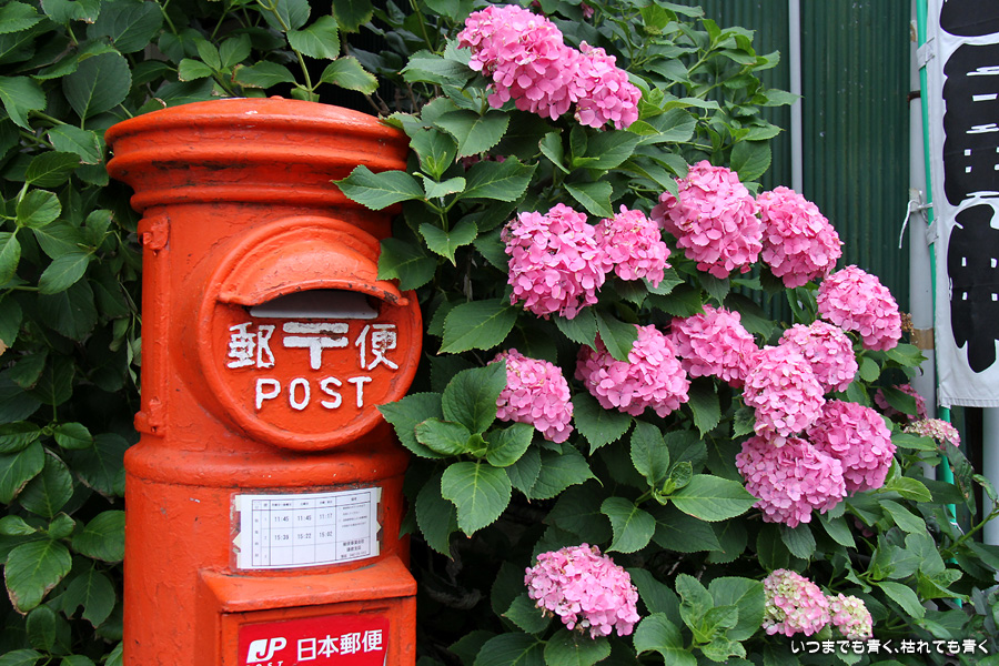 鎌倉坂ノ下にある和菓子の老舗、力餅家にある「あじさいポスト」の写真です。ピンクの紫陽花と赤い郵便ポストが良く似合います。訪れたのが18:30という時刻でしたので、お店はすでに閉店後でした。