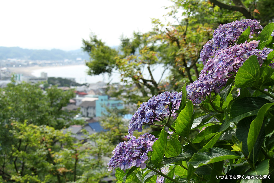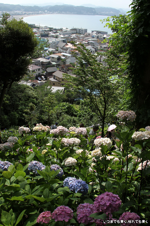 この時期の長谷寺の眺望散策路は、訪れる人が多く平日でも昼前には入場制限がかかってしまいます。制限なくゆったりと楽しむために、奥さんとホテルで早めの朝食をとり、横須賀線と江ノ電を乗り継ぎ、朝一番で訪れました。そのおかげで、人の入らない写真や、距離を置いての撮影も可能でした。今年の長谷寺眺望散策路の紫陽花は、数も多くて見ごろの美しい紫陽花が多く、由比ガ浜もきれいに見えましたし、私が来るようになってから一番の満足度でした。奥さんは、長谷寺の紫陽花は初めてでしたが、部晴らしいと感激して楽しんでいました。