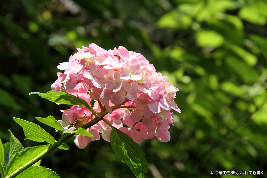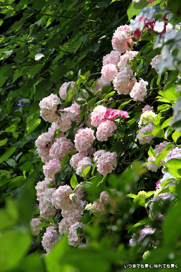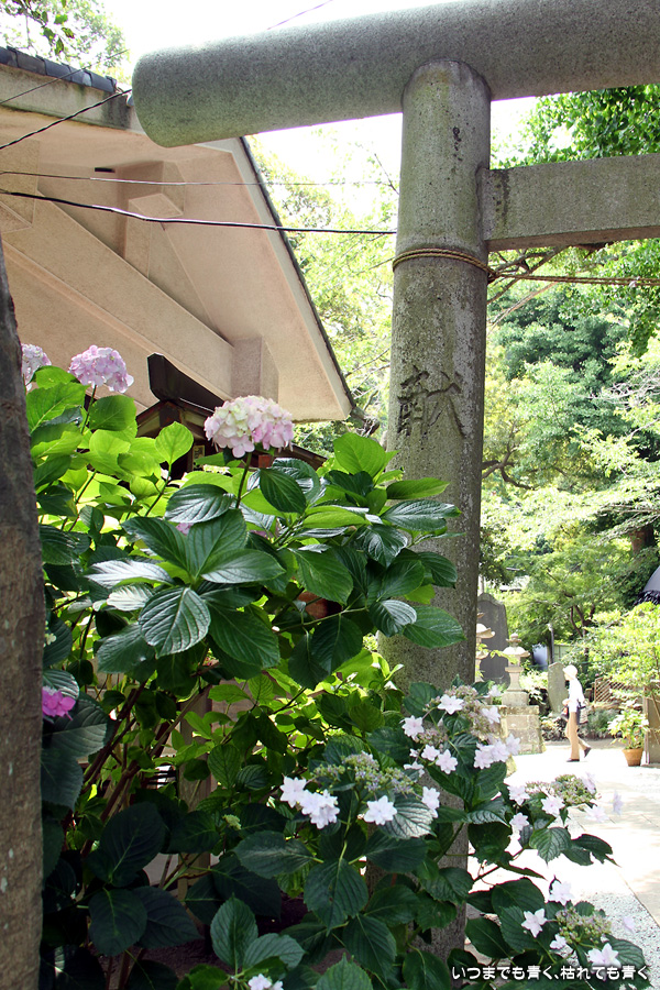 長谷寺の紫陽花を見たあとは、必ず御霊神社の境内を通って神社前の江ノ電の踏切で江ノ電の撮影を行いますが、御霊神社にも紫陽花の小道があって本堂のまわりの紫陽花ををぐるりと一周楽しめます。今年はちょっと数が少ないようで寂しい感じがしました。ここには八丈千鳥という6月と10月に咲く紫陽花があります。