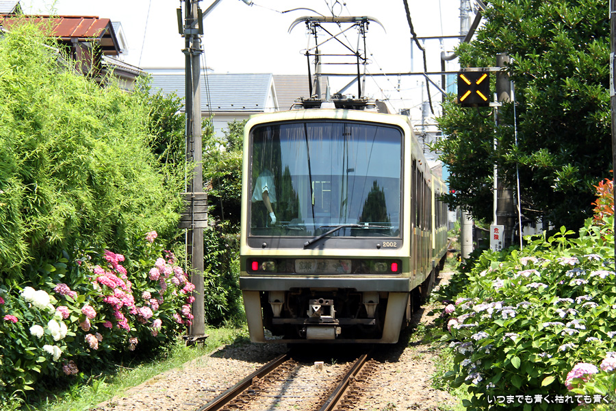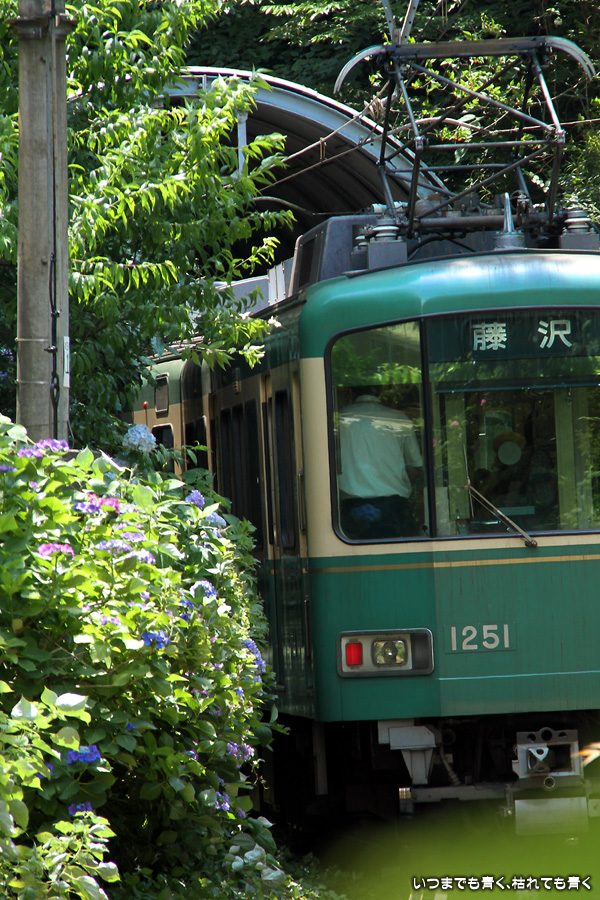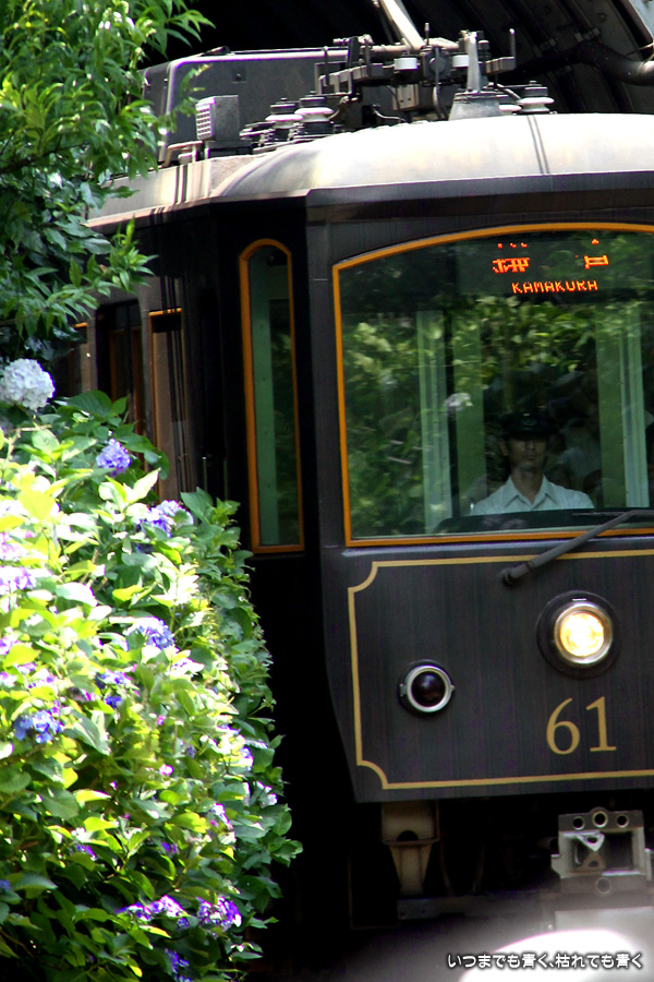 2013年6月17日に撮影した、神奈川県鎌倉市・江ノ電と紫陽花の写真です。