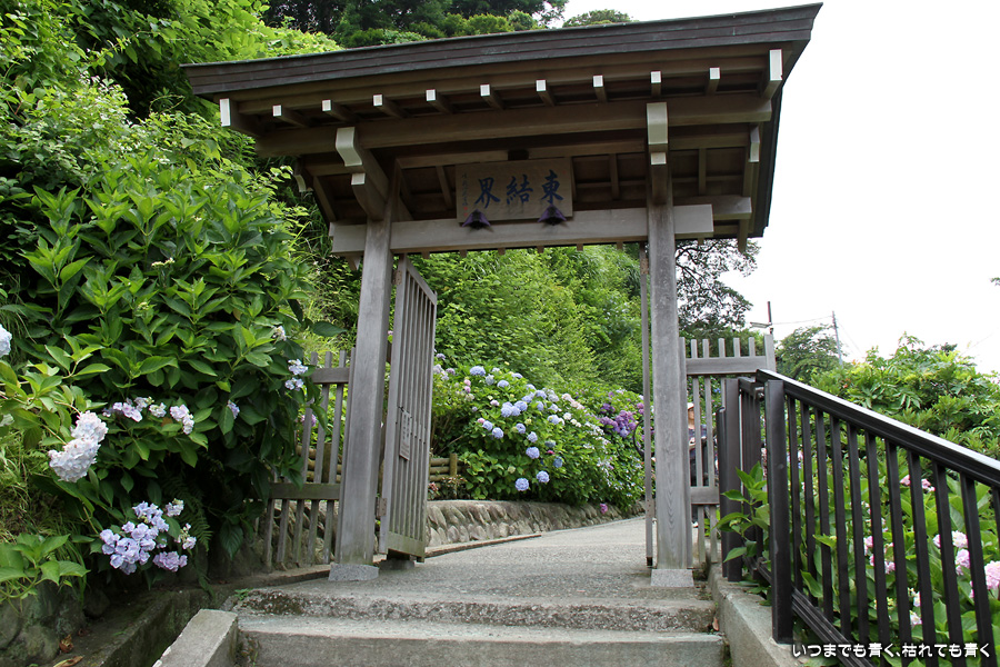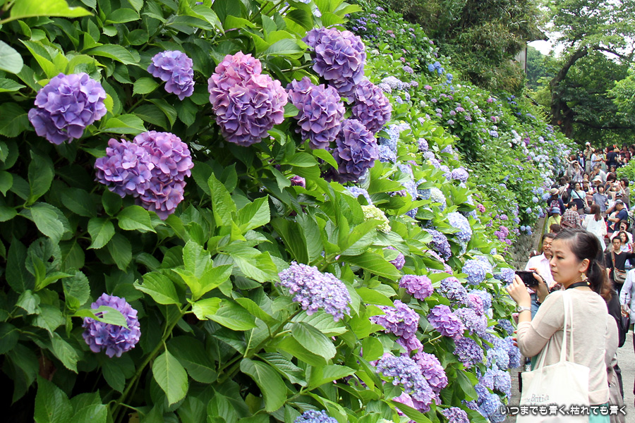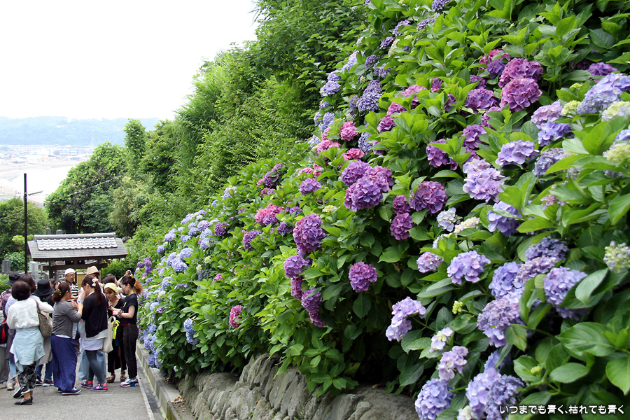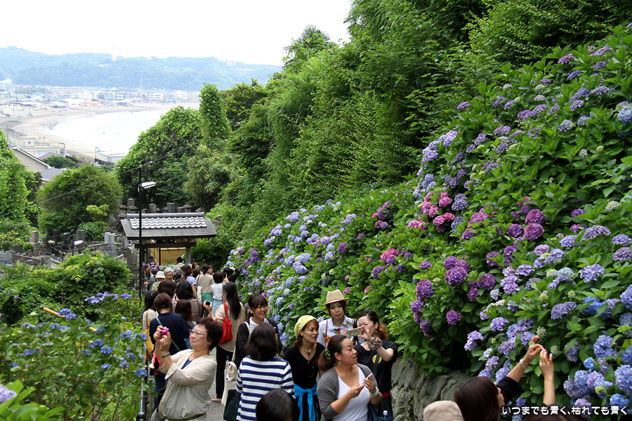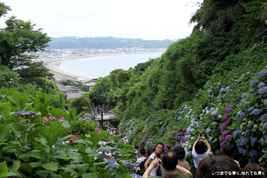 成就院の石段の参道の両側に咲く多くの紫陽花を見ながら望む由比ガ浜の景色はとても素晴らしい景色です。曇り空で海岸が少し霞んでいるのが残念でしたが、ここの紫陽花はちょうと見頃で美しく、見に来て良かったと思います。