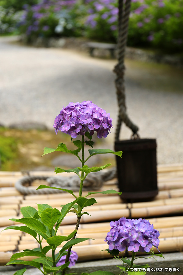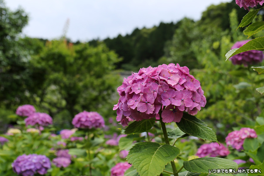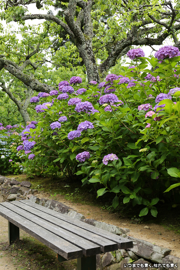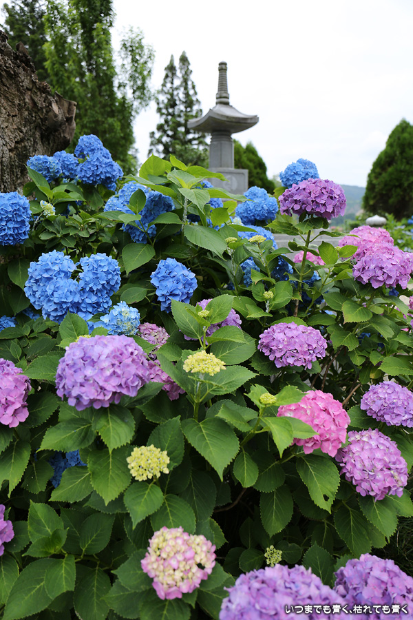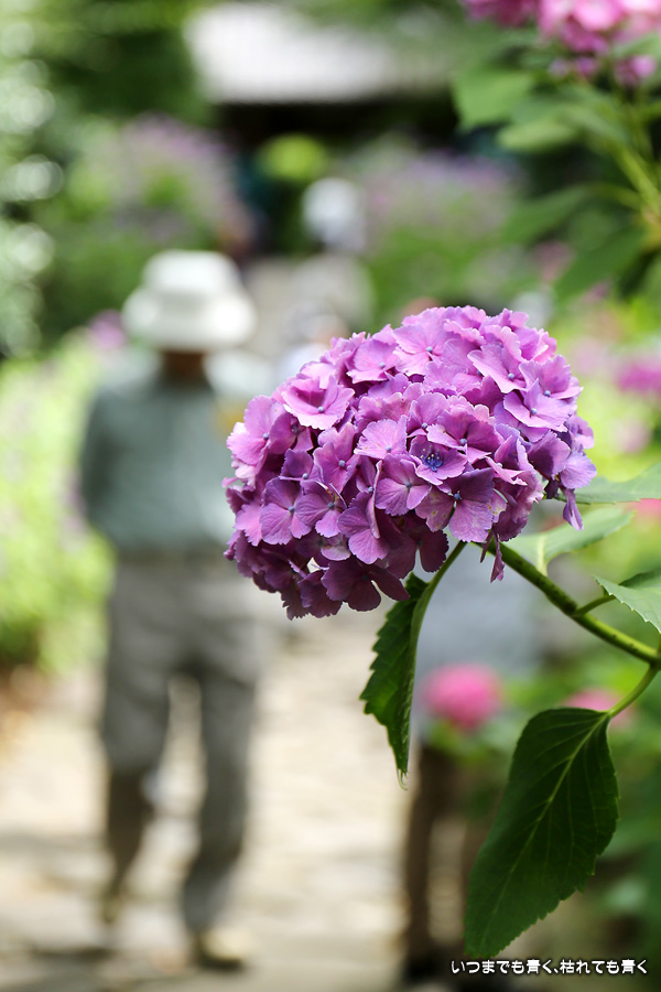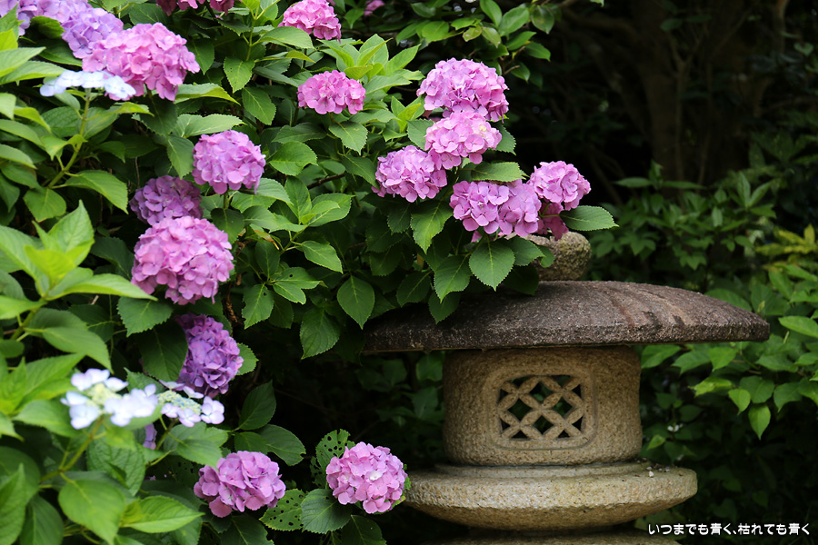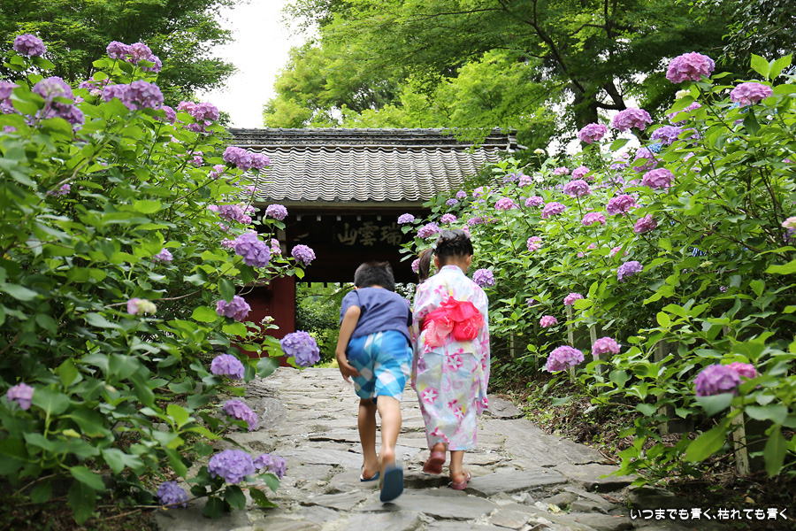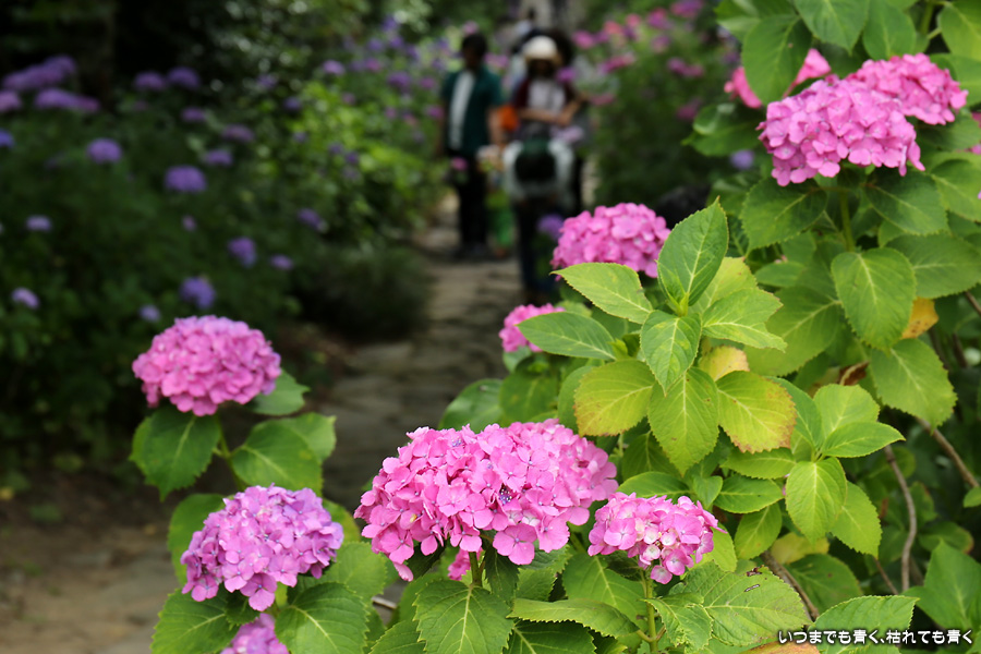 三河のあじさい寺、瑞雲山本光寺の紫陽花を家族で見に来ました。このお寺に紫陽花を見に来たのは今年で5回目(2010年、2011年、2012年、2014年、2016年)ですが、今日は、その5回の中で一番きれいではないかと思えるほど、花の状態が良かったです。すべての花が咲き始めたばかりの美しさで、目立つ傷みも全くありませんでした。そういう見ごろ最良日のせいか、私たちが帰る頃には駐車場に向かう道にクルマの行列ができるほどの人の多さでした。写真を撮る人も多くて、撮ろうとする構図の中からなかなか出てくれないのはお互い様で仕方がありませんが、あじさいの花の前でずっと三脚を置いたままにしていたり、カメラ談義を長々とするのだけはご勘弁といった感じでした。