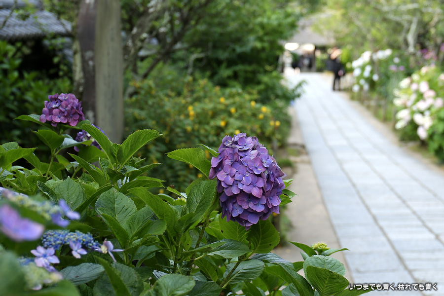 縁切寺こと東慶寺は、紫陽花の咲きがよくないですね。例年はこの石段の両側は紫陽花でいっぱいなのに、今年はほとんどありません。閉門10分前だったなのに、参拝と御朱印の親切な対応をしてくださって、感謝でした。