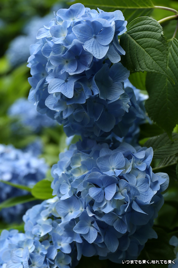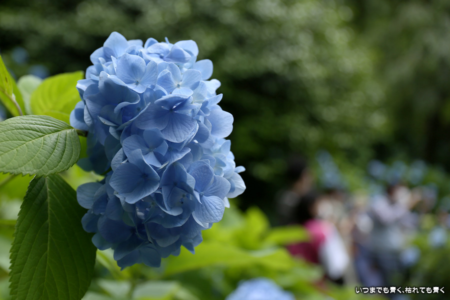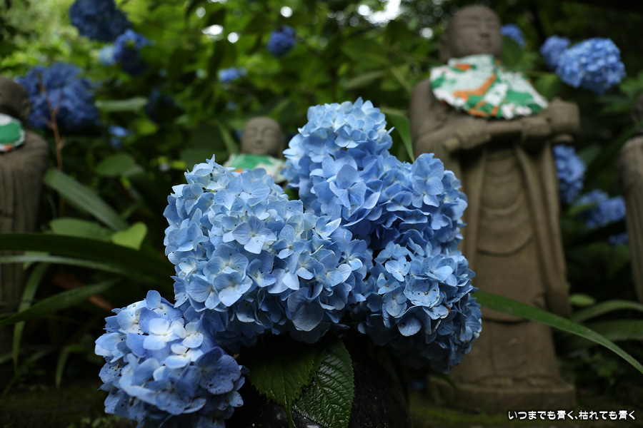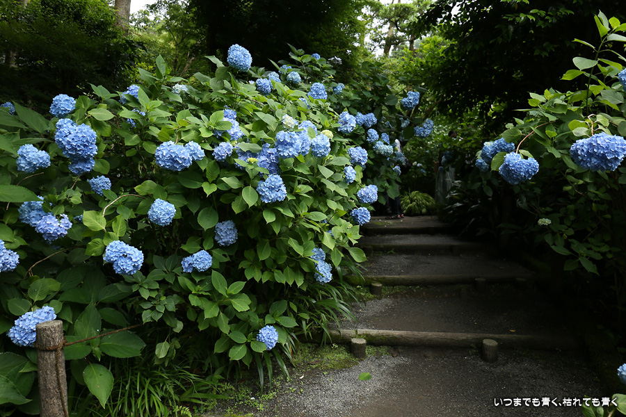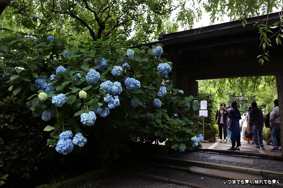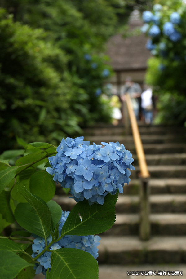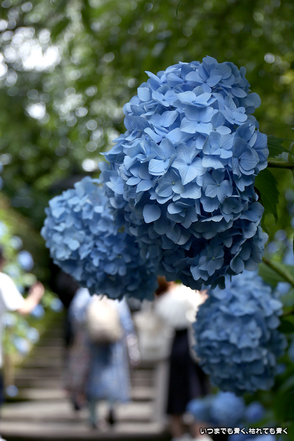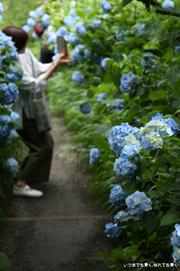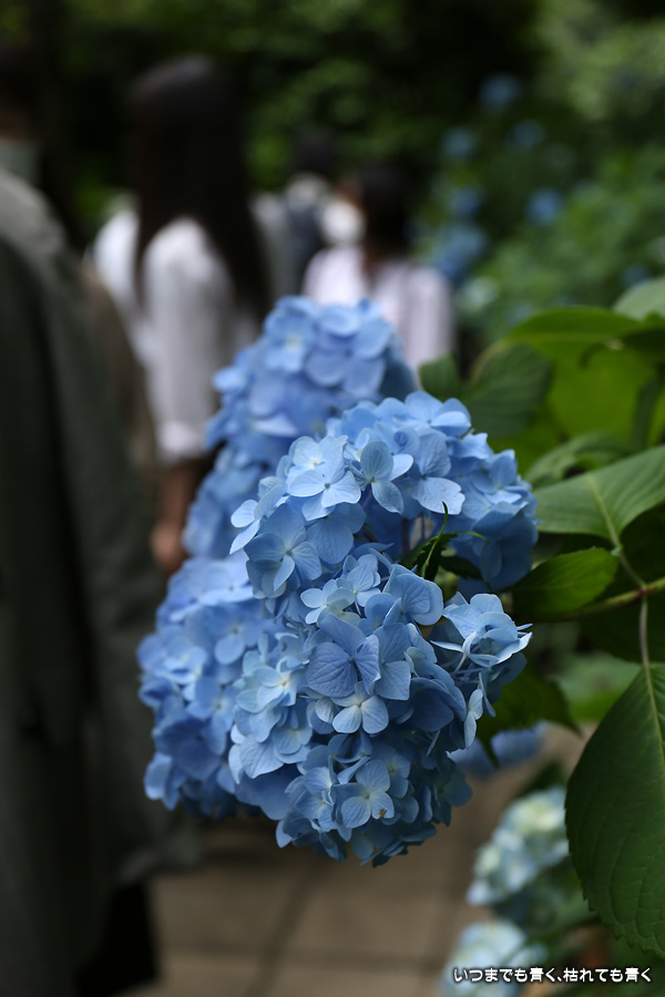 「ここは青い紫陽花ばかりだね」という声がたまに聞こえてきますが、明月院と言えば明月院ブルーの紫陽花です。今年は早めに来たせいか紫陽花の花が若々しくて美しいものばかりでした。明月院ならではの構図で撮影しようと心がけましたが、ひとつひとつの花が美しいので、ついアップで撮ってしまうことも多かったです。人が多くて人を入れない写真を撮るのは難しかったので、人を入れて撮影した写真が多くなりました。