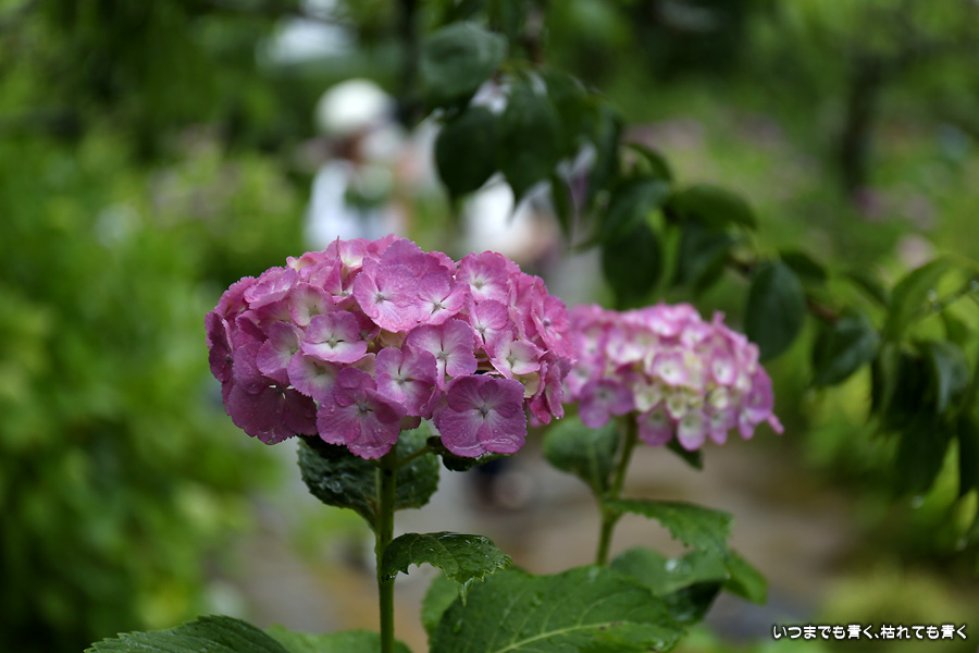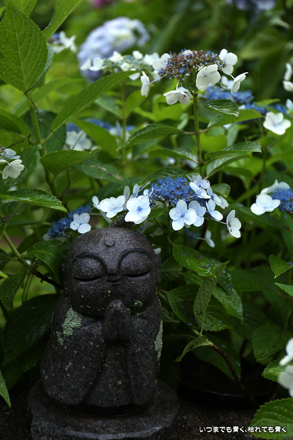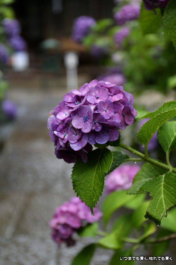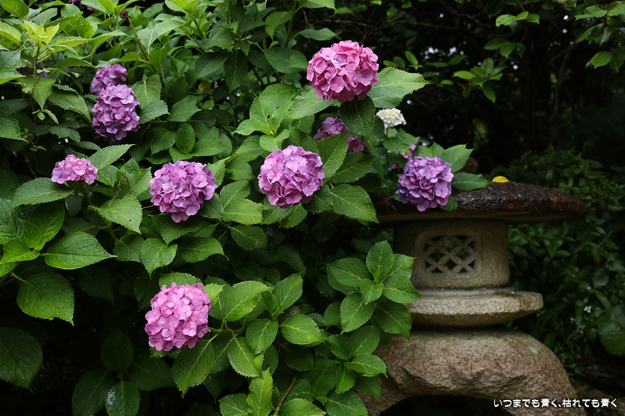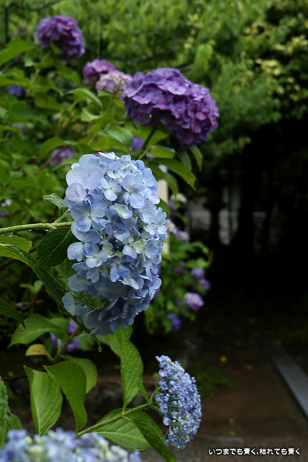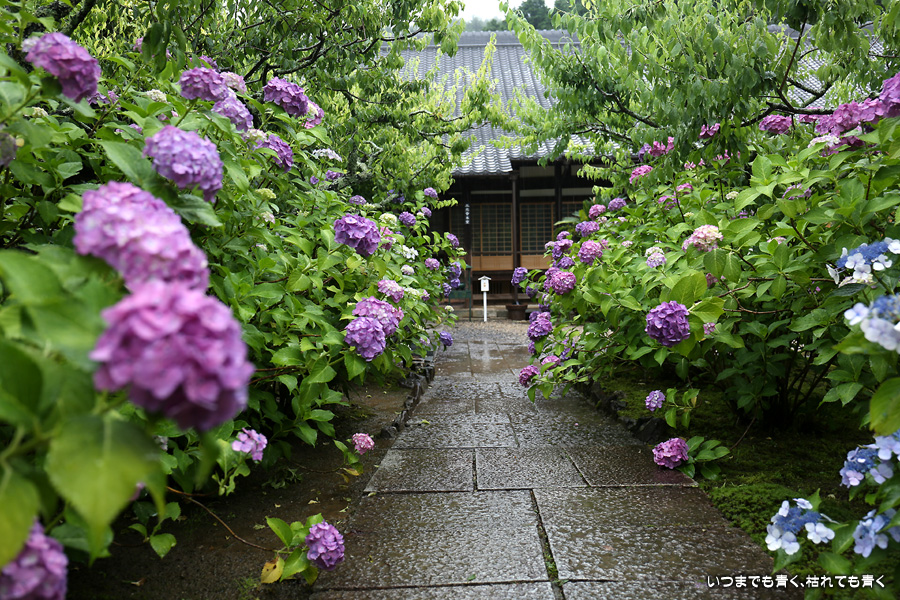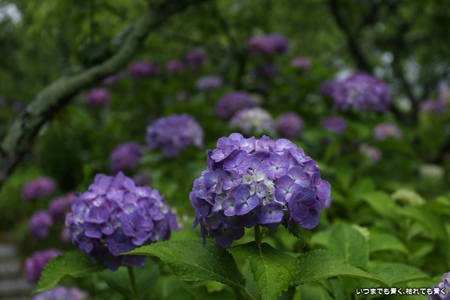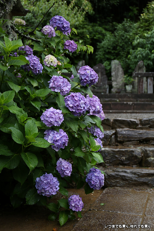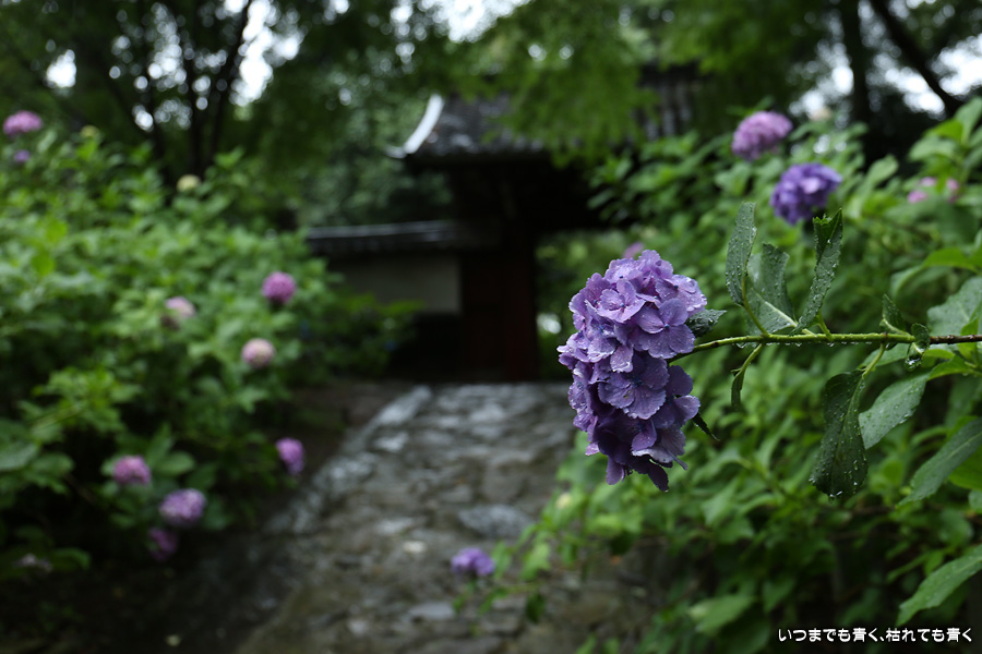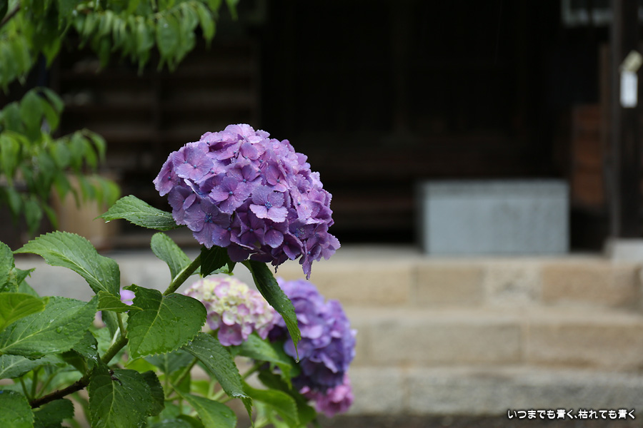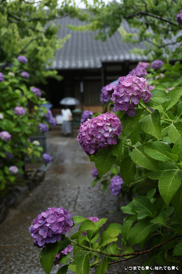 御裳神社を出るとすぐに雨が降り出して、本光寺に着いた頃は本降りになっていました。それでも駐車場に入る車の列で訪れる人は多いです。ここの紫陽花は毎年期待を裏切らずいつも美しいですし、いろいろな構図を探すことができます。ただ、本降りの雨の中、傘をさしての撮影でしたので、手ぶれの写真が少なくなく難しい撮影でした。なお、昨年まで工事中だった本堂が3年がかりの改修を終えてきれいになっていました。そのかわりに今度は肖影堂が工事のシートで覆われていました。御朱印をいただくときに「いつ完成ですか?」と尋ねたら、肖影堂は完全な建替え工事なので4年かかるとのことでした。