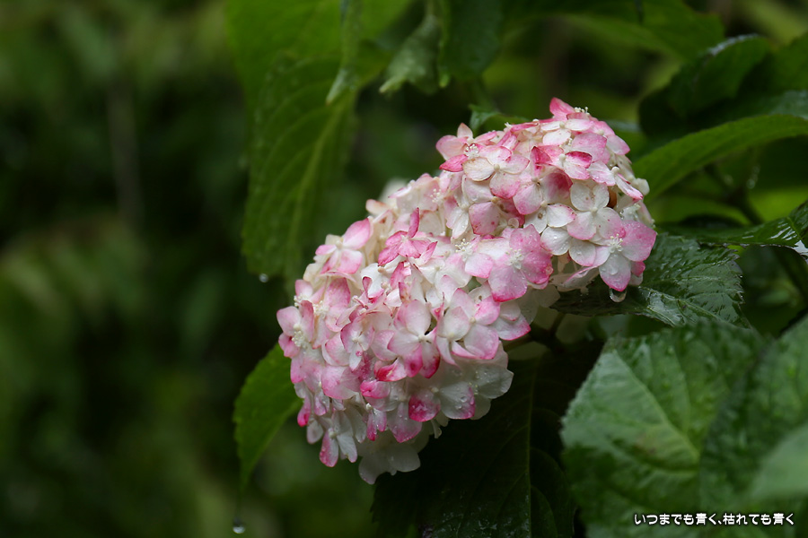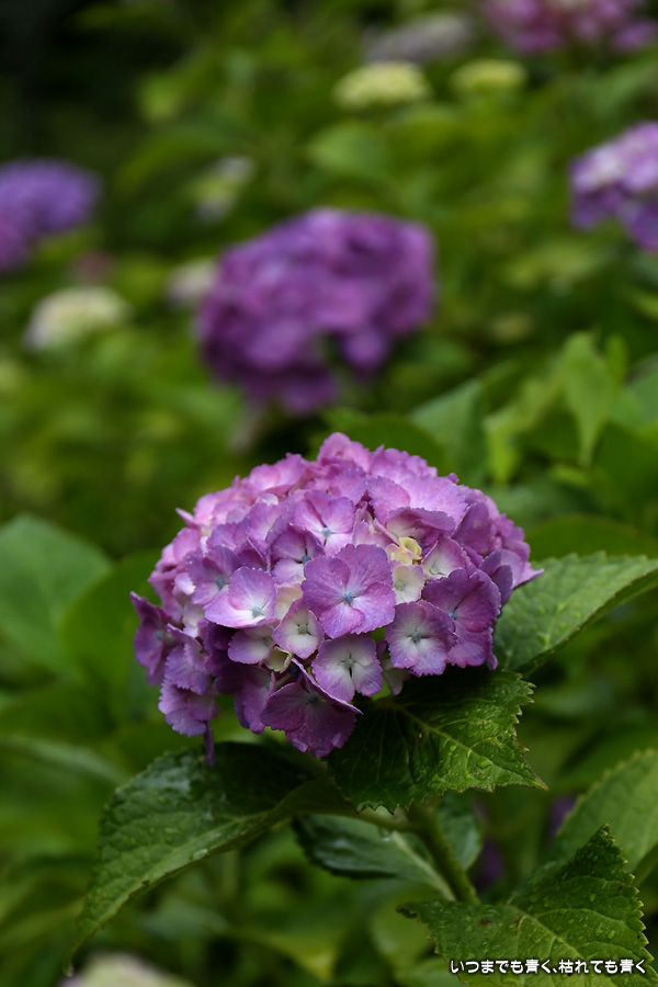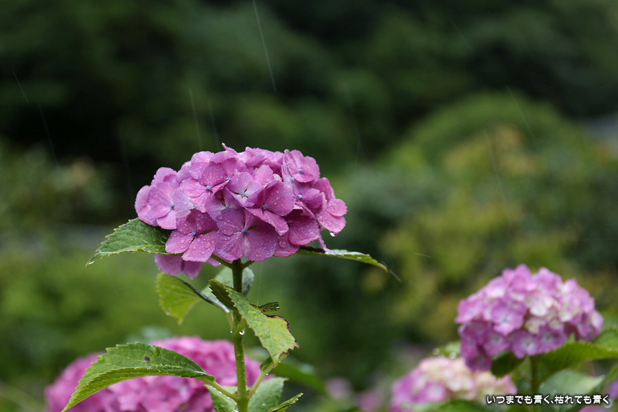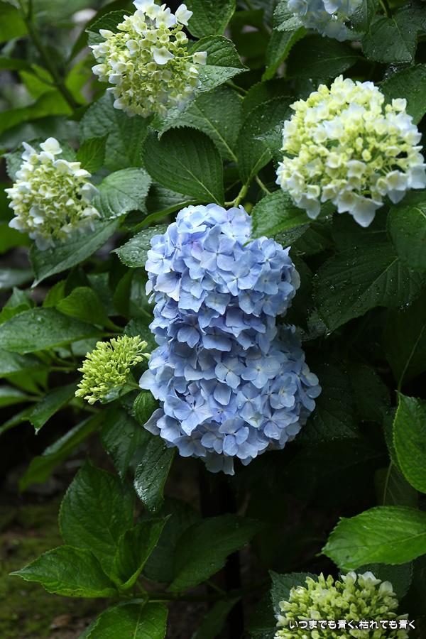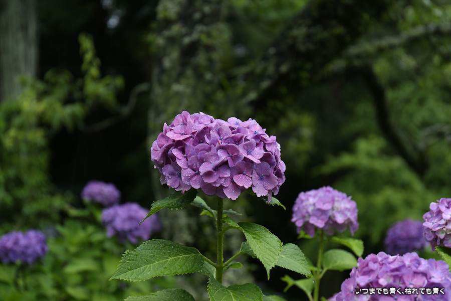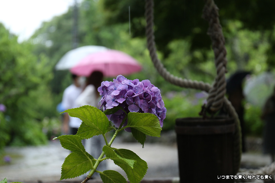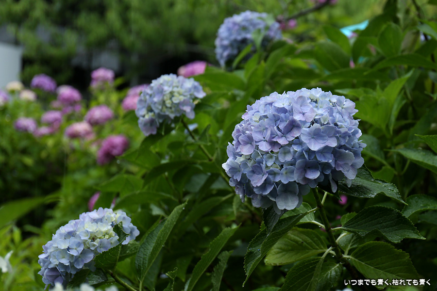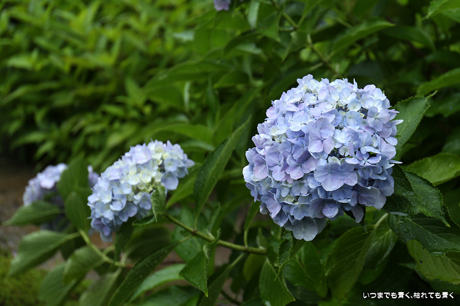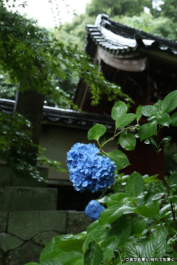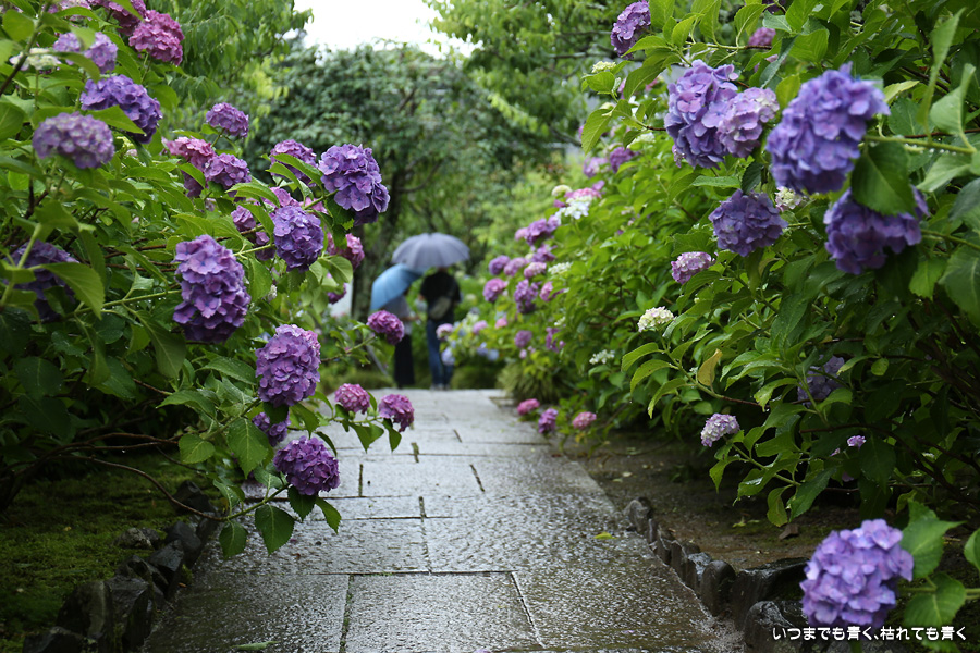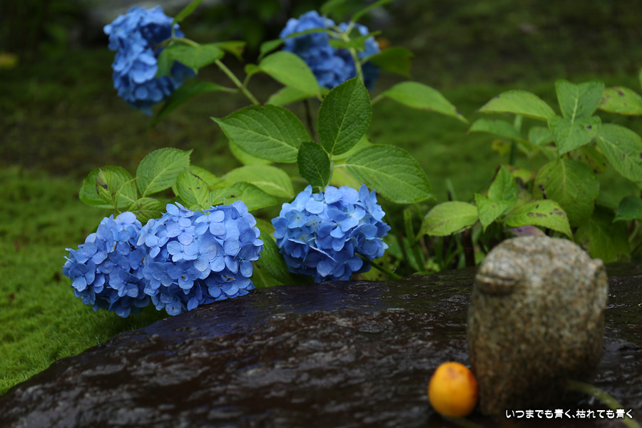御裳神社を出るとすぐに雨が降り出して、本光寺に着いた頃は本降りになっていました。それでも駐車場に入る車の列で訪れる人は多いです。ここの紫陽花は毎年期待を裏切らずいつも美しいですし、いろいろな構図を探すことができます。ただ、本降りの雨の中、傘をさしての撮影でしたので、手ぶれの写真が少なくなく難しい撮影でした。なお、昨年まで工事中だった本堂が3年がかりの改修を終えてきれいになっていました。そのかわりに今度は肖影堂が工事のシートで覆われていました。御朱印をいただくときに「いつ完成ですか?」と尋ねたら、肖影堂は完全な建替え工事なので4年かかるとのことでした。