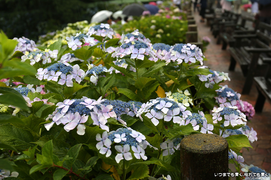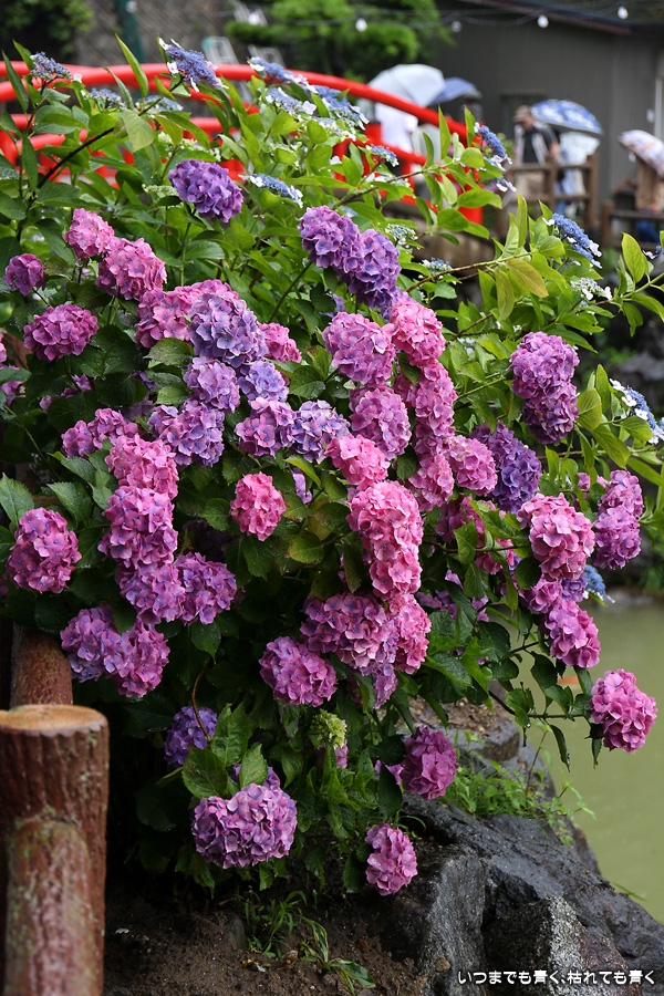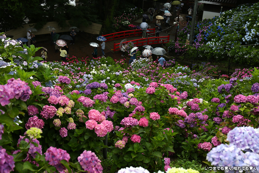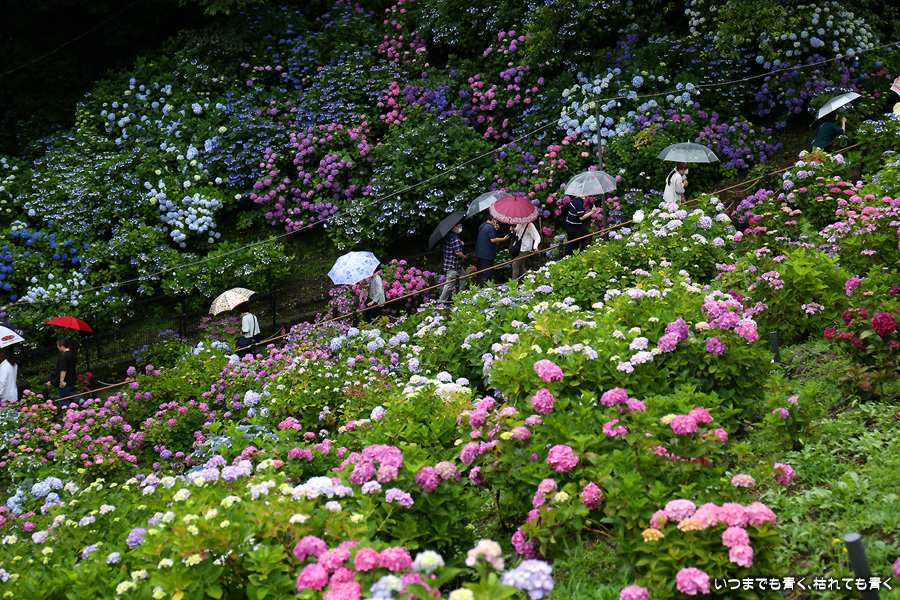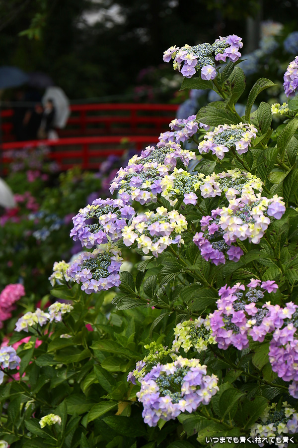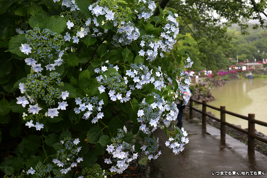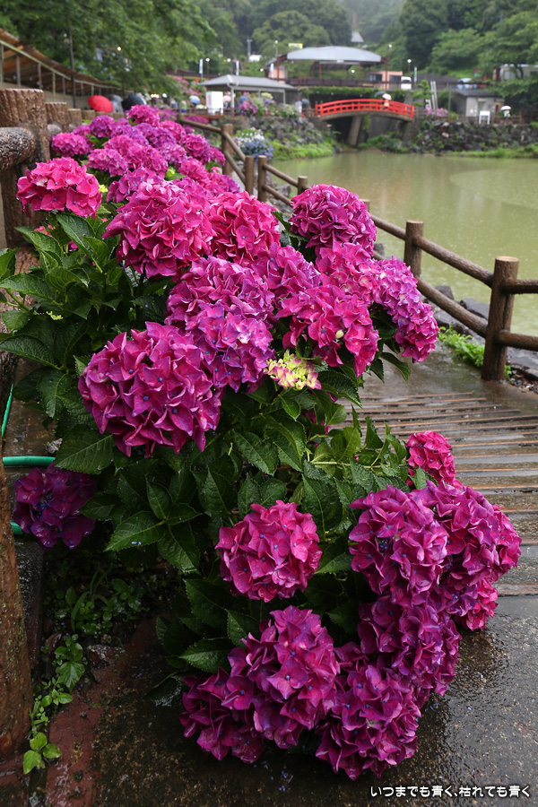 形原温泉あじさいの里は、愛知県では有名な紫陽花の名所なのですが、紫陽花は多くても味気がないだろうと勝手に思っていて訪れることがなかったところです。なので、今回が初めての訪問となります。雨が降っていて紫陽花にはいい感じでしたが、望遠レンズを持ち込むことは難しく、傘をさしての標準ズームレンズでの撮影となりました。形原温泉あじさいの里は、思っていた以上に絵になる素敵なところでした。起伏在り、池あり、橋あり、丘ありの地形にいろんな種類、いろんな色の紫陽花が植えられていて、広い園内を退屈することなく時間を忘れて楽しむことができました。