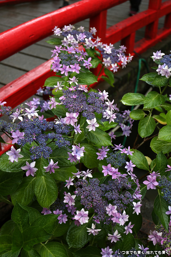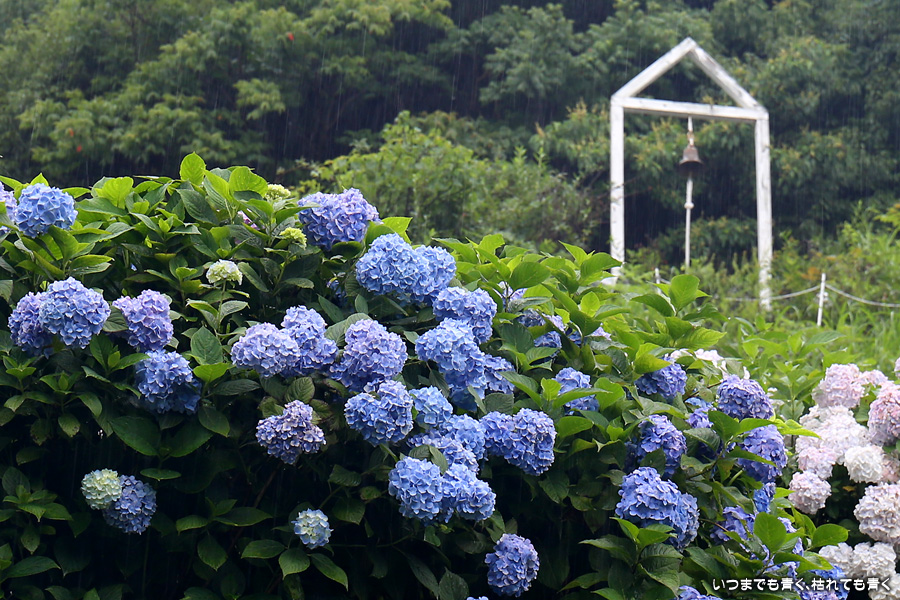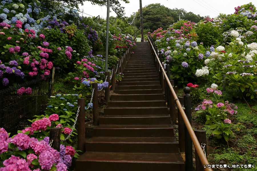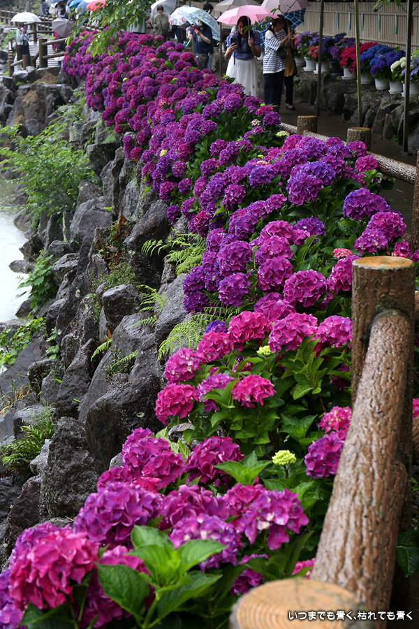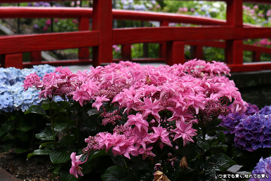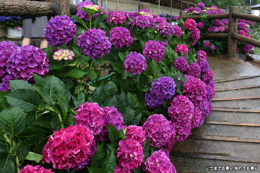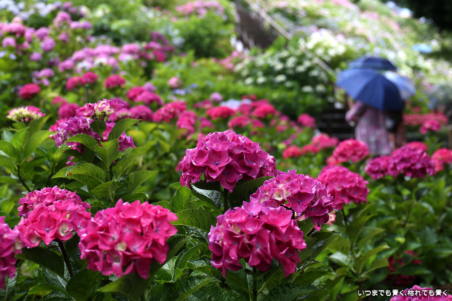 形原温泉あじさいの里は、愛知県では有名な紫陽花の名所なのですが、紫陽花は多くても味気がないだろうと勝手に思っていて訪れることがなかったところです。なので、今回が初めての訪問となります。雨が降っていて紫陽花にはいい感じでしたが、望遠レンズを持ち込むことは難しく、傘をさしての標準ズームレンズでの撮影となりました。形原温泉あじさいの里は、思っていた以上に絵になる素敵なところでした。起伏在り、池あり、橋あり、丘ありの地形にいろんな種類、いろんな色の紫陽花が植えられていて、広い園内を退屈することなく時間を忘れて楽しむことができました。