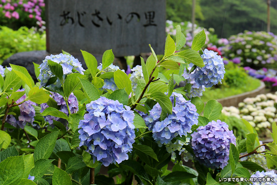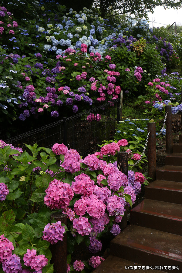 形原温泉あじさいの里は、愛知県では有名な紫陽花の名所なのですが、紫陽花は多くても味気がないだろうと勝手に思っていて訪れることがなかったところです。なので、今回が初めての訪問となります。雨が降っていて紫陽花にはいい感じでしたが、望遠レンズを持ち込むことは難しく、傘をさしての標準ズームレンズでの撮影となりました。形原温泉あじさいの里は、思っていた以上に絵になる素敵なところでした。起伏在り、池あり、橋あり、丘ありの地形にいろんな種類、いろんな色の紫陽花が植えられていて、広い園内を退屈することなく時間を忘れて楽しむことができました。