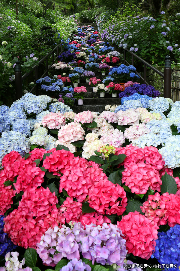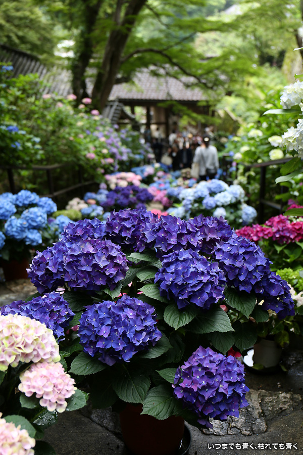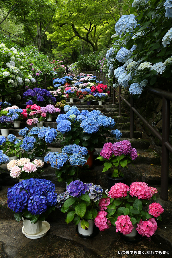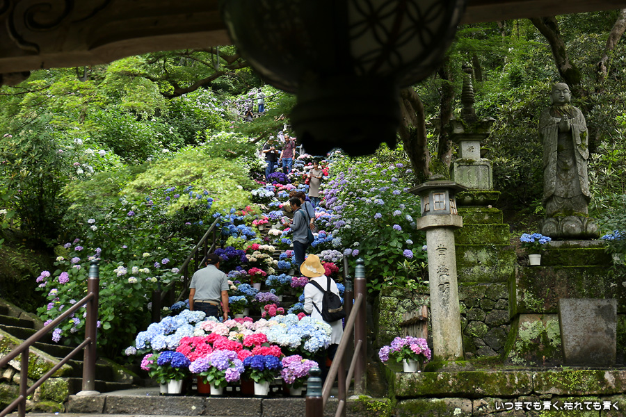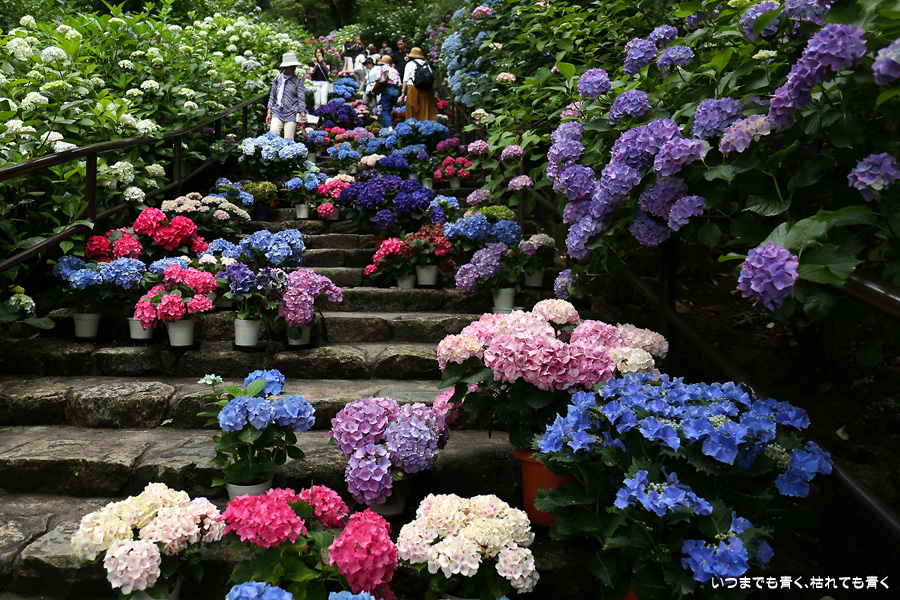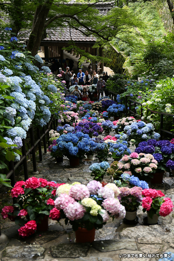 長谷寺の嵐の坂に紫陽花の鉢植えがびっしりと飾られています。大和三大観音である長谷寺、岡寺、壷阪寺でおこなわれている「あぢさゐ回廊」です。いろんな色の鮮やかな紫陽花はとれも美しいです。嵐の坂は立ち入り禁止にもなっておらず、この石段を鉢植えを避けて上ったり下りたりできます。写真を撮るには人が入って邪魔ですが、おかしな雰囲気になることも無く皆さん楽し気に写真を撮っていました。私も人を入れたり、じっと人がいなくなるのを待ったりと、のんびりと楽しみながら写真撮影をしました。岡寺と壷阪寺にも行きたいと思いましたが、それは来年の楽しみになりそうです。