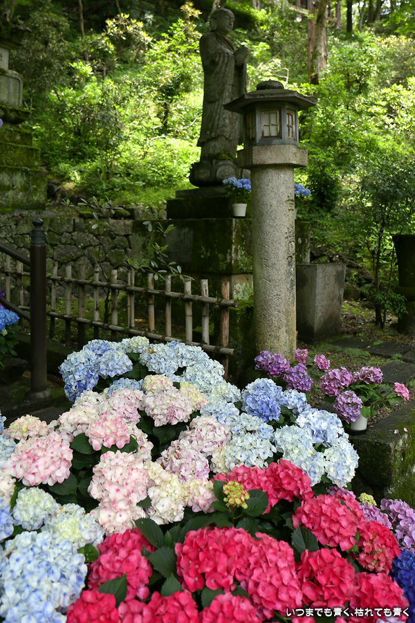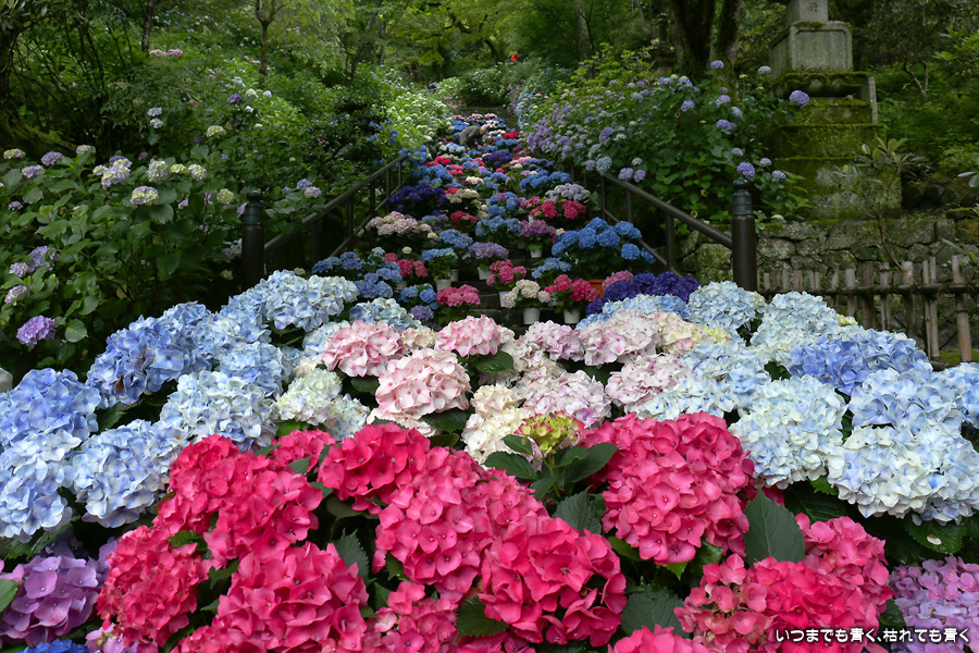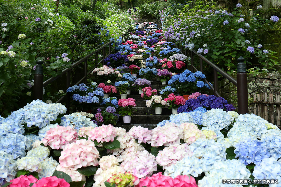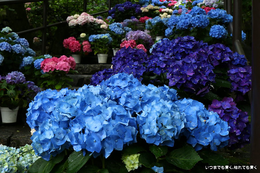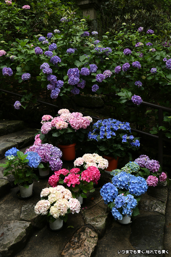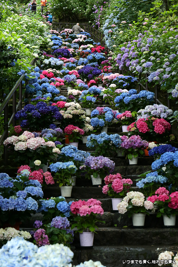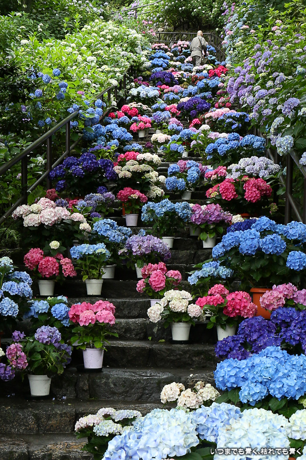 長谷寺の嵐の坂に紫陽花の鉢植えがびっしりと飾られています。大和三大観音である長谷寺、岡寺、壷阪寺でおこなわれている「あぢさゐ回廊」です。いろんな色の鮮やかな紫陽花はとれも美しいです。嵐の坂は立ち入り禁止にもなっておらず、この石段を鉢植えを避けて上ったり下りたりできます。写真を撮るには人が入って邪魔ですが、おかしな雰囲気になることも無く皆さん楽し気に写真を撮っていました。私も人を入れたり、じっと人がいなくなるのを待ったりと、のんびりと楽しみながら写真撮影をしました。岡寺と壷阪寺にも行きたいと思いましたが、それは来年の楽しみになりそうです。