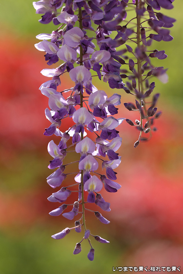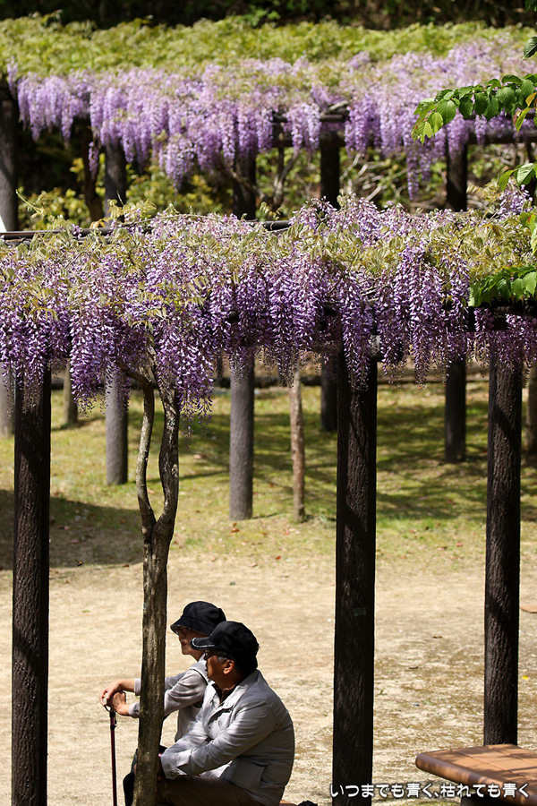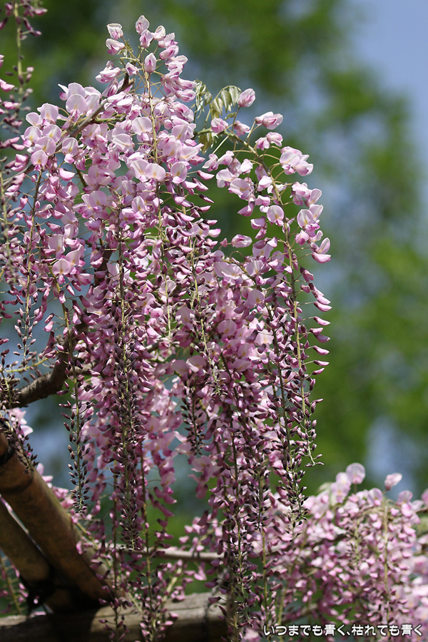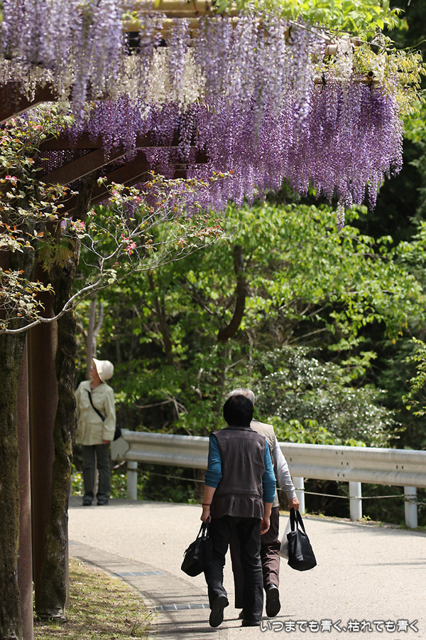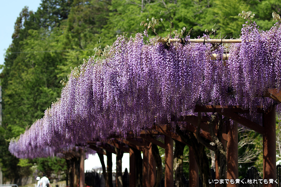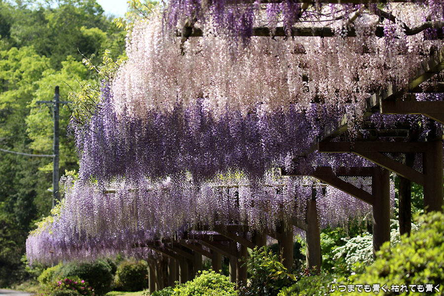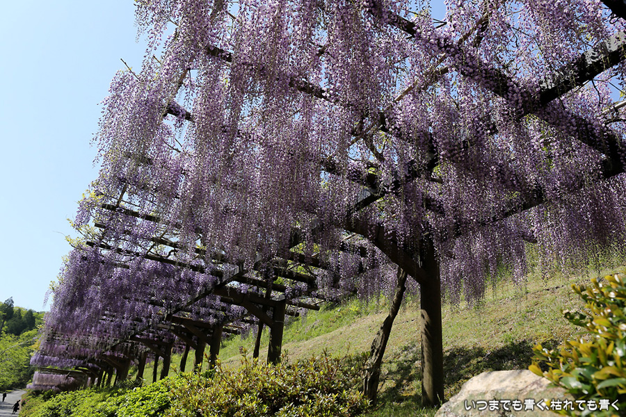 クルマで自宅から1時間弱の市内にある「ふじの回廊」に朝一番で行ってきました。房の先のほうはまだ咲ききっていないのもあり、見頃にはちょっと早いようです。ただ、下が咲く頃は上が枯れ始めていることもありますので、花の美しさからいうと今日くらいがちょうどいいのかも知れません。しかも、今日は人もまばらで、ゆっくりと写真を撮ることができました。ちなみに5/3〜5に「ふじまつり」が開催されます。