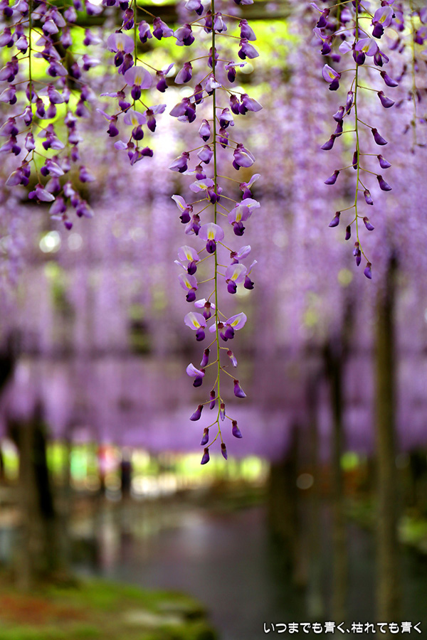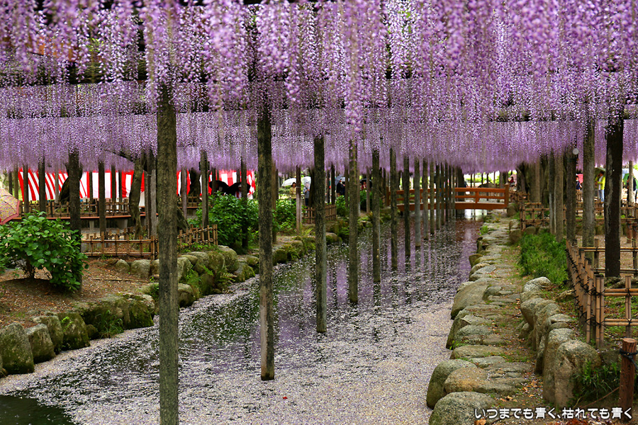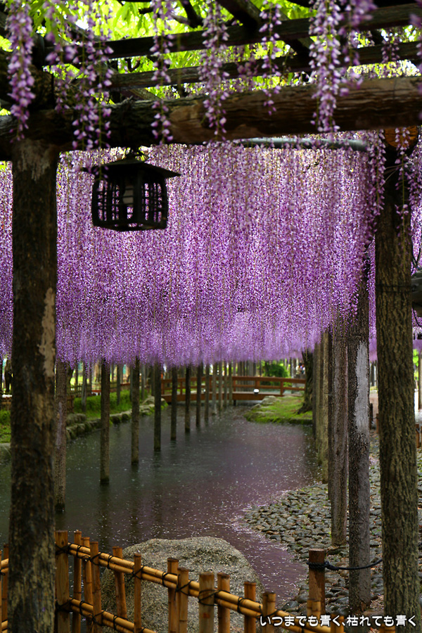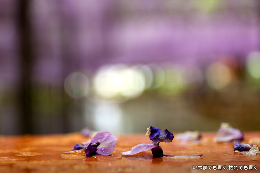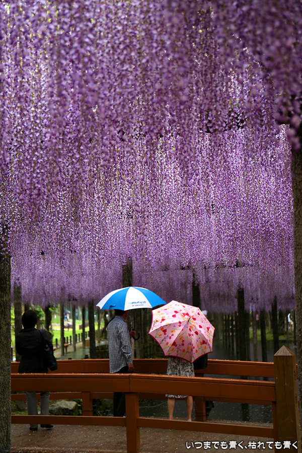 本降りの雨で人が少なくて写真撮影には好都合でしたし、絵になる景色が多かったですし、藤を撮影する場所としてはとても気に入りました。ただ、レンズ面に雨粒があたるのでカメラを上に向けられない、雨や湿気がカメラ内部に入り込む危険があるので交換レンズを使えない、傘をさしながらで姿勢が限られる、など不都合なことも多くて、疲れる撮影でした。
