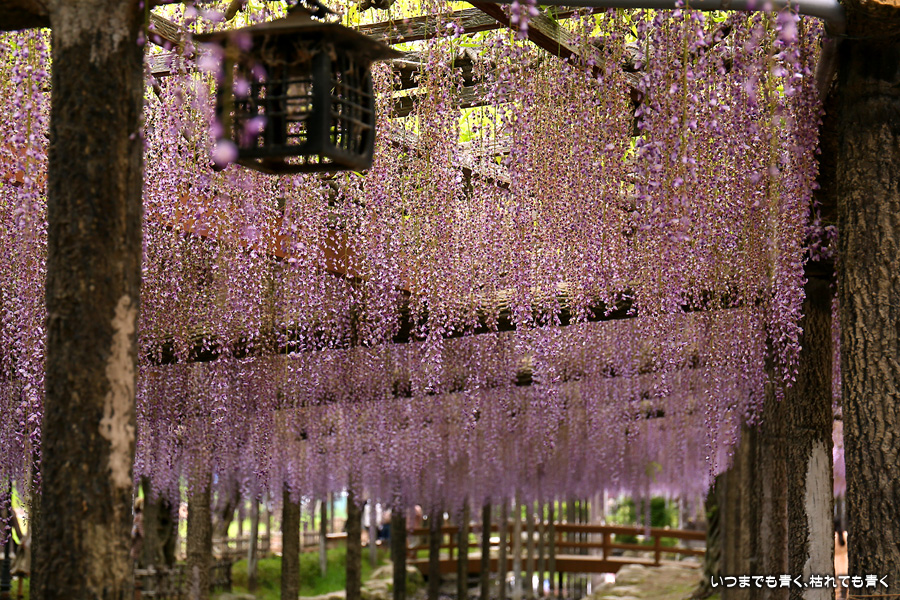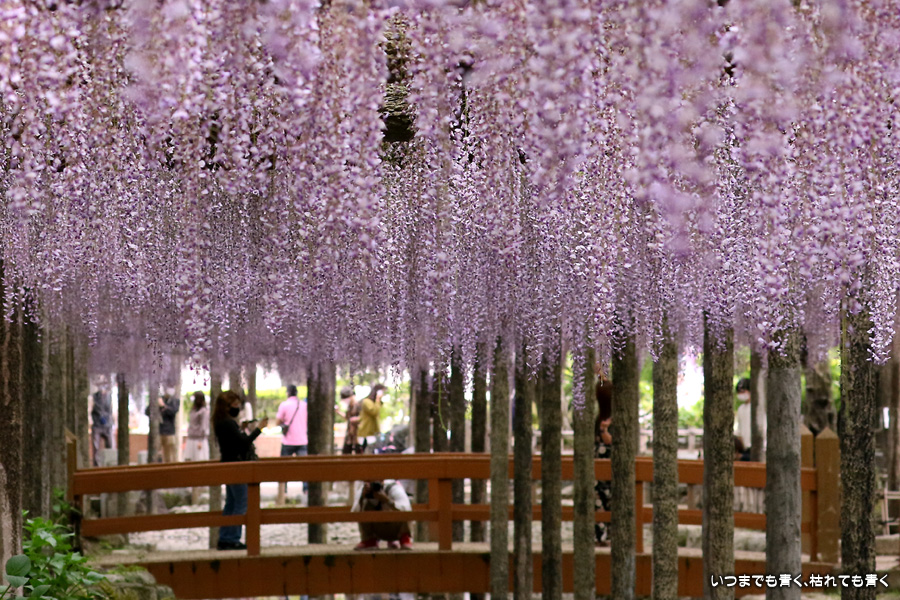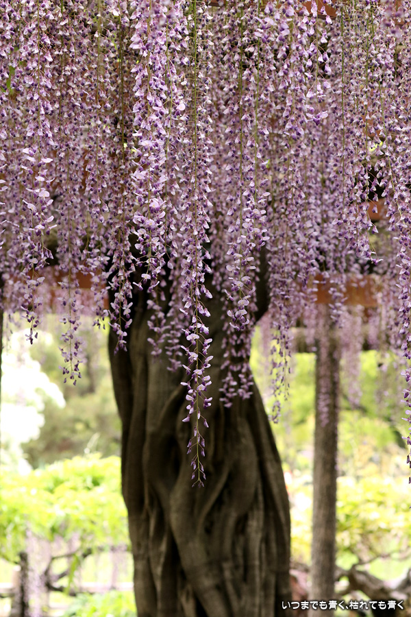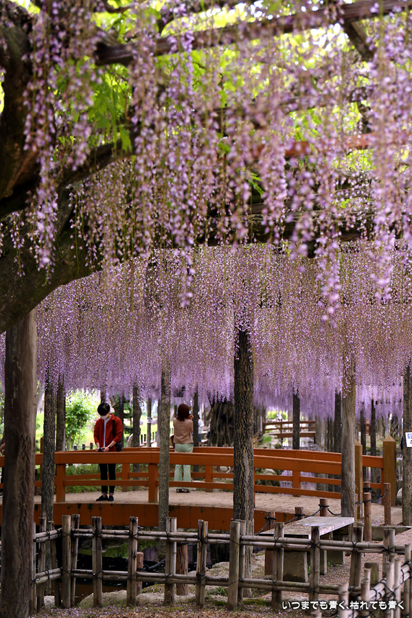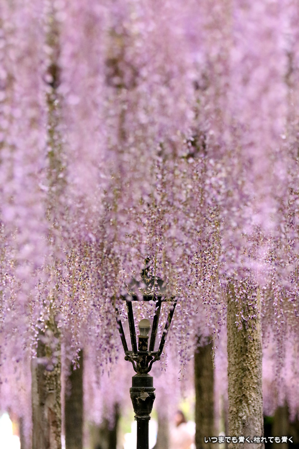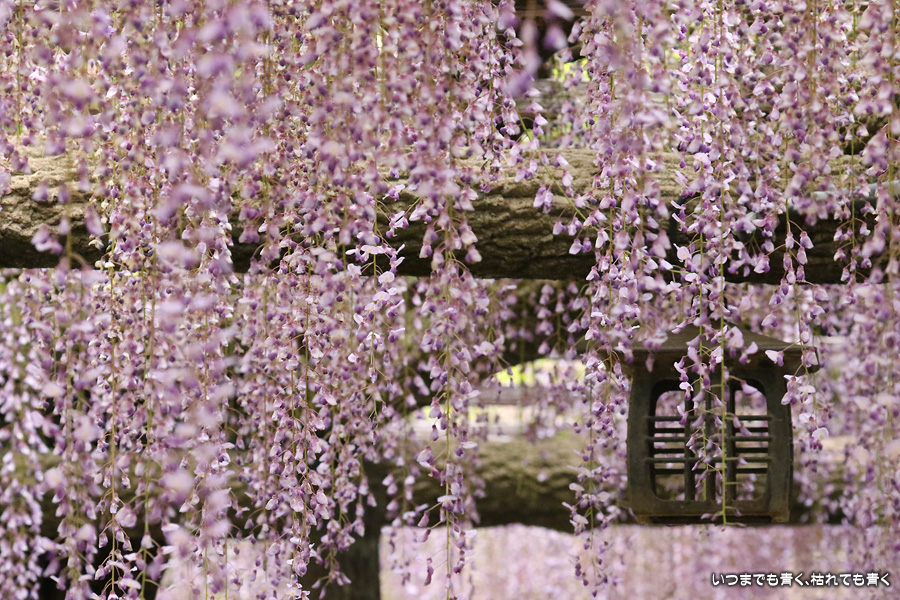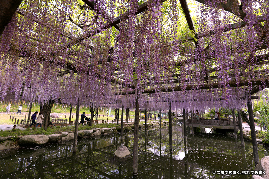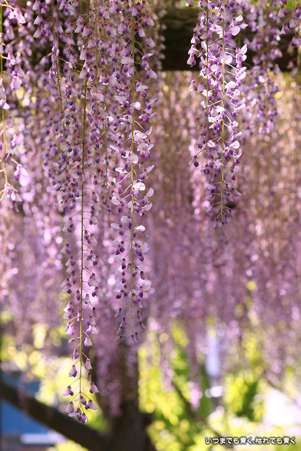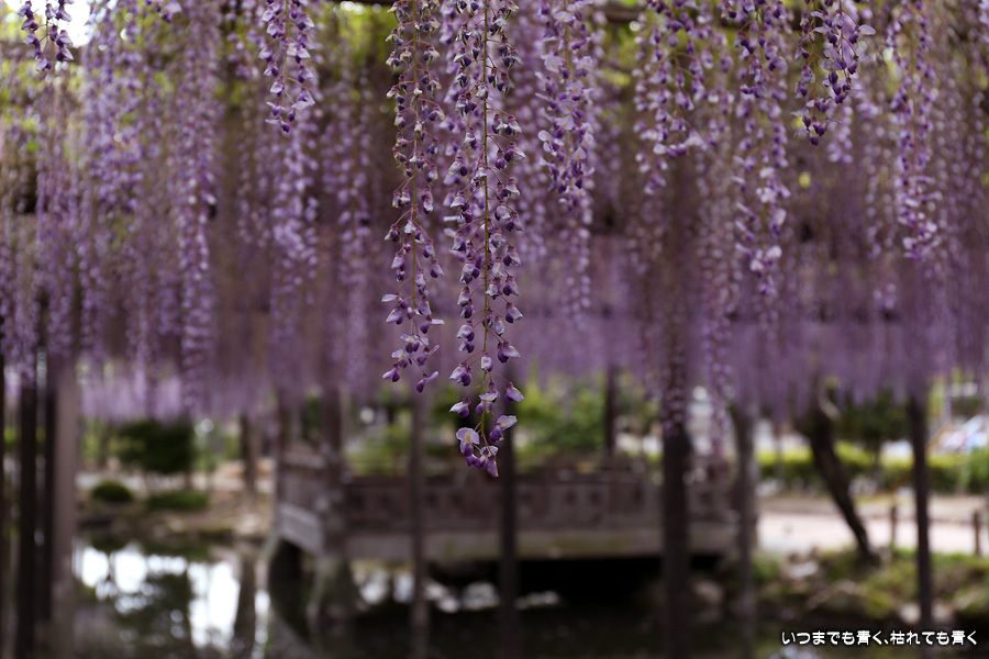 今回は2度目の訪問で、初めて来た時は雨でしたので日の差す状況での撮影は初めてになります。結果的にはあまりうまく撮影できませんでした。藤棚が立派すぎて周りの明るさに比べて藤棚の下は光が不足して色合いがイマイチです。ホワイトバランスの設定ミスもありますし、RAWデータではなくJPEGのみで保存していたのもミスでした。ホワイトバランスが適切でなかったとしてもRAWデータがあれば現像でなんとでもなったのにと悔やまれます。そういう状況なのでPhotoshopで色合いを調整しましたが、藤の花の色は微妙で、調整しているとどの色調が正しいのかわからなくなってしまいます。という言い訳ばかりの写真ですが、なんとか見ることができる形にはしました。藤の花自体はちょうど見ごろで藤棚が立派で見ごたえがあってとても素晴らしいです。写真など撮らずにのんびりと散策して楽しむのがいいと思います。