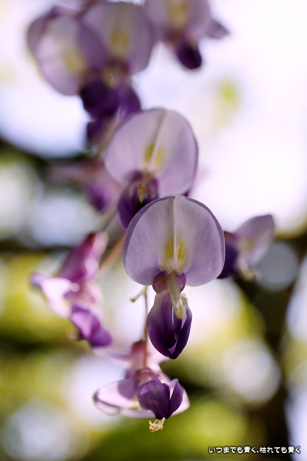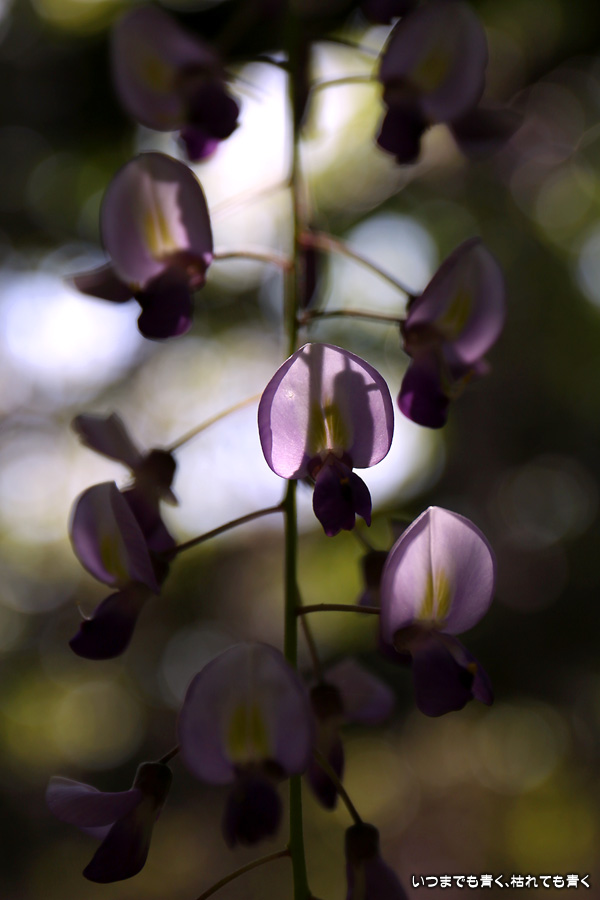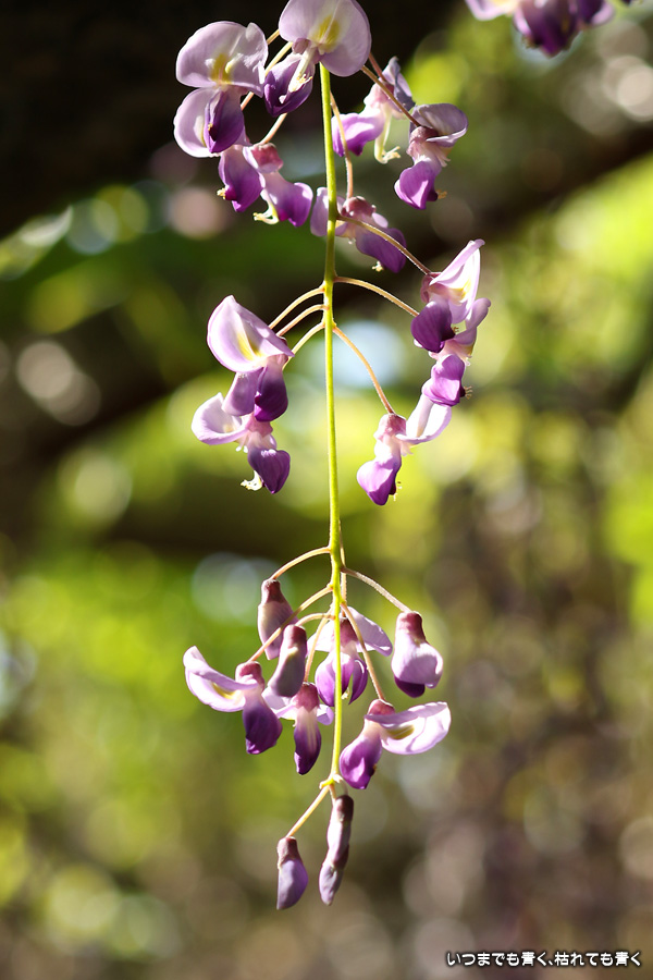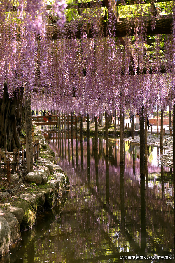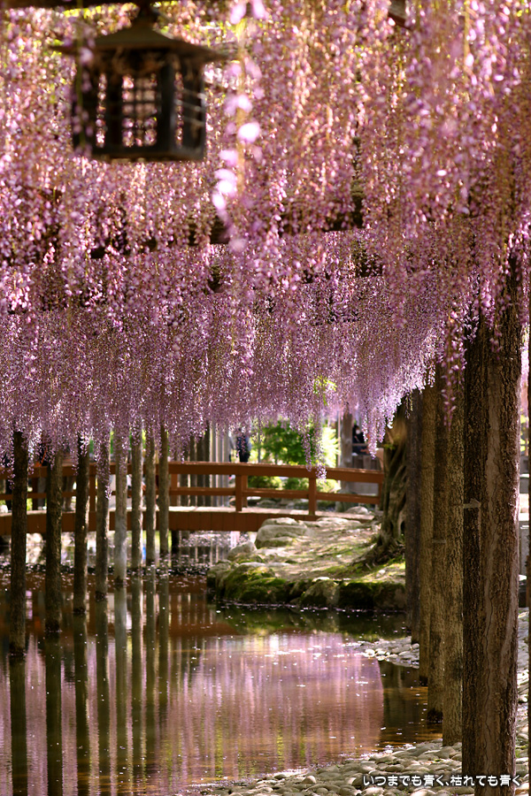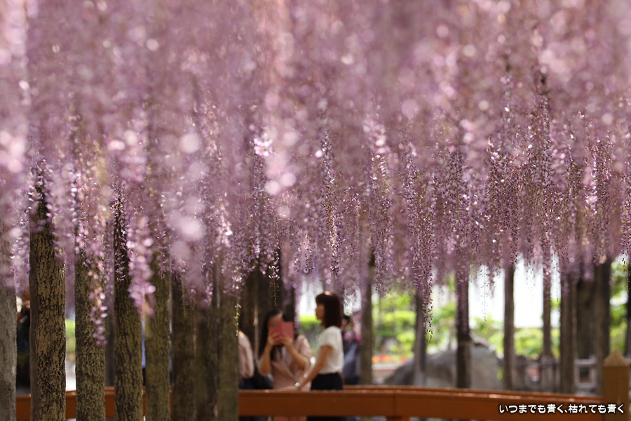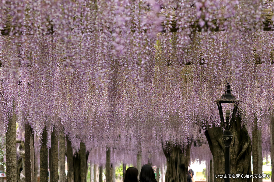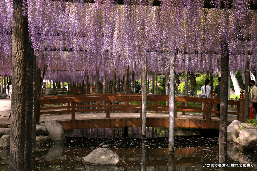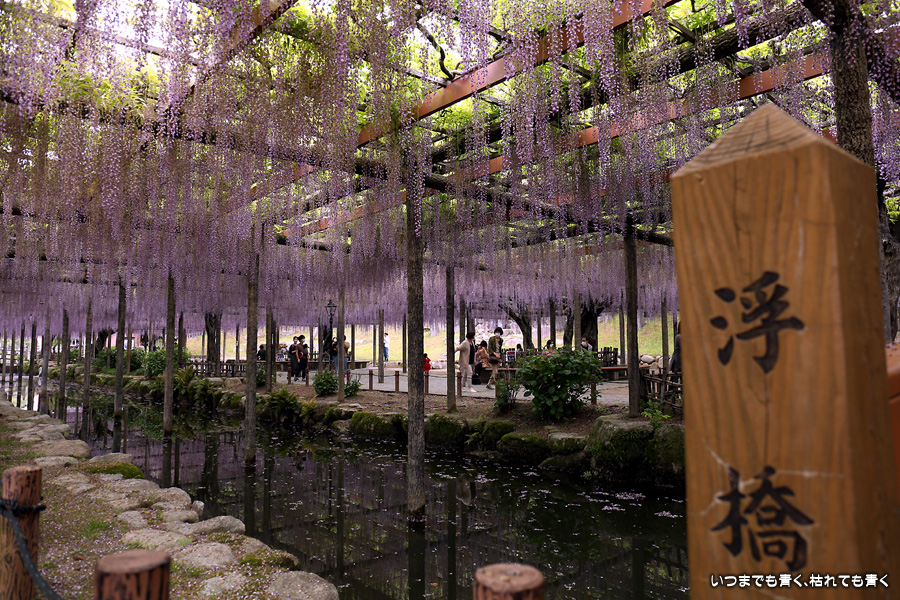 今回は2度目の訪問で、初めて来た時は雨でしたので日の差す状況での撮影は初めてになります。結果的にはあまりうまく撮影できませんでした。藤棚が立派すぎて周りの明るさに比べて藤棚の下は光が不足して色合いがイマイチです。ホワイトバランスの設定ミスもありますし、RAWデータではなくJPEGのみで保存していたのもミスでした。ホワイトバランスが適切でなかったとしてもRAWデータがあれば現像でなんとでもなったのにと悔やまれます。そういう状況なのでPhotoshopで色合いを調整しましたが、藤の花の色は微妙で、調整しているとどの色調が正しいのかわからなくなってしまいます。という言い訳ばかりの写真ですが、なんとか見ることができる形にはしました。藤の花自体はちょうど見ごろで藤棚が立派で見ごたえがあってとても素晴らしいです。写真など撮らずにのんびりと散策して楽しむのがいいと思います。