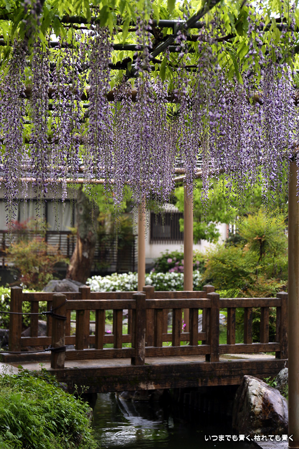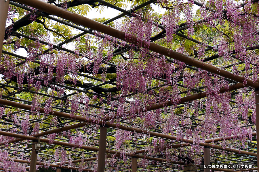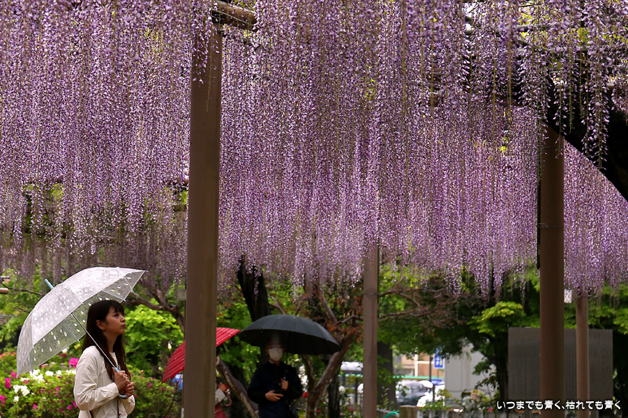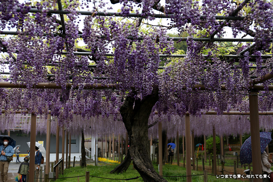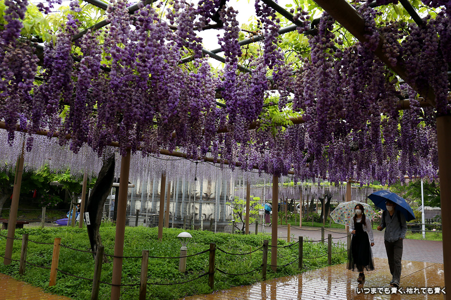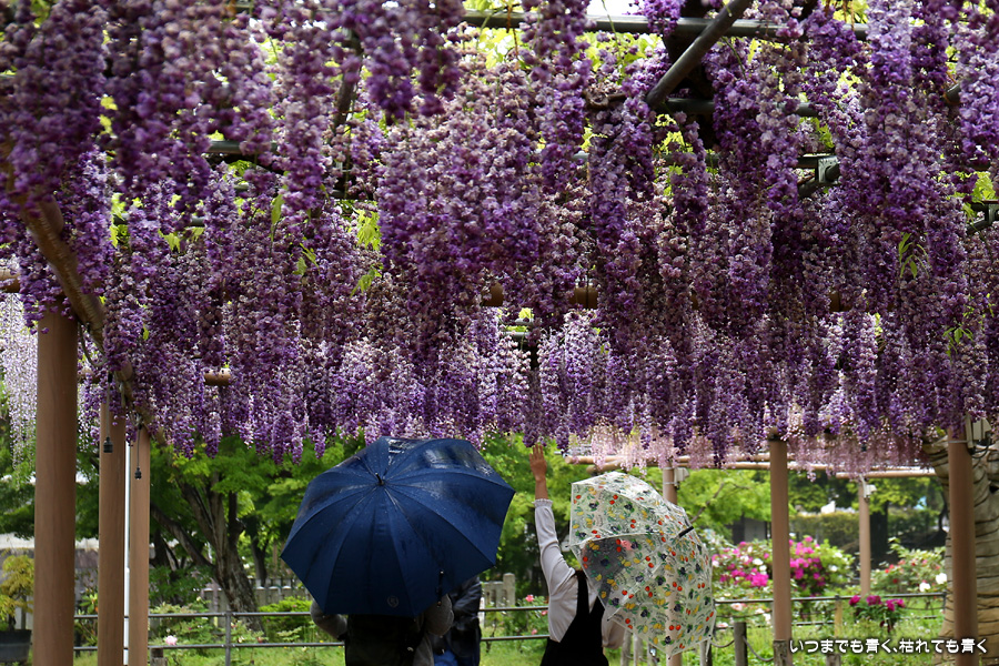 「曼陀羅寺公園」のふじは有名で今週末が見頃だと聞いたので、雨降る日でしたが行ってきました。曼陀羅寺は初めてですが、境内に曼陀羅寺公園があって、公園内の藤棚の面積は4,700uと紹介されています。ふじの種類も多くて、いろんなふじを楽しむことができます。写真撮影は、ふじの花自体は雨が似合う花ですが、カメラが雨で濡れてしまうために傘をさして立ったままの撮影が多くて、変化をつけた写真の撮影は難しい状況でした。