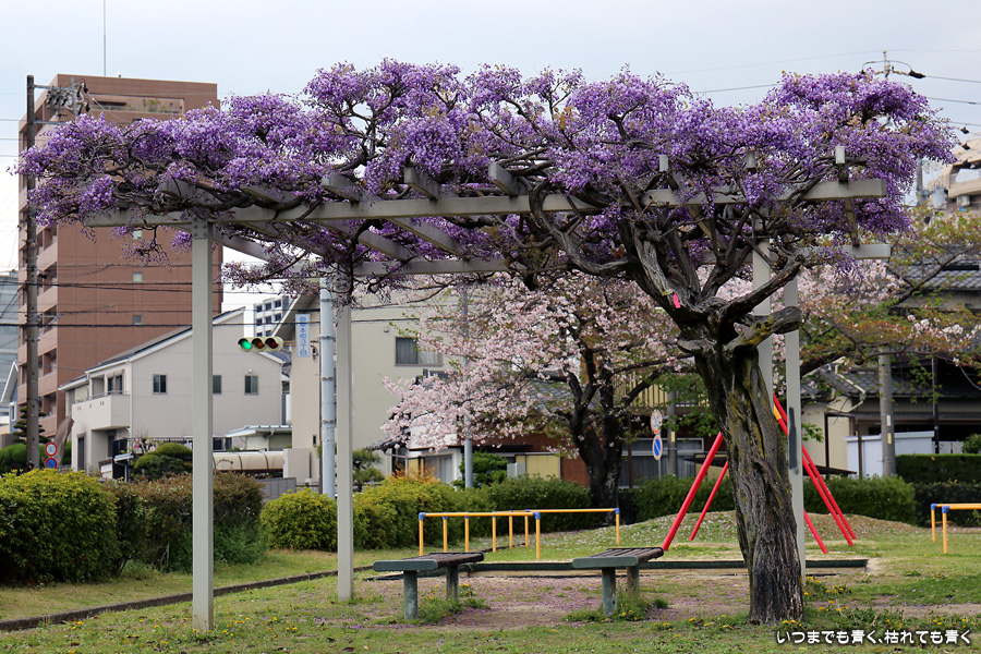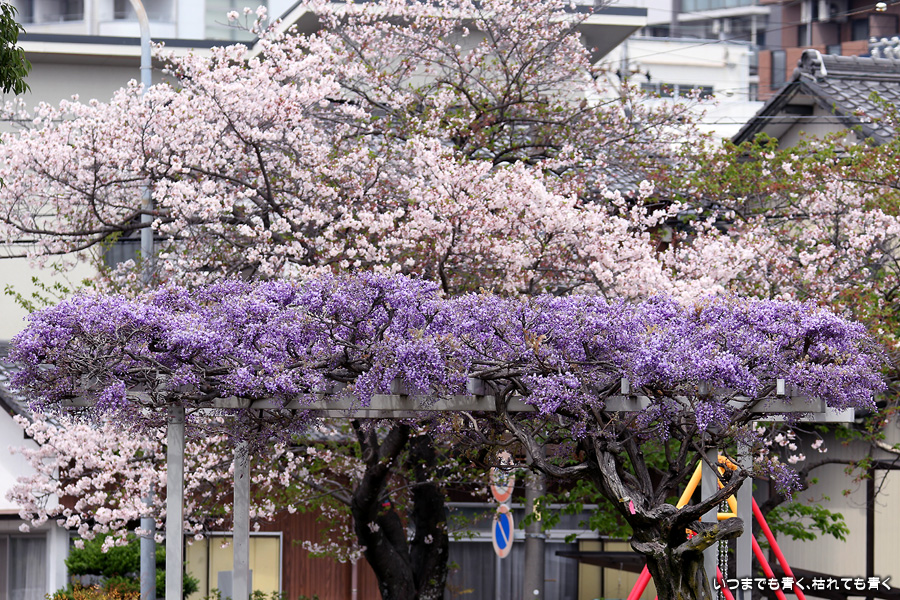 宗心洞公園は住宅街の普通の公園ですが、奥さんが藤が咲いていると教えてくれたので、カメラを持って行ってきました。住宅街なので絵になる景色ではありませんが、桜と藤というのは珍しい光景でした。