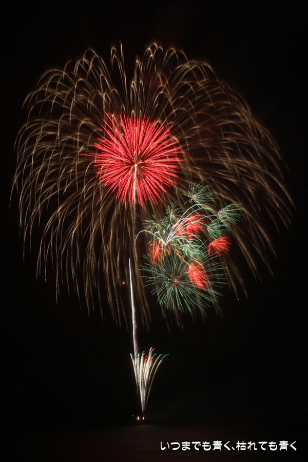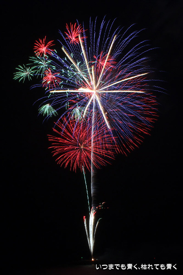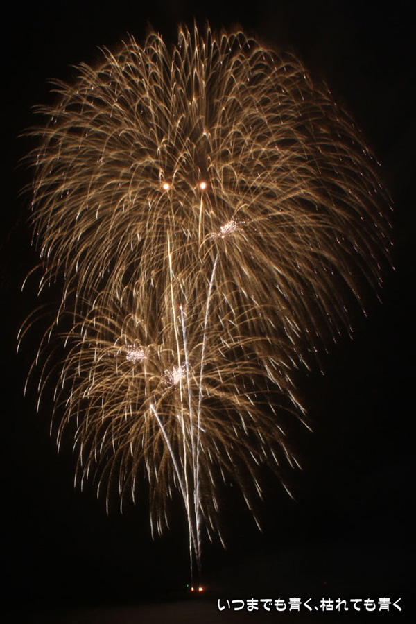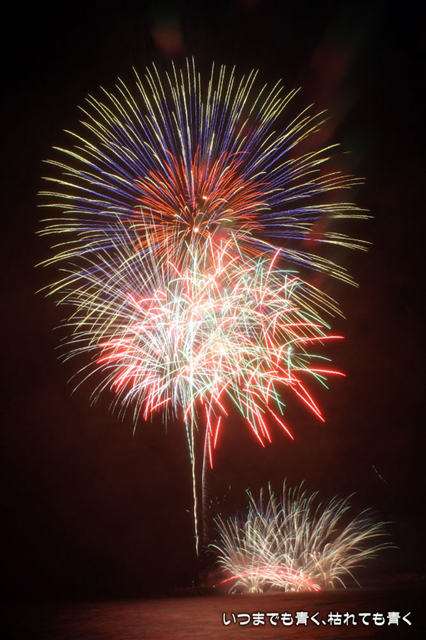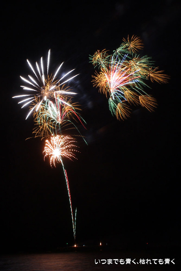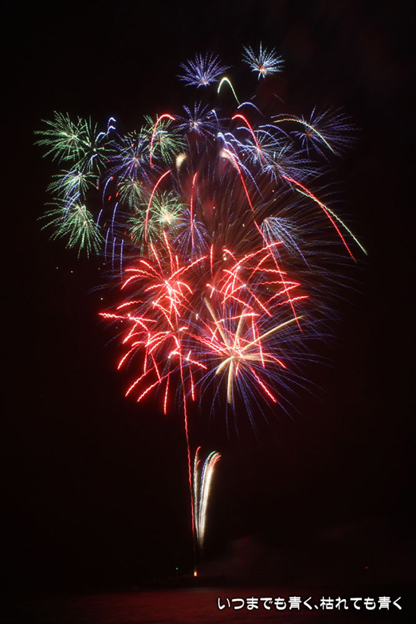 今年は昨年とは違って打ち上げ場所からかなり離れたところの海岸でタクシーを降ろされてしまい、海岸線をかなり歩く羽目になりました。それでも打ち上げ場所にあまり近づくことはできず、しかも湿気のある風が強く吹いていて、三脚は揺れるしレンズがすぐにベトベトになってしまうしで、まともに見ることができる写真はほんの一部しかありませんでした。特に風の影響は、花火の形もゆがめてしまいますし、微妙なカメラの揺れが花火の軌跡をミミズがはった跡のように乱します。なので掲載するのを迷っていたのですが、昨年の「サザンビーチちがさき花火大会」の写真よりは進歩はありそうかもと思い直して記録の意味も兼ねて掲載しておくことにしました。
