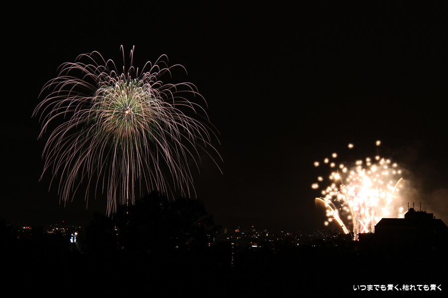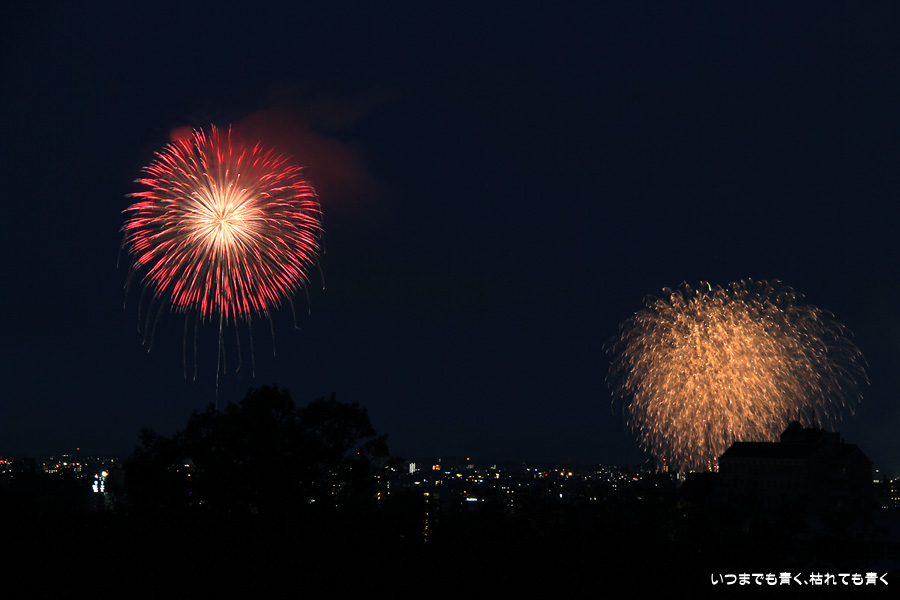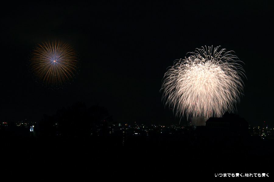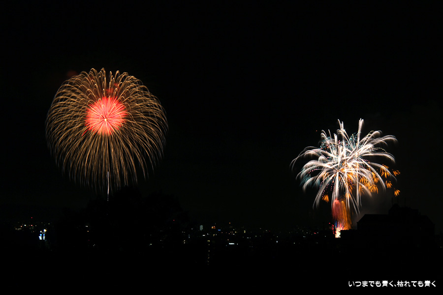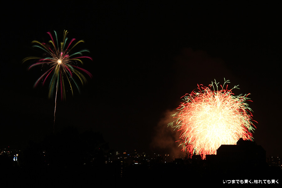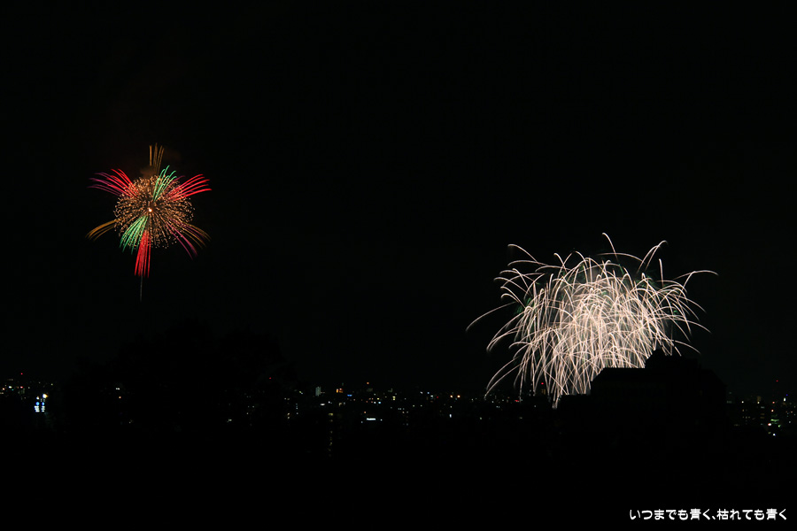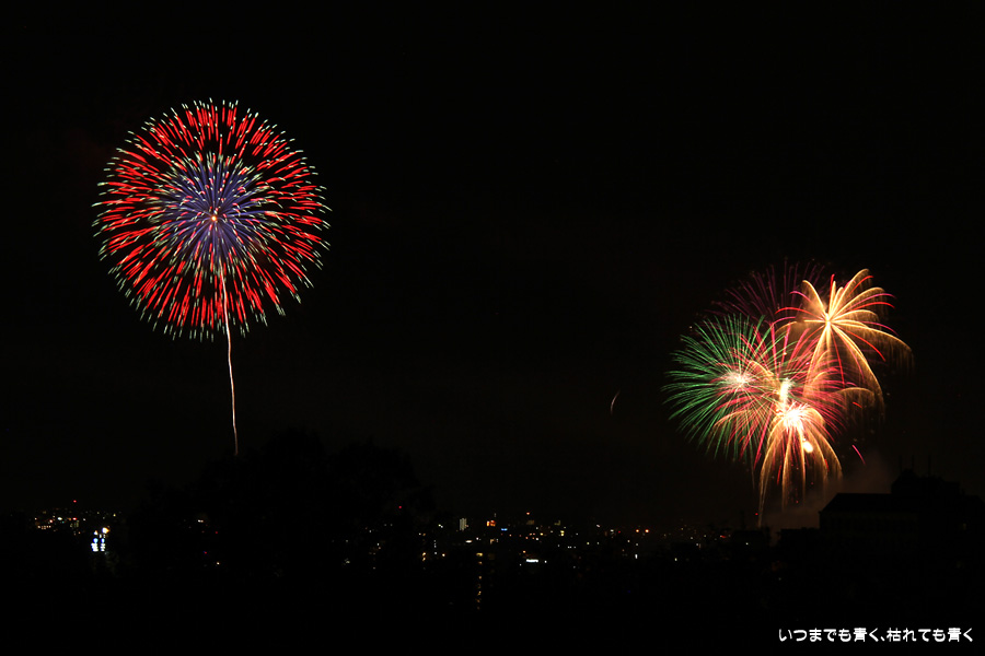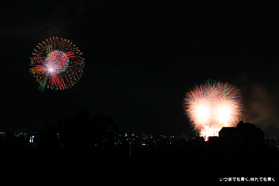 初めての岡崎の花火大会の撮影で、どこから狙うのが良いのかわからず、混雑に巻き込まれないように岡崎市東公園の志賀重昂像のある高台から狙ってみました。乙川河畔と矢作川河畔の二本立て花火ですが、それぞれ木と建物がちょうど邪魔になってしまったのと、かなり距離がありすぎて全体的にぼやっとした絵になってしまいました。岡崎東公園は、花火撮影には適した場所では無いようです。