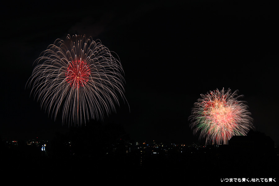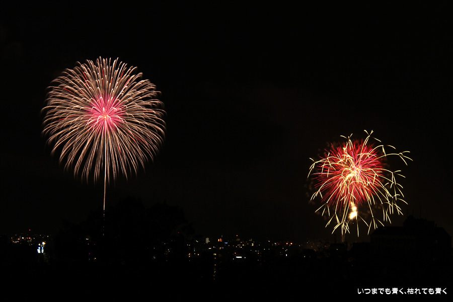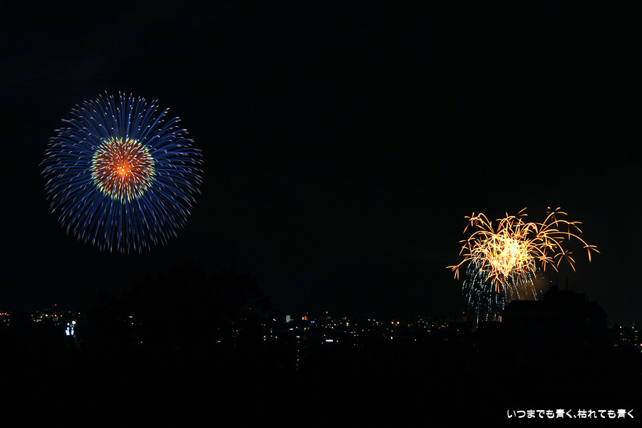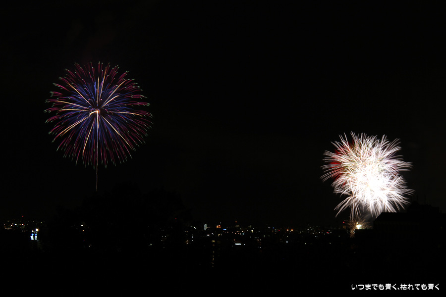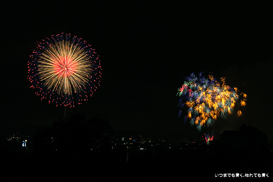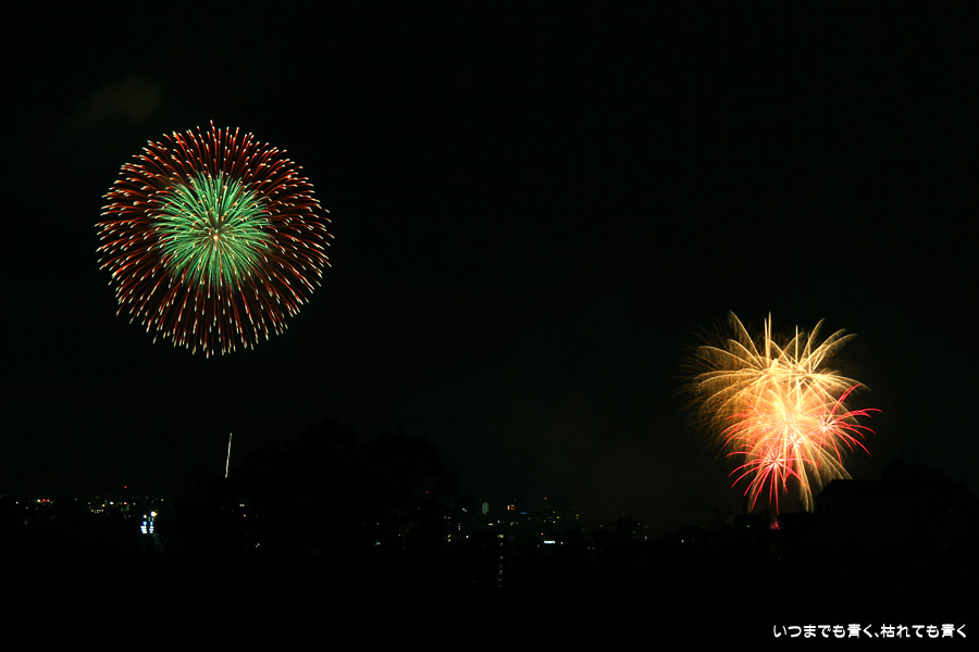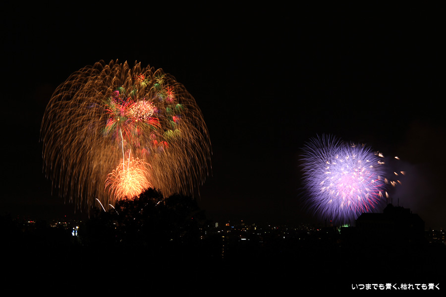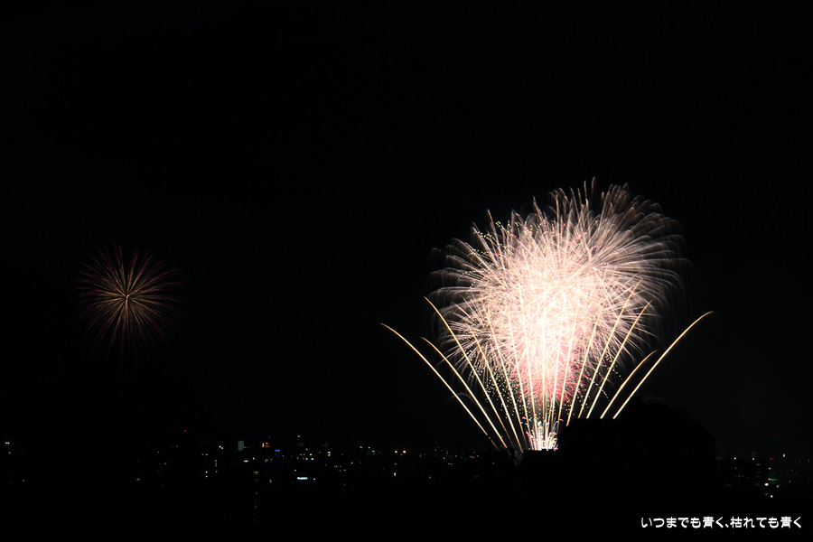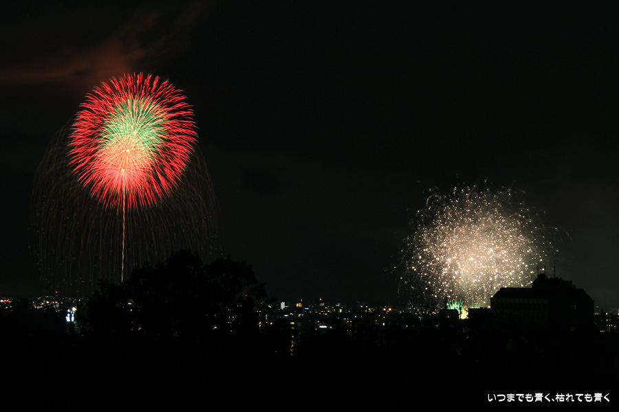 初めての岡崎の花火大会の撮影で、どこから狙うのが良いのかわからず、混雑に巻き込まれないように岡崎市東公園の志賀重昂像のある高台から狙ってみました。乙川河畔と矢作川河畔の二本立て花火ですが、それぞれ木と建物がちょうど邪魔になってしまったのと、かなり距離がありすぎて全体的にぼやっとした絵になってしまいました。岡崎東公園は、花火撮影には適した場所では無いようです。