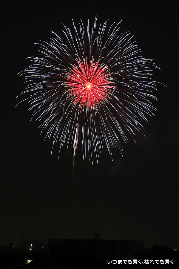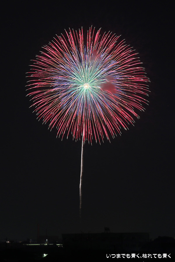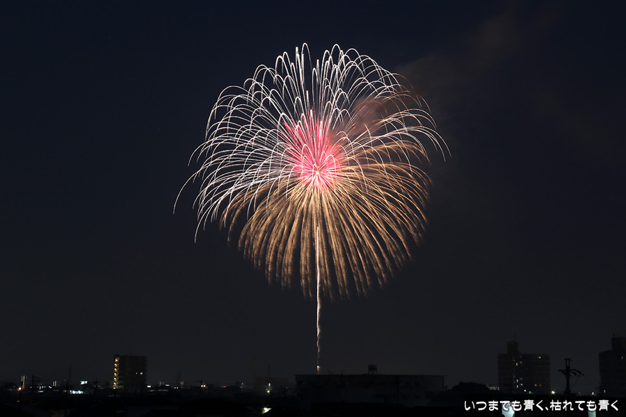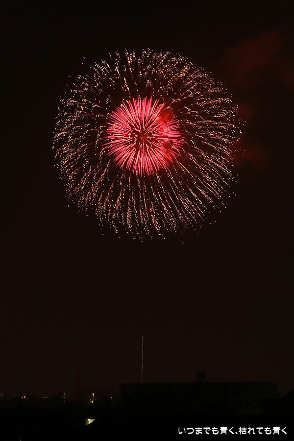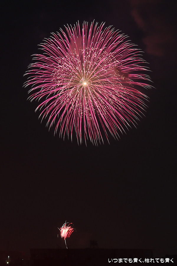 岡崎の花火は昨年初めて東公園から撮影したのですが、ちょっと遠すぎたので今年はもう少し近くでと思って矢作川西側堤防道路の国道1号線矢作橋と県道56号線日名橋のちょうど中間のあたりの場所を選びました。花火が上がってみると、これが大失敗。矢作川の打ち上げ場所と乙川の打ち上げ場所と撮影地点が正三角形に近い関係になっていて、両方の花火を一緒に入れての撮影がまったく絵になりませんでした。それぞれの花火は単調なので、競演させないと迫力がでません。そして堤防は人があふれ片側の撮影はどうしても人が入ってしまいます。満月に近い夜も空が明るくてダメですね。来年は両方が並んで見える地点(西側か東側?)を探したいと思います。途中から飽きてしまい、金曜日にブルームーン満月だった月と花火と二重露光させて、存在しない場所に月を写し込んだ写真を撮ってみたりして遊んでいました。