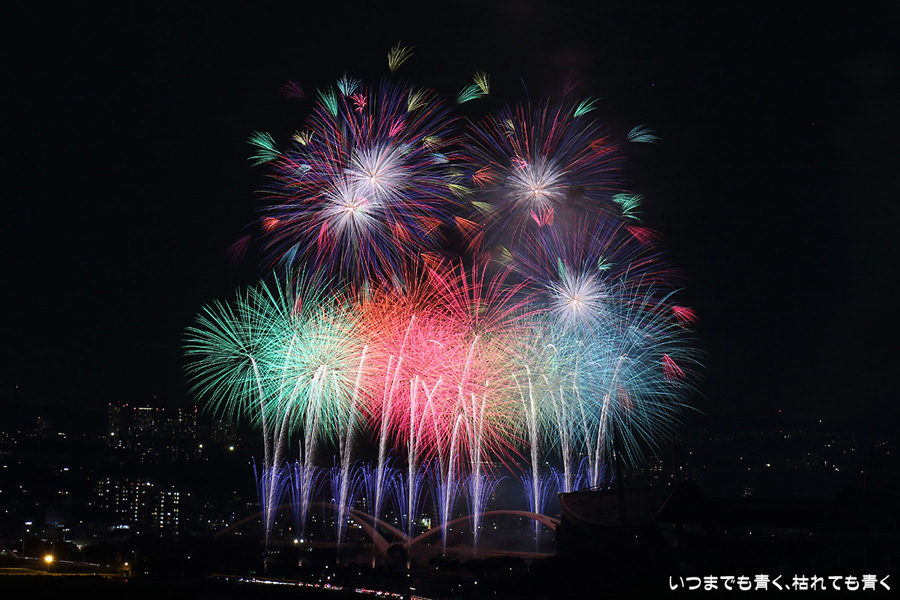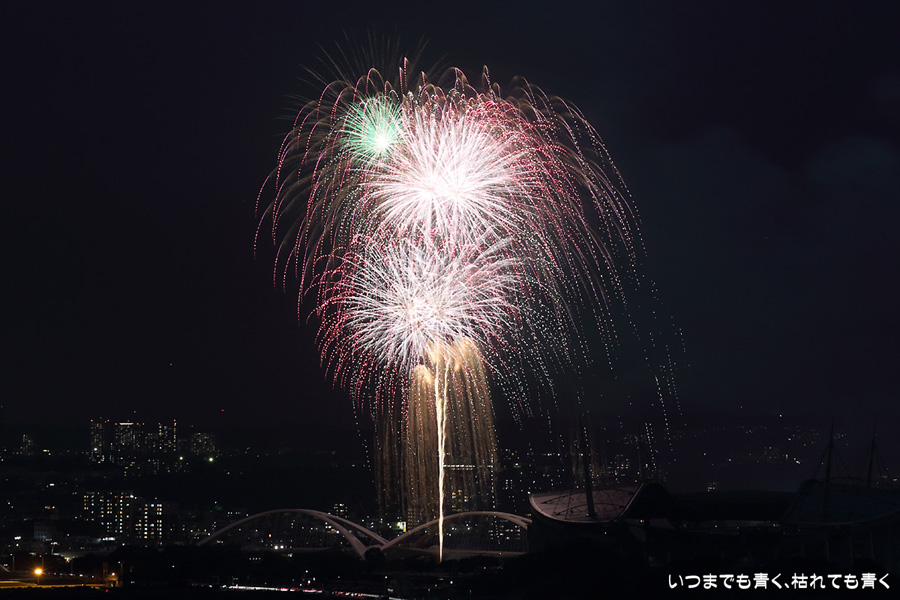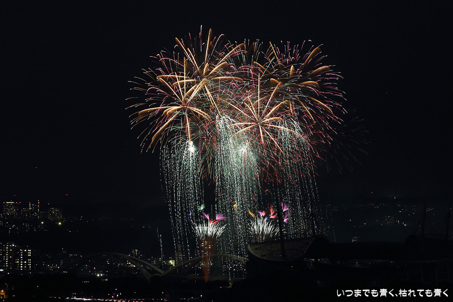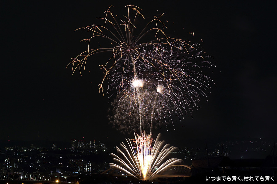 などあたらめて難しさを痛感しました。そんな状態でしたので、今回は面白い写真が少なかったように思います。花火自体も年々豪快さが乏しくなってきている感じもします。また、ここ3年は同じ場所からの撮影なので同じような写真ばかりになってきました。来年は撮影場所を変えたほうが良いかもしれませんが、他に良い場所を探すのも大変そうです。なお、重量級の望遠レンズで撮影した写真は三脚が耐え切れず、カメラが微妙に揺れて花火の軌跡が波打ってしまっているものがあります。細部には目を瞑ってご覧ください。