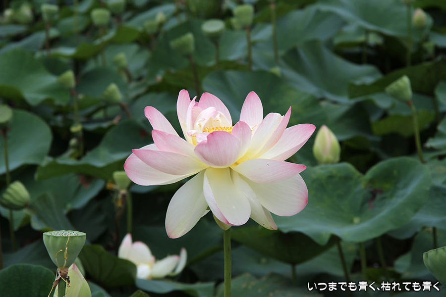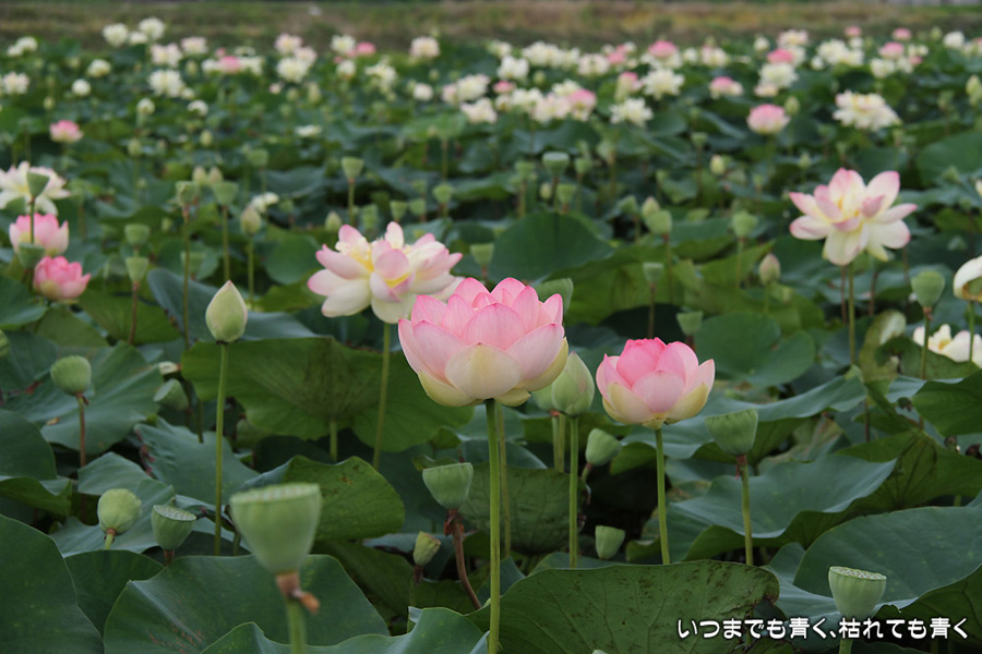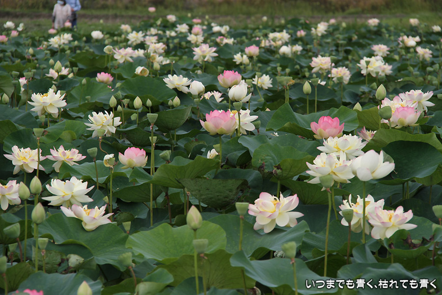 家から車で10分ほどの場所にある蓮田です。昨年は7月22日に見に行って見頃が過ぎていましたので、今年は早めに見に行こうと思って、今日の昼前に行ってきました。すでに花托だけになっているものもありましたが、まだまだ数多く咲いていて、ここしばらくは見頃の時期が続きそうです。