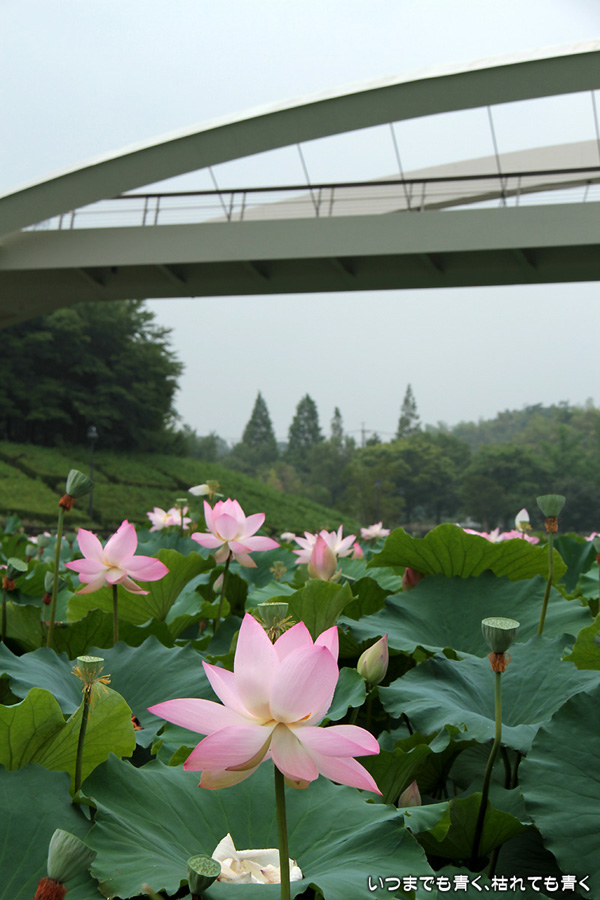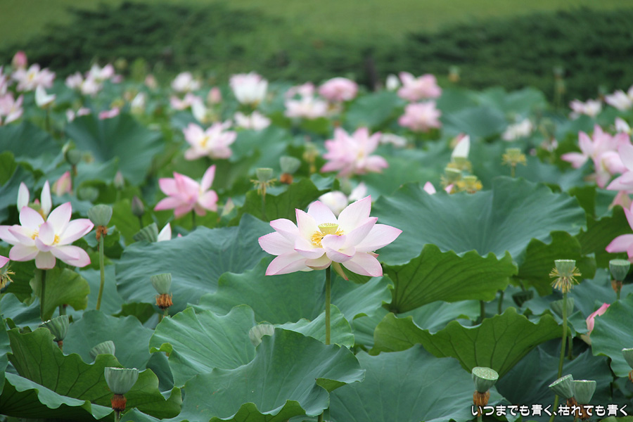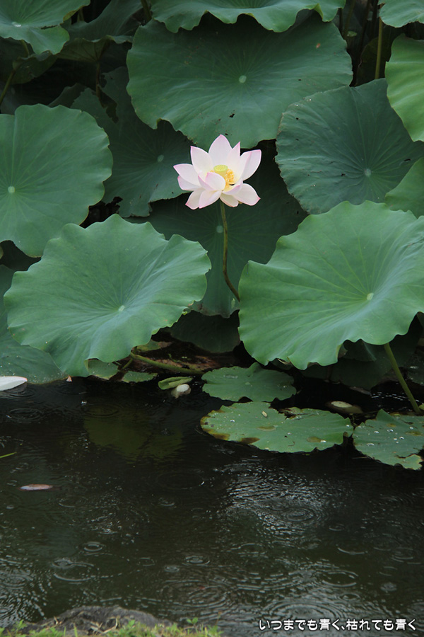 自宅から20kmほどのところにある「あいち健康の森公園」の蓮の花を見に行ってきました。「あいち健康の森公園」は初めてですが、いろんな花が楽しめる公園のようです。蓮は朝が勝負!ということでせっかく早起きして出かけたのに、着いたら本降りの雨。どうなることかと思いましたが、蓮を見ていた2時間ほどだけ運よく雨がやみ、なんとか雨を気にせずに楽しむことができました。時期的にはやや遅かったという感じでしたが、淡いピンクの花がとても美しかったです。