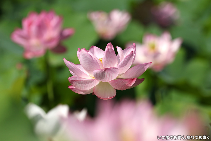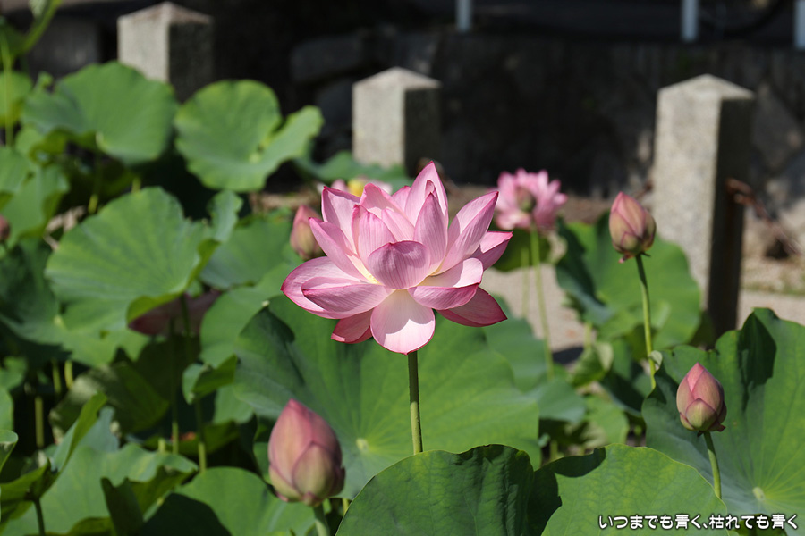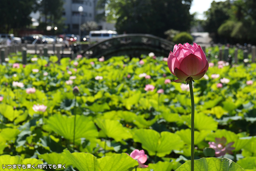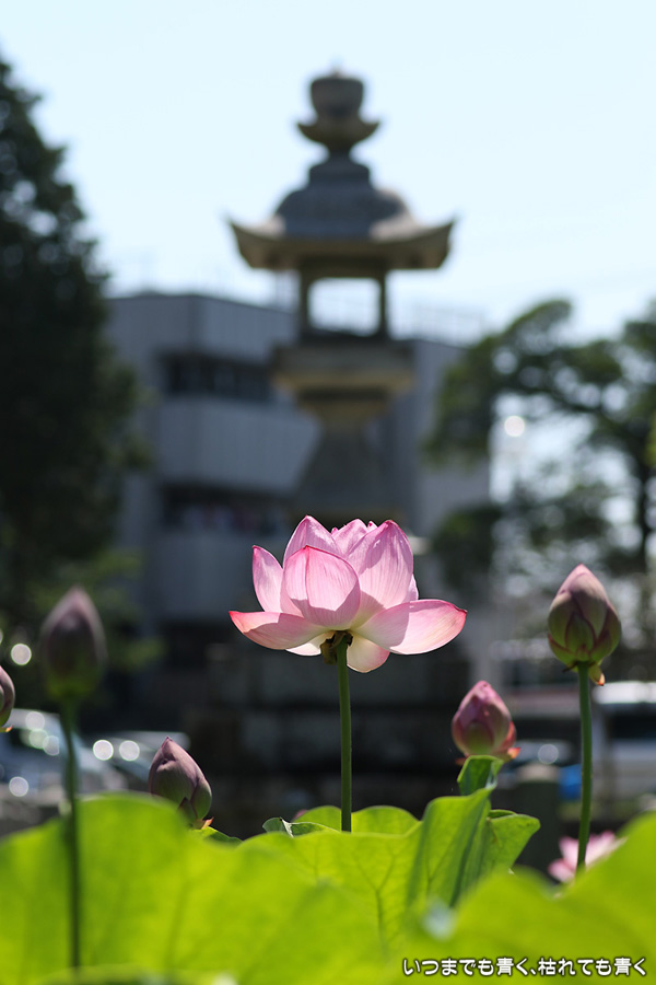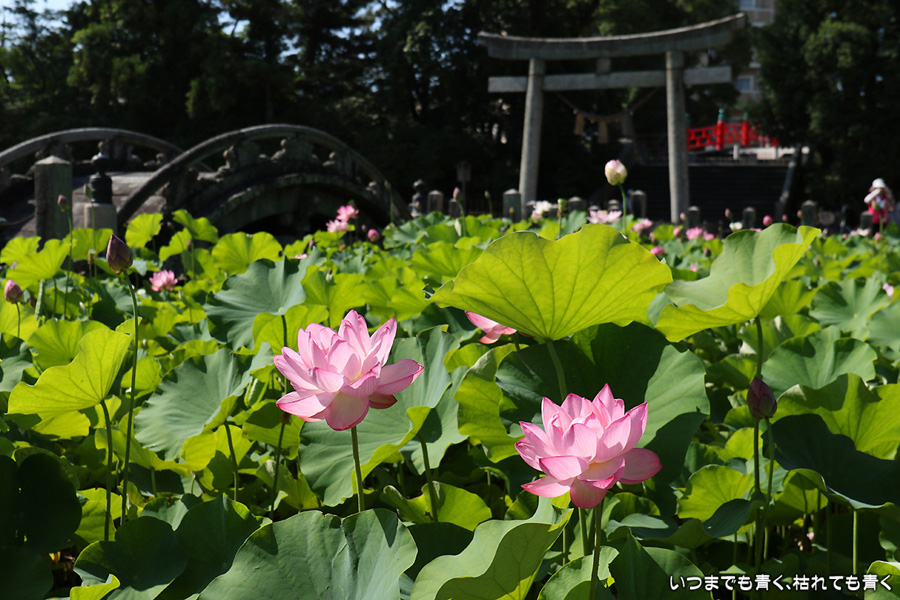 先週は時期が早かったのと昼時で時間的によくなかったので、今日は朝早く来てみました。今日はとてもきれいに咲いていました。神社には蓮池、お寺には蓮の鉢植えがよく似合います。