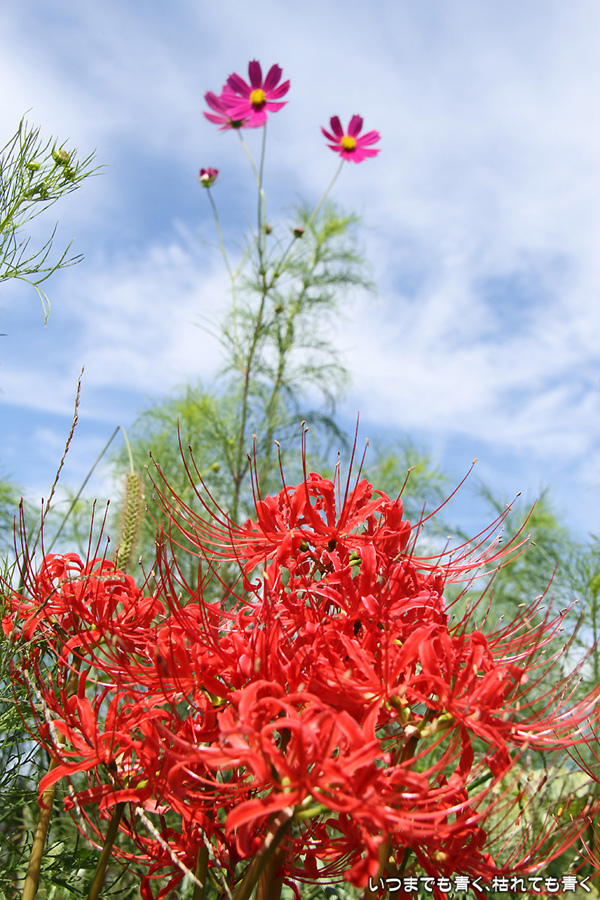 曇り空の昨日と違い今日は快晴だったので、今日も逢妻女川の彼岸花を見に行ってきました。青い空と真っ赤な彼岸花、よく似合います。
