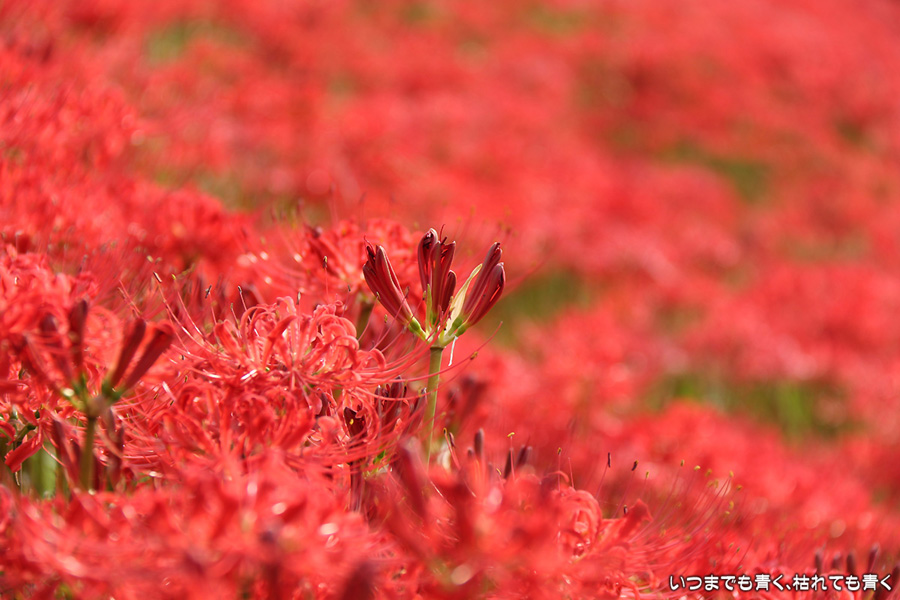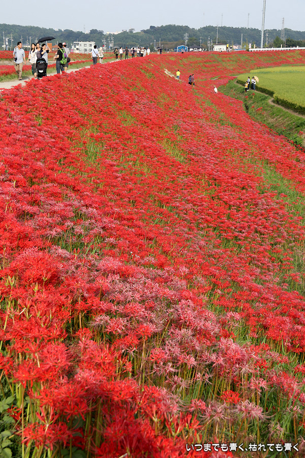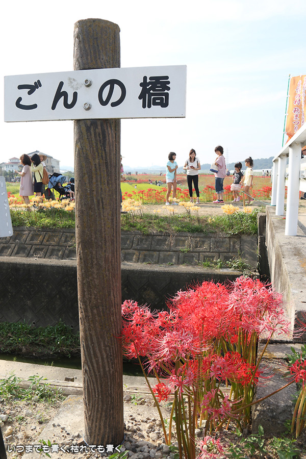 初めて半田市の矢勝川の彼岸花を見てきました。イチゴ狩りのマリモファームさんの臨時駐車場にクルマを止めて、矢勝川の彼岸花西端から東に向かって川の南側堤の道を歩き、戻りは川の北側堤の道を戻ってくるというルートで散策しました。豊田市の逢妻女川の彼岸花とはまったく規模が違いますね。逢妻女川の彼岸花は、群生の中に入るマナーの悪い人たちが目につくようになり、今年は行く気が失せていたのですが、矢勝川の彼岸花を見てしまうとこれからは毎年ここに来てしまいそうです。ここでも、彼岸花の群生にはいったり、コスモスの花畑の中に入り込んで写真を撮っている人がいないわけではないのですけど、逢妻女川のように踏み倒すということは無いようです。このあたりは童話作家の新美南吉の里で、矢勝川は、童話「ごんぎつね」で兵十が魚を獲っていてごんがうなぎを盗んだ川です。ごんの橋やごんぎつね注意の交通標識があったりして思わずごんの悲しい最後を思い出してしまいます。近くには新美南吉記念館があるのですが、今回は行くことができませんでしたのでまたあらためて来てみたいと思います。矢勝川の彼岸花咲く川岸は、西端の弘法橋から東端の高田橋まで片道約2kmもあるそうです。往復で4kmにもなり、14時頃から見始めたのですが、写真を撮りながらのんびりと歩いていたら駐車場に戻ってきたのは17時目前でした。でも、さわやかな風が流れ、汗だくになることもなく気持ち良く良い運動ができたかなと思います。暑い八月の夏からたった一ヶ月。こうして彼岸花が咲き、ススキが揺れて稲穂が実る、もう完全に秋ですね。紅葉がもうすぐです。