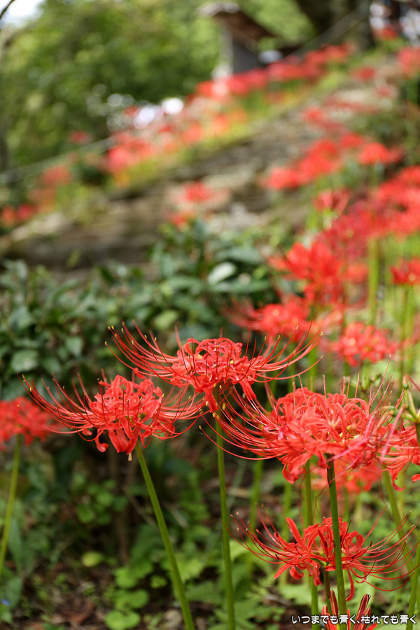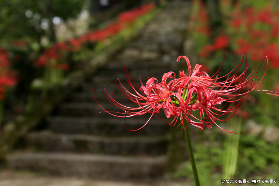 長い200段の石段も、彼岸花を見ながらならばあっという間で苦になりませんでした。5年前に鹿と猪の被害を受けて彼岸花の数が激減し、現在は県、市、ボランティアの方々の力によって植栽されているそうですが、維持はなかなか難しいようです。春は千年桜も有名です。