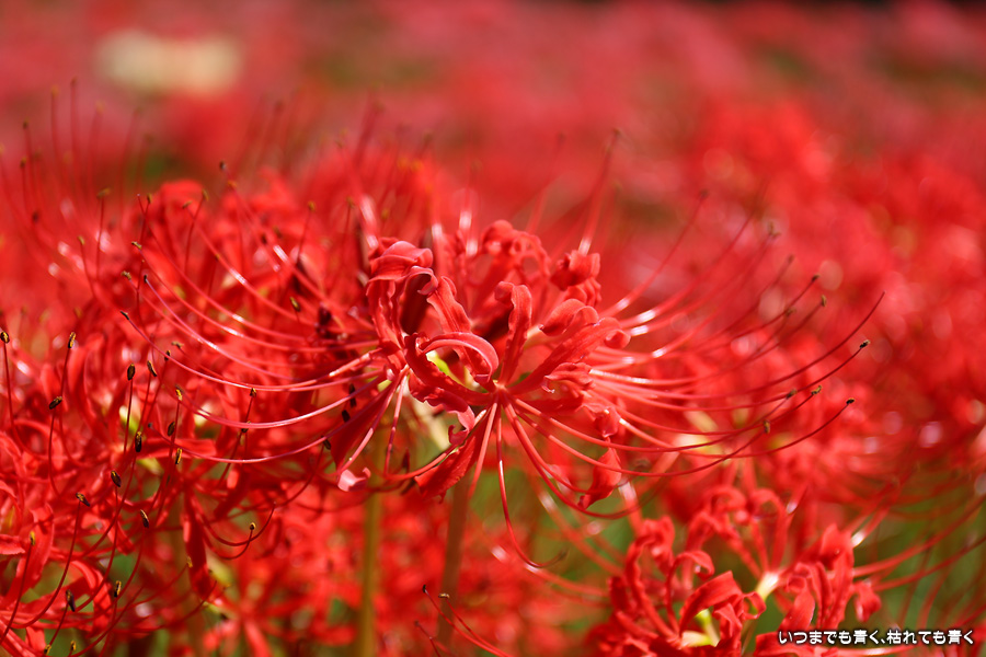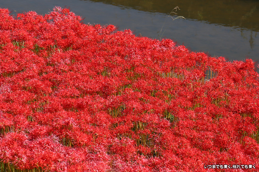 今年の彼岸花は暑さのせいで咲きがよくないのかなと思ってあきらめていましたが、天気が良くて気持ちの良い風が吹いていましたので、もういちど近くの逢妻女川の彼岸花を見に行ってきました。一週間前の9月25日に訪れた時は、斜面にはまったく彼岸花が無かったのですが、一週間後の今日は、斜面も含めてきれいな赤い絨毯になっていました。早く咲いた花は日に焼けたように白っぽくなっていましたが、それを補うように新しい真っ赤な彼岸花がたくさん咲いていました。来るのを迷いましたが来てみて良かったと思います。風も涼しく、ようやく秋の気配が漂ってきました。