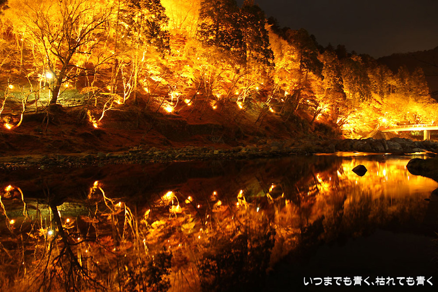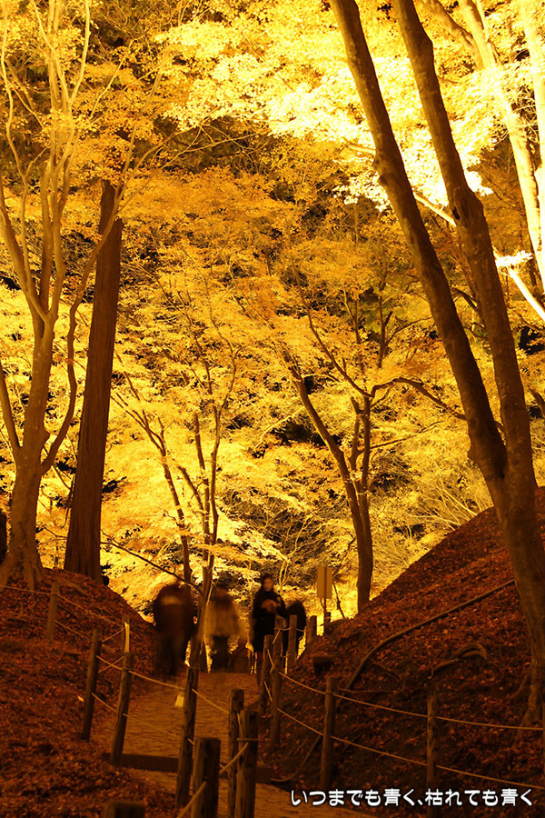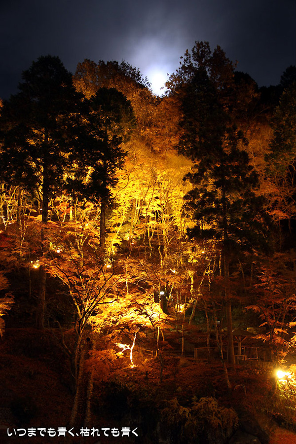 11月28日に仕事帰りにひとりで香嵐渓に行った時の写真を家族が見て「ぜひ行きたい!」というので、今日、仕事を早く切り上げて再び香嵐渓の紅葉ライトアップに行ってきました。今回は、標高254mの飯盛山にも登ってきました。けっこうきつかったですが、山頂で撮った、ライトアップを背景にした家族写真はとてもきれいに撮れました。ただ、ストロボ+スローシャッターでの撮影だったため、ストロボ発光のあと少し動いてしまったところは、背後のライトアップと人物が重なり面白い雰囲気の写真となりました。残念ながらその家族写真は掲載しておりませんが、途中で撮影した奥さんと娘たちの写真は一枚掲載しました。