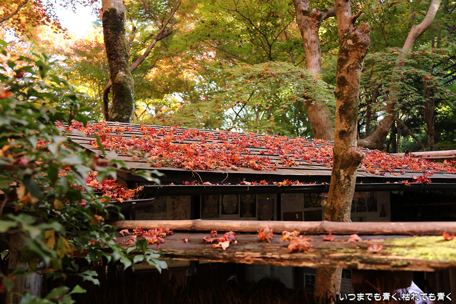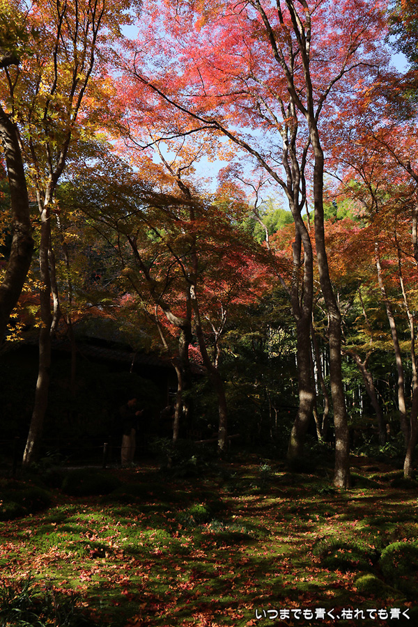 祇王寺は、何度来ても落ち着く、わびしさのただよう平家物語ゆかりのお寺です。ここはまだ青い葉もあり、落葉も含めてこれからが見ごろのようです。