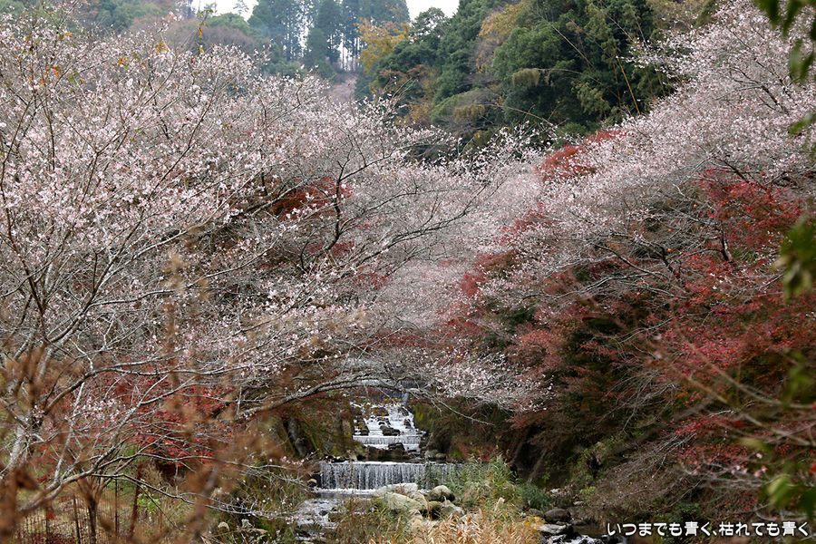 2015年11月23日に撮影した、愛知県豊田市・川見四季桜の里の四季桜と紅葉の写真です。
