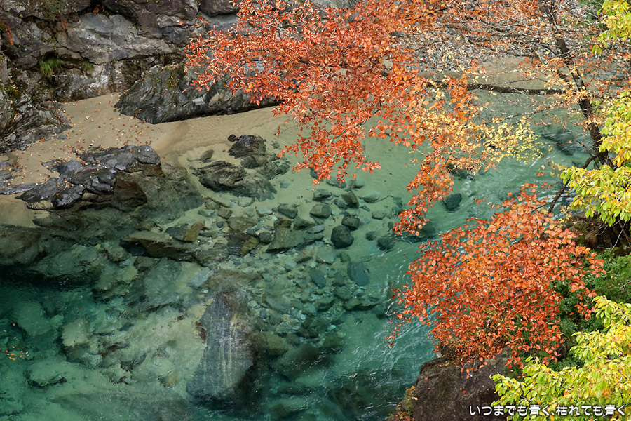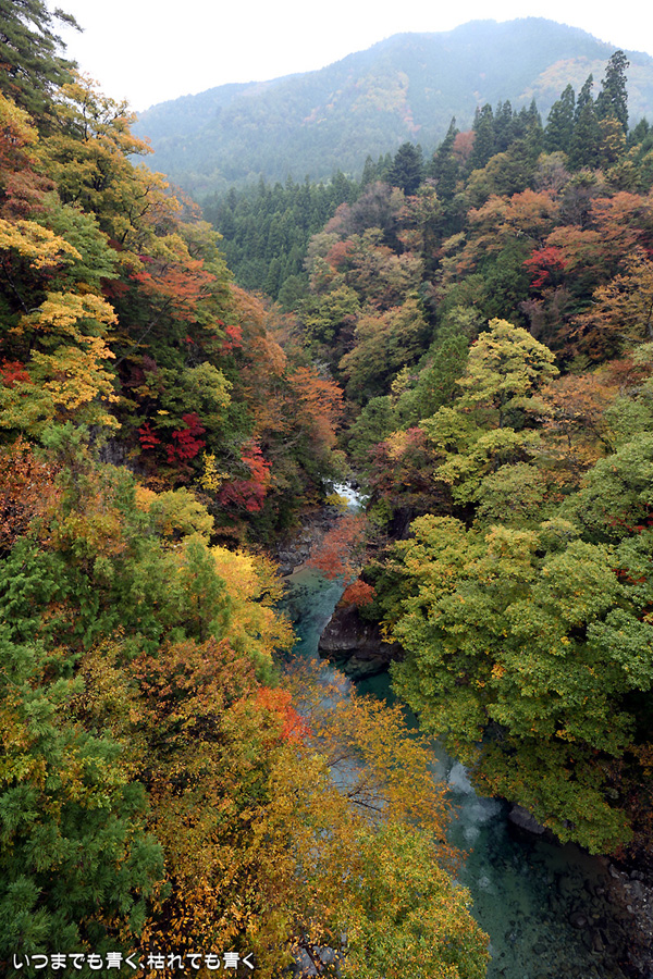 今年の最初の紅葉狩りは岐阜の山奥へ向いました。最初は付知峡です。家を出るときは日が出ていたのに、付知峡は雨。久しぶりの晴れた休日だったのに、あえて雨降る場所に行くことになってしまいました。紅葉よりもコバルトブルーの川が美しくて、そちらに見入ってしまいました。