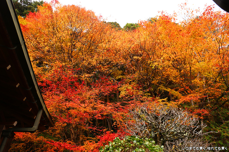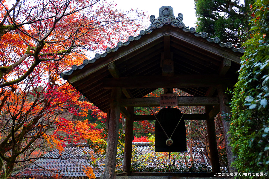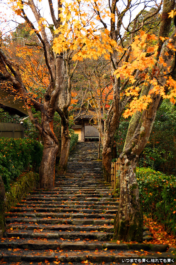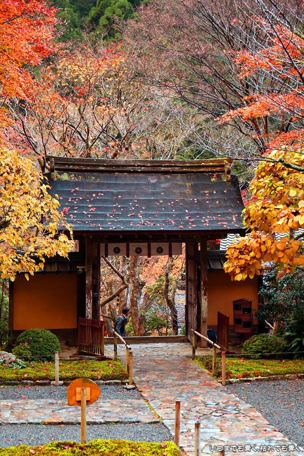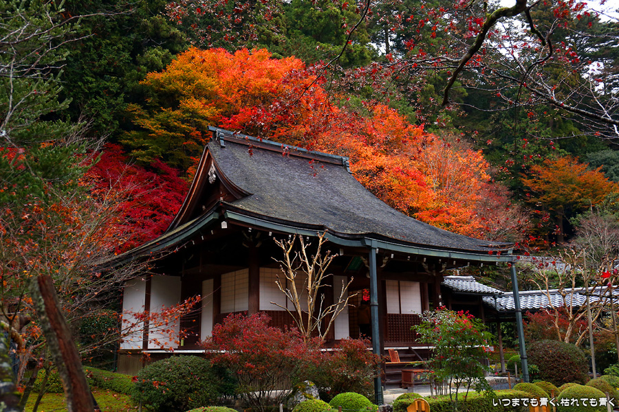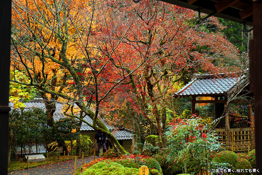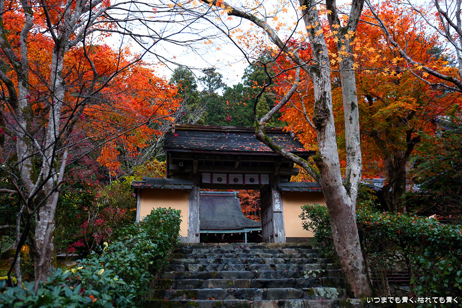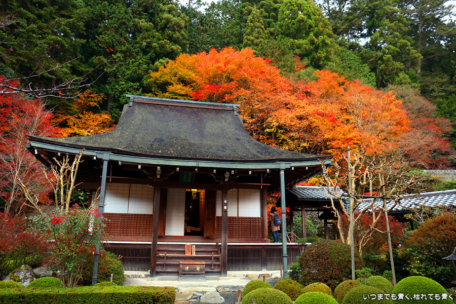 寂光院は平家物語にも登場するところで、平清盛息女の建礼門院のお寺でもあります。落ち着いた風合いの黄色や朱色の紅葉が、人少なく落ち着いた風情によく似合っています。本堂は2000年に放火により焼失し、忠実に再建したものだそうです。