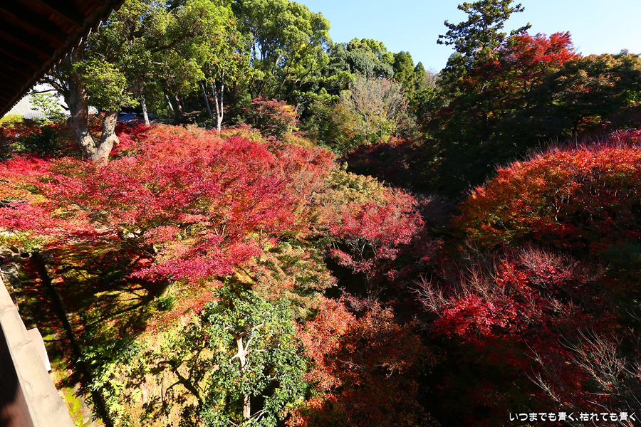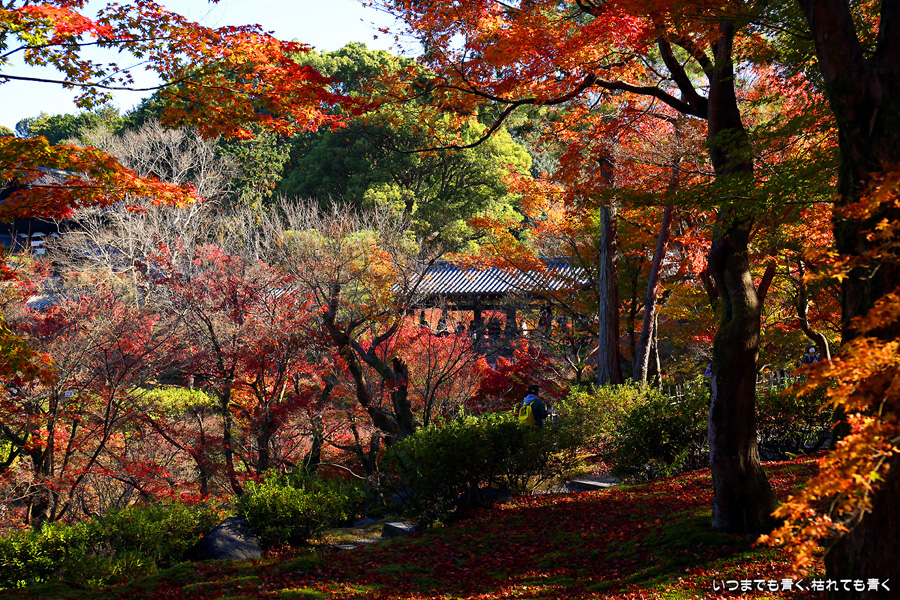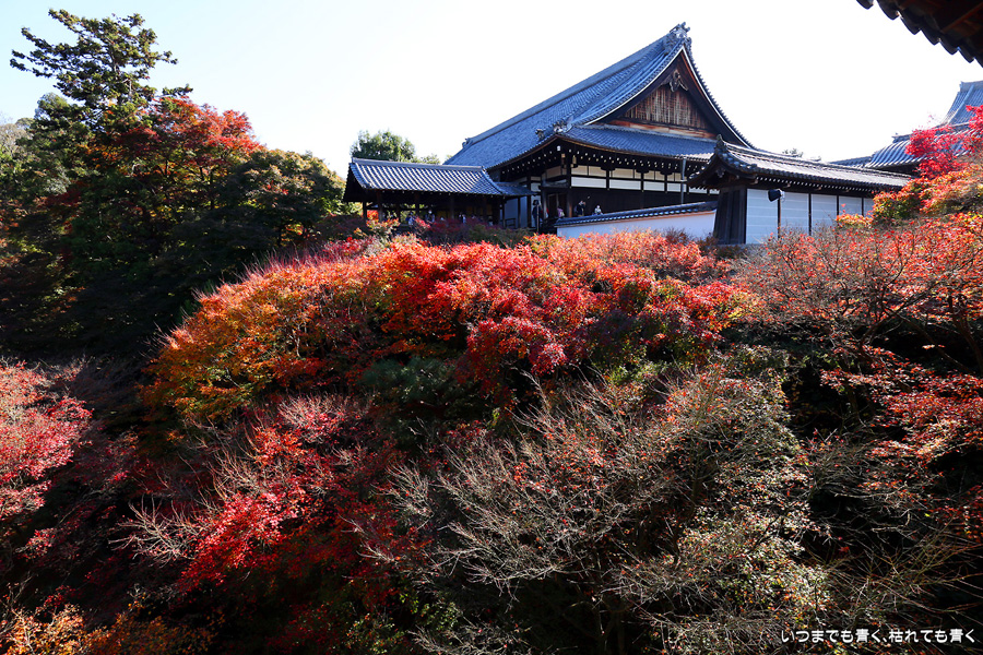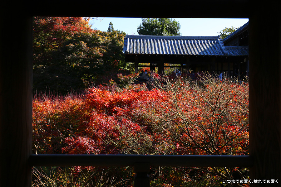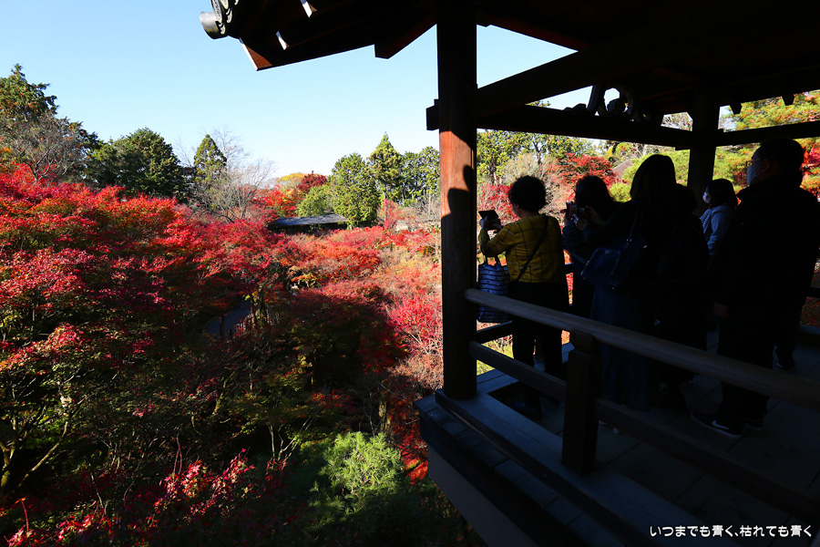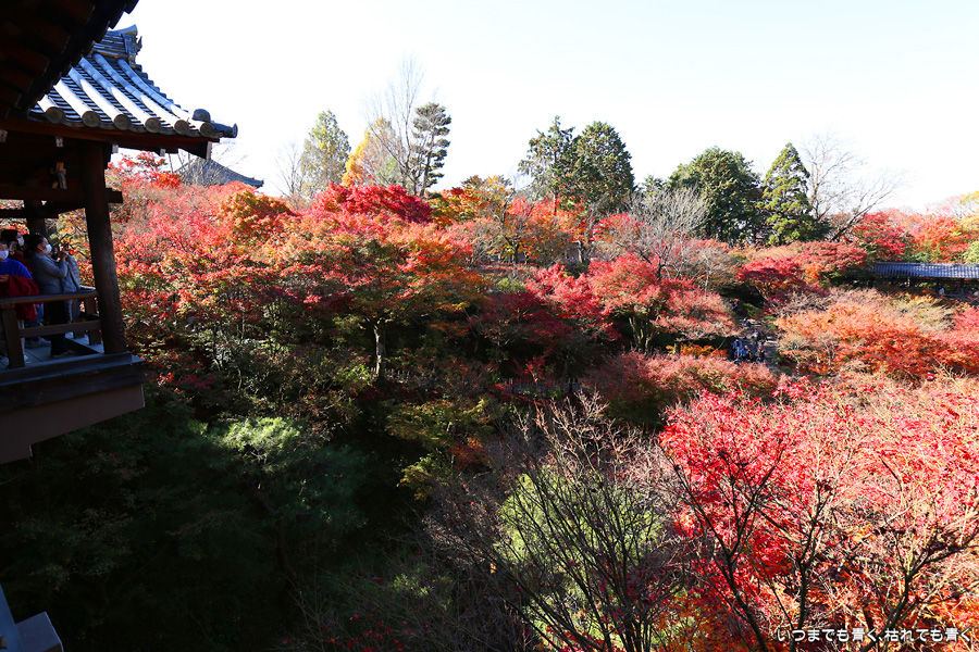今回の京都3日間紅葉めぐりは、人の少ない穴場めぐりだったのですが、東福寺は何度も来ているのに最近は2015年から来ていないとわかって、どうしても東福寺の紅葉を見たくて混雑覚悟でやってきました。しかし、通天橋で人のいない写真が撮れるほど人が少なくて、嬉しい誤算でした。少し見ごろの時期が過ぎている感じはしますが、さすがに東福寺の紅葉は圧巻です。