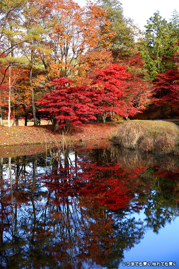 駐車場整理をしていた方に紅葉の状況を伺った時に「少し遅いと思うのでがっかりしないでね」と言われたのですが、がっかりするところなどはまったく無くまだまだ見頃で美しい紅葉でした。風がなく静かな池の水面にうつる紅葉と青空も素敵でした。広くはないところですがそれほど人も多くなくのんびりと紅葉を楽しめるいいところでした。