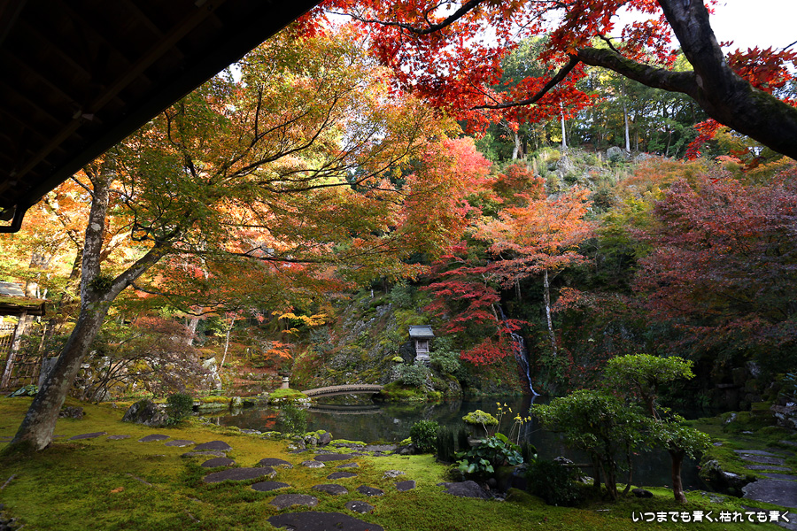 このお寺には「てっ(草かんむりに至)草園」という庭園があり、畳や縁側に座ってのんびりと庭を眺めることができます。庭園の紅葉は、一部は見ごろですが手前はまだ青葉のままで、紅葉の風景の迫力はまだ今一歩という感じでした。