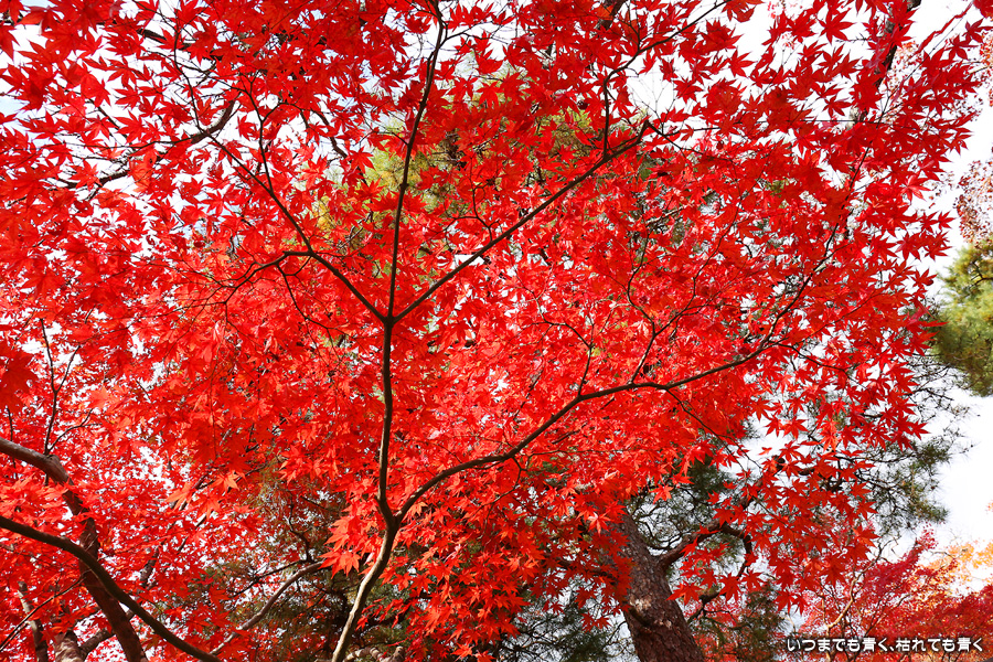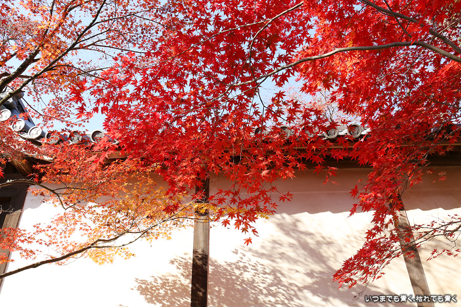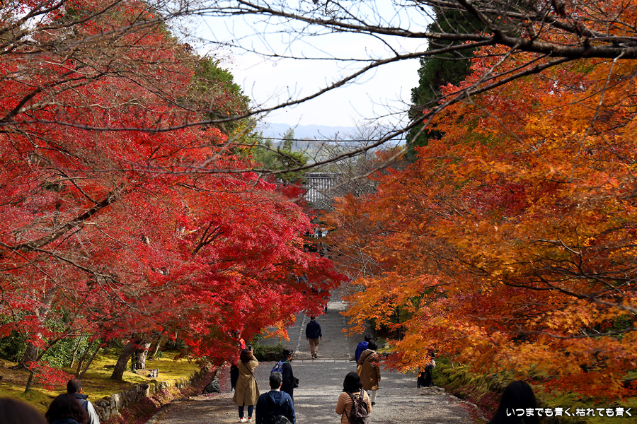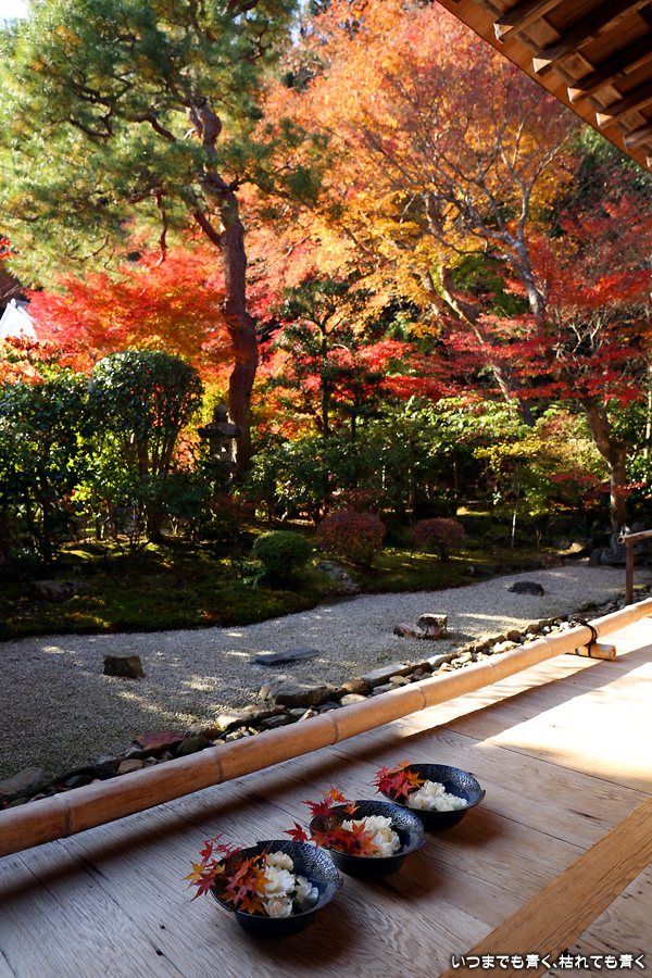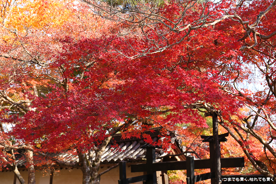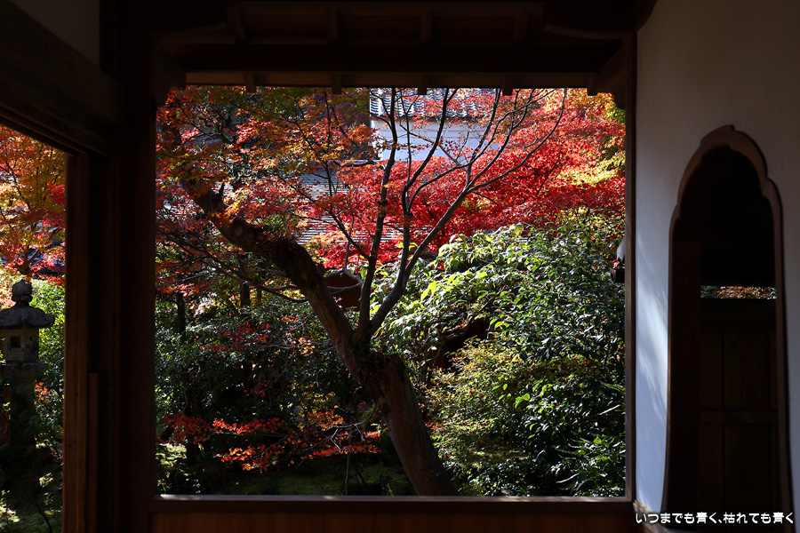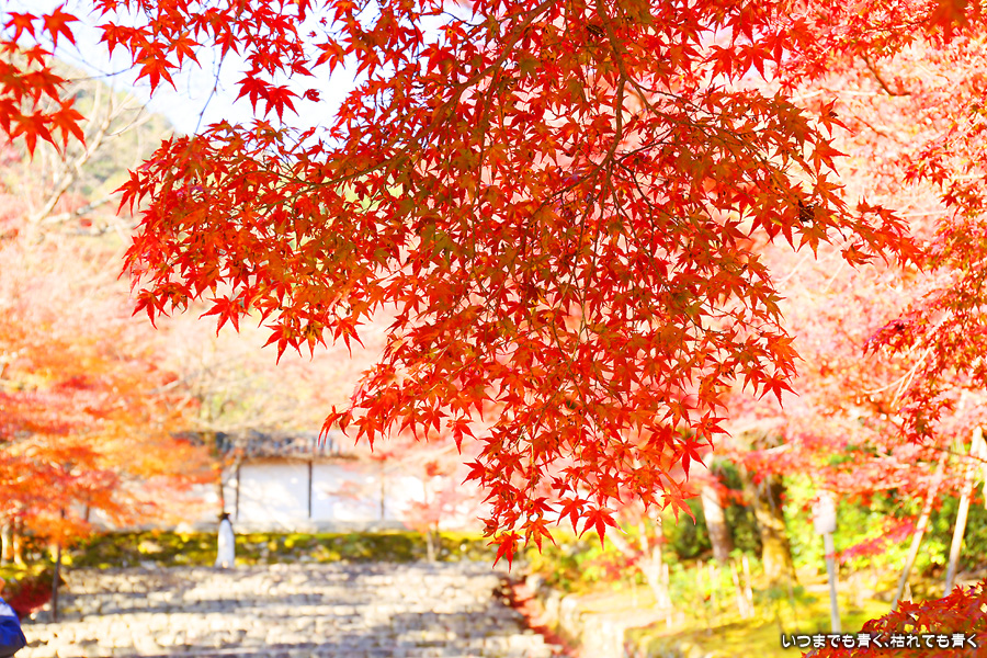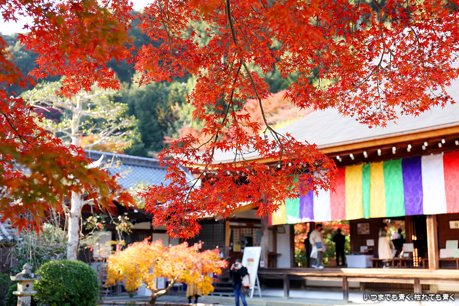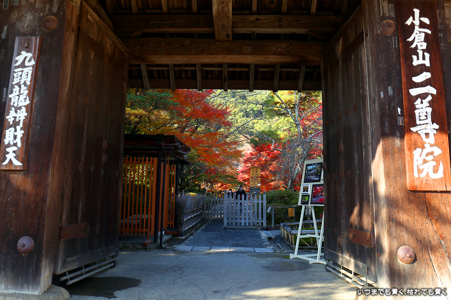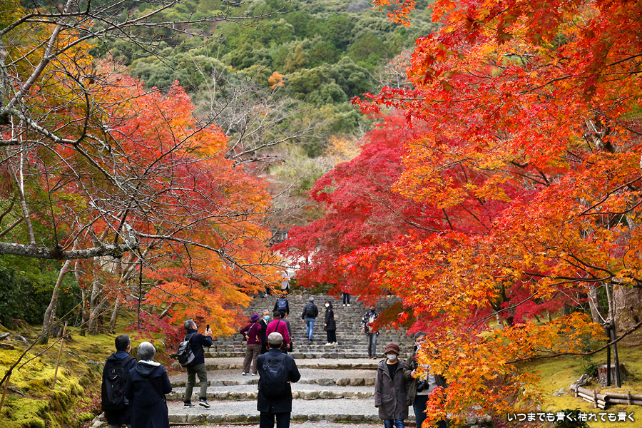 朝一番で人の少ない時に「紅葉の馬場」の写真を撮ろうと思って行きましたが、すでに人は途切れることはなく持久戦となりました。待ったわりには写真としてはありきたりでしかなく、自分なりの構図を探すべきだということをあらためて認識しました。二尊院の紅葉は何度も見に来ていますが、今年もとても素晴らしい紅葉でした。本堂では、のんびりと縁側に座って紅葉を眺めることもできます。