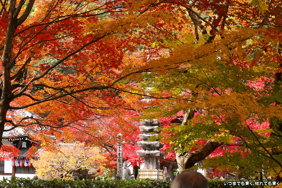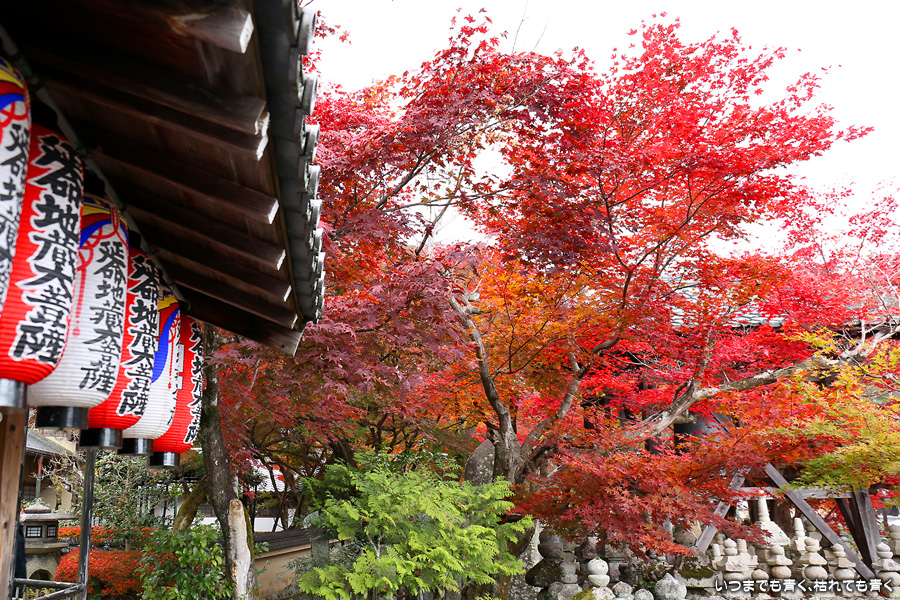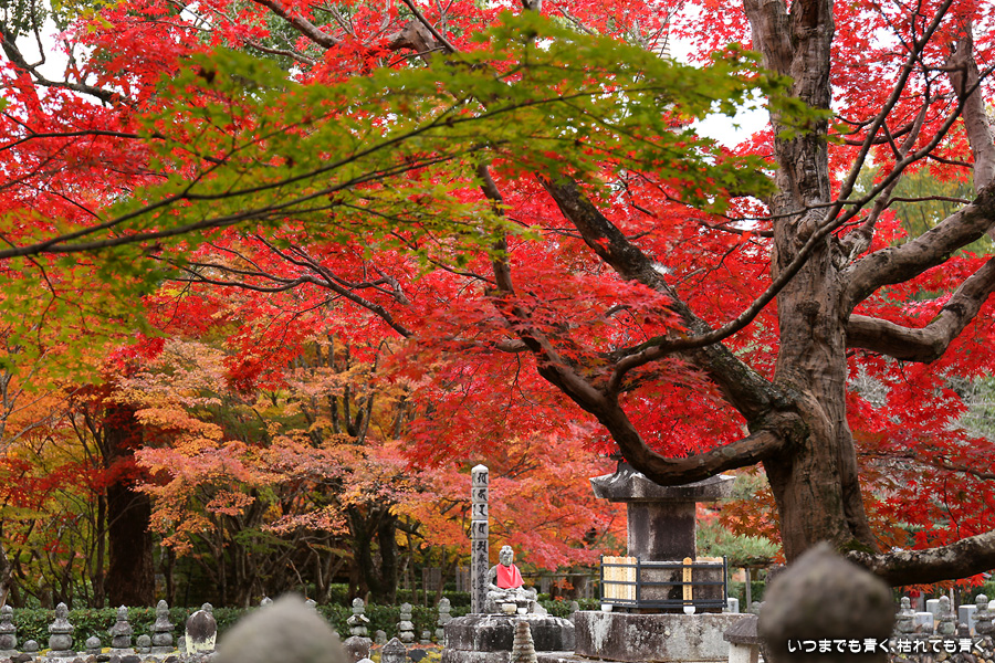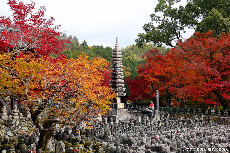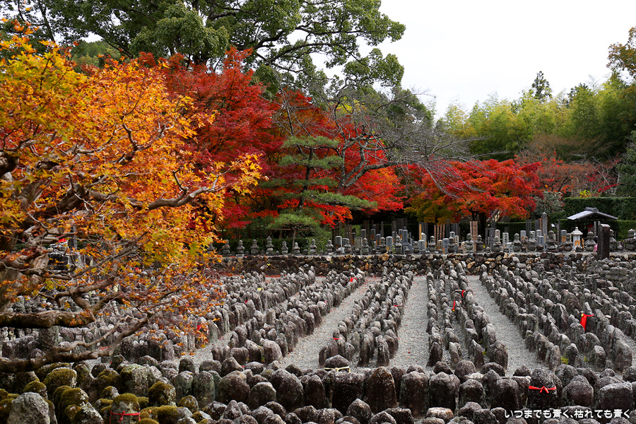 奥嵯峨を深く入ると化野念仏寺があります。かつては「赤い霊柩車」というサスペンス2時間ドラマのイントロの定番となっていたお寺です。その舞台となるのが「西院の河原」と呼ばれる境内の数多くの石仏、石塔です。真っ赤な紅葉と石仏、石塔は写真では良い絵になります。いつまでも写真を撮っていたい美しさでした。