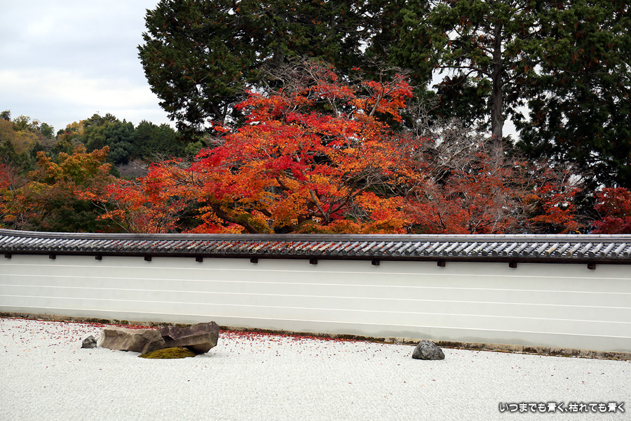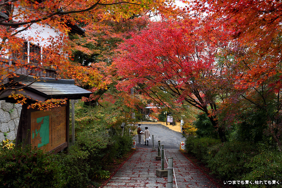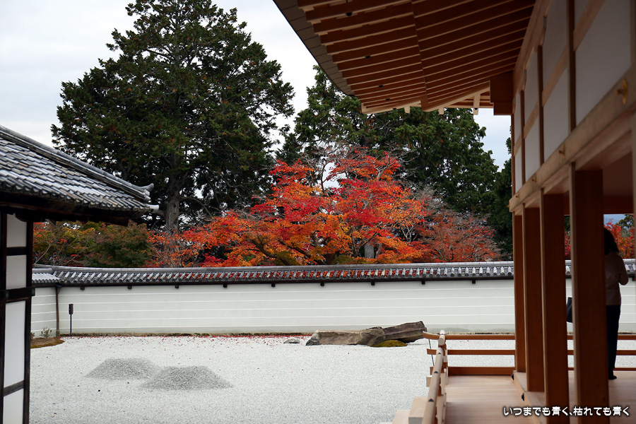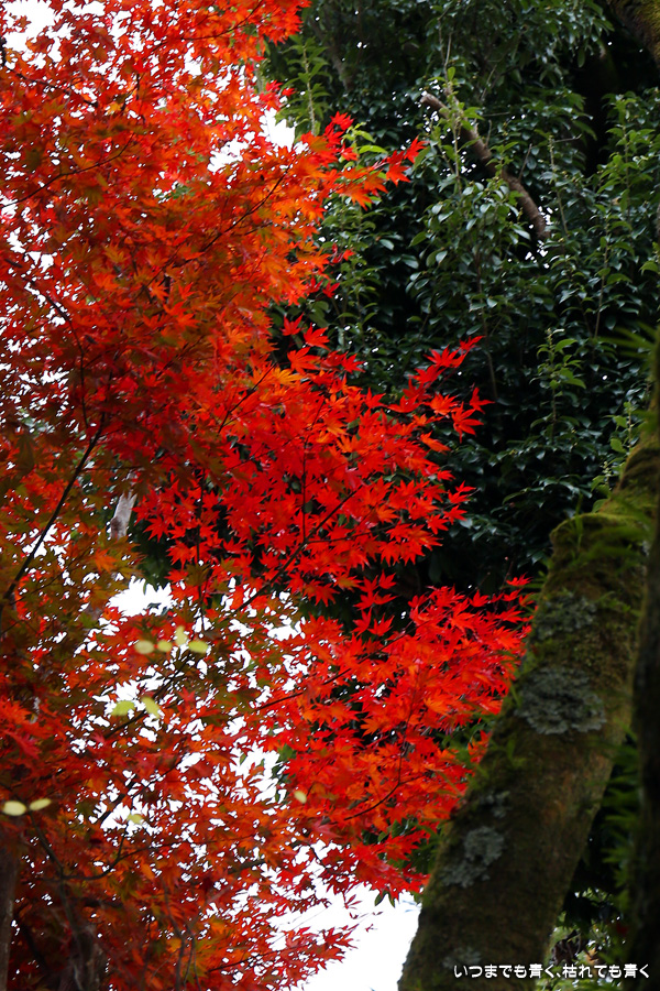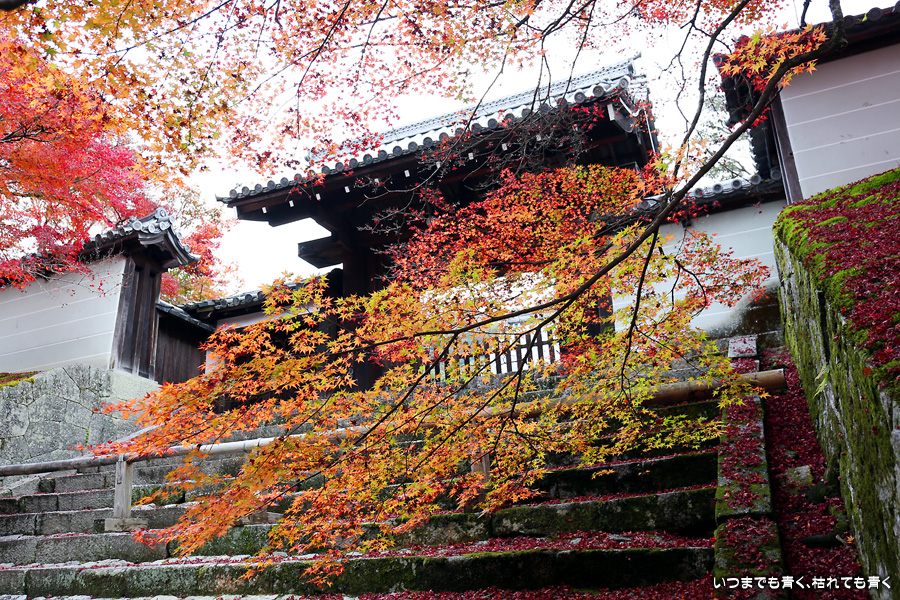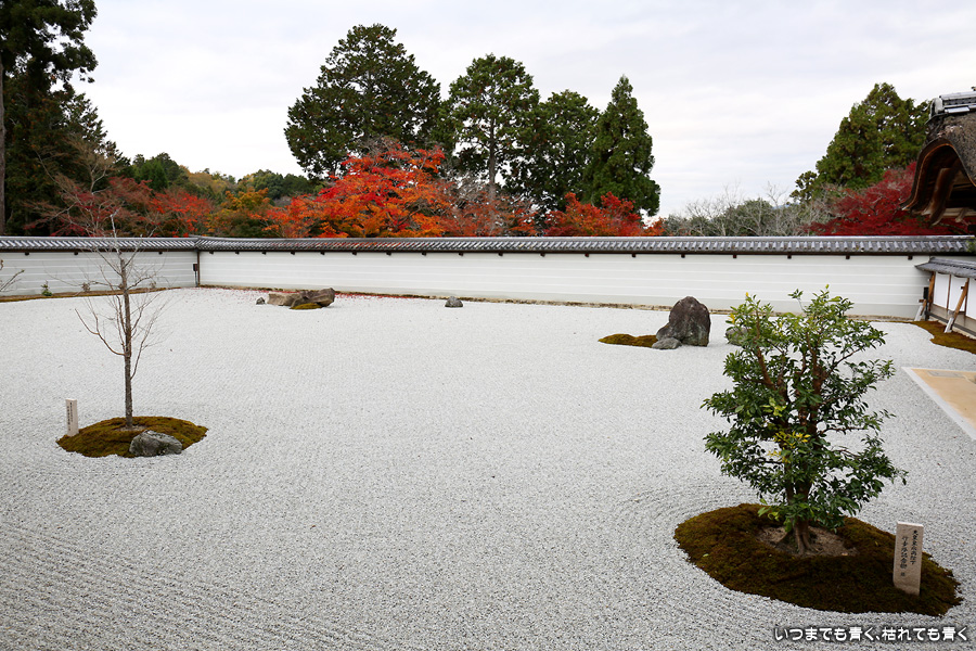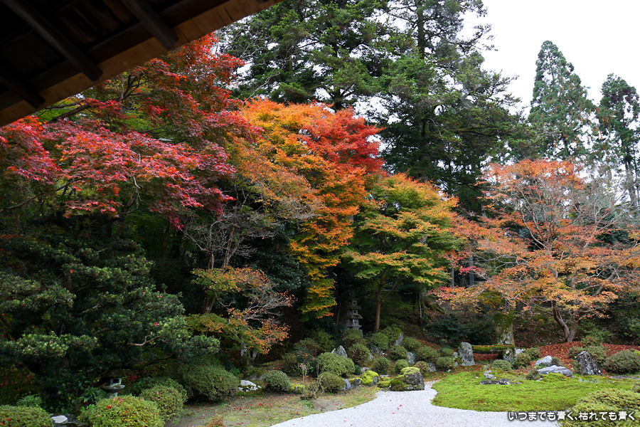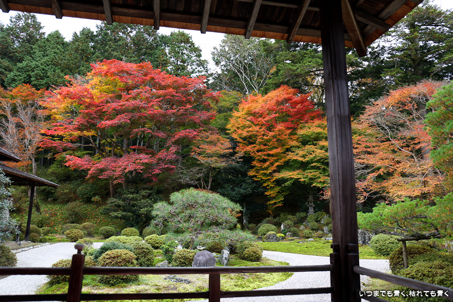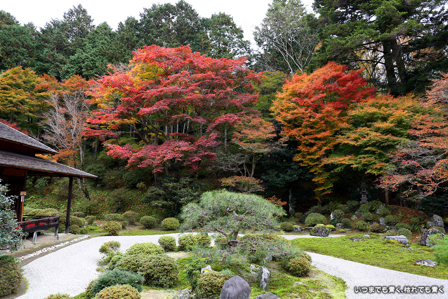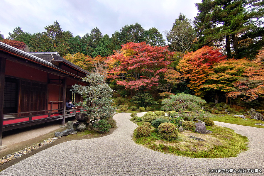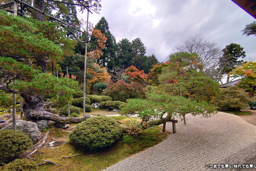 4年ぶりの曼殊院ですが、その時と大きく変わっているのは、今まで梅林があったところに新しい宸殿ができて、その前には「盲亀浮木之庭」と呼ばれる広い石庭ができていることでした。大玄関から大書院に向かう斜めの通路もなくなっていました。書院前の庭園は今まで通りですが、宸殿の方はかなり以前の雰囲気とは異なっています。宸殿は150年ぶりの復興再現だそうです。ちなみに宸殿とは門跡寺院にある歴代天皇・皇室関係者の位牌を祀る施設です。紅葉は見頃でしたが天候がよくないので華やかさよりも落ち着いた雰囲気の紅葉でした。