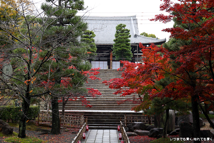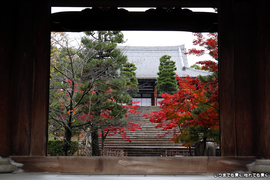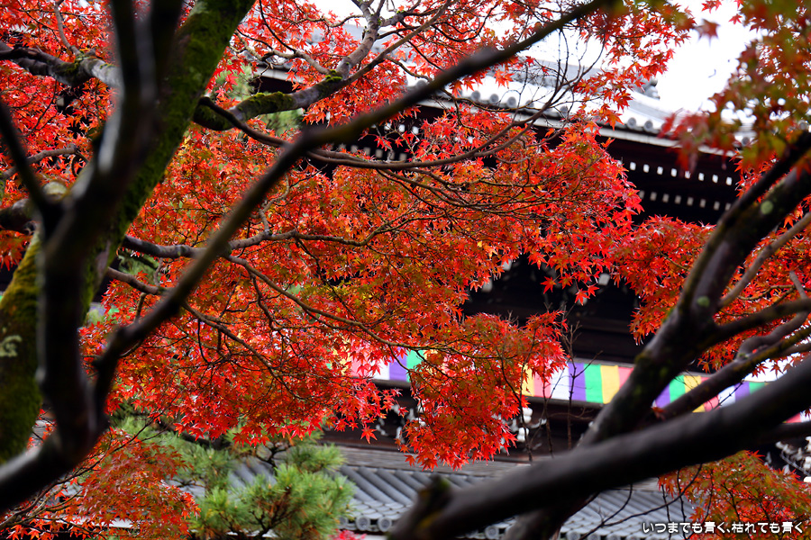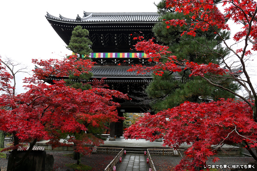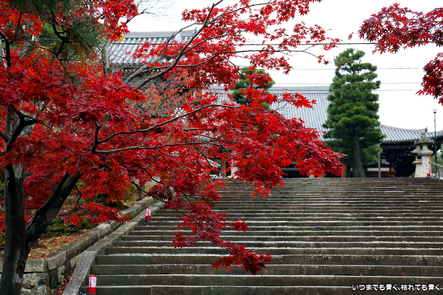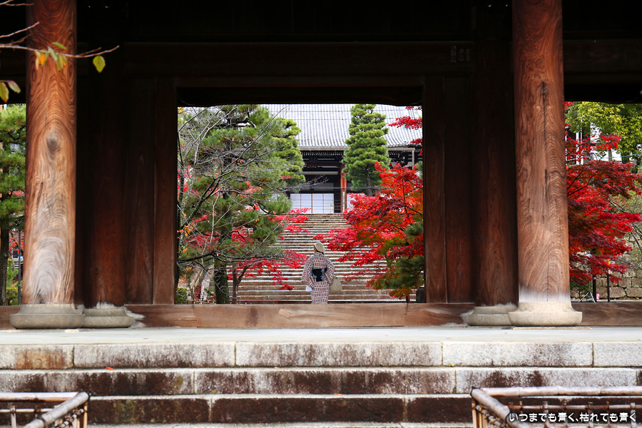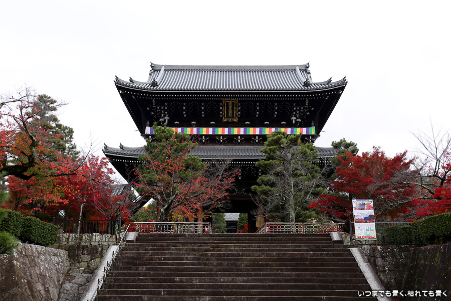 秋の京都ぶらりひとり旅の二日目は、金戒光明寺の駐車場に車を置いて徒歩で寺社を巡ることとします。金戒光明寺には紅葉の美しい庭園もあるのですが、今回も山門近辺の紅葉見学のみとしました。山門周りの紅葉は真っ赤に美しく染まっていて山門と紅葉が絵になります。ただ、電線がどうしても入ってしまう構図にせざるを得ない場合もあって、山門近くの電線だけは無くせないものだろうかといつも思ってしまいます。