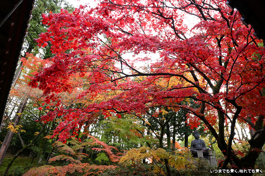 秋の京都を訪れた時には必ず訪れる栄摂院です。狭い庭ですがその庭の空を覆うような真っ赤な紅葉が魅力です。日が差していれば池に移る紅葉はもっと鮮やかに映っていて絵になる情景になったと思います。落ち紅葉も美しかったです。御朱印の案内がありましたので初めて栄摂院の御朱印もいただきました。