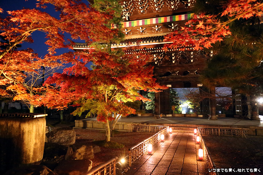 金戒光明寺の有料駐車場に車を止めて寺社巡りをしていたので、すべての予定を終えて戻ってきた時に撮影しました。ライトアップの撮影時には、ISOは100から400あたりの低感度固定、シャッターと絞りは自分で設定するマニュアルモード、ホワイトバランスは後で変更できるようにRAW保存、というのが私の撮影方法なのですが、この時は疲れていたのでオートモードで撮影してしまいました。ホワイトバランスも太陽光なので、赤味のかかった仕上がりになっています。ちなみにISOは12800となっており、かなり粗くなってしまっています。でもまぁ、写真なんて雰囲気が伝わればいいという割り切りも必要かなと思います。