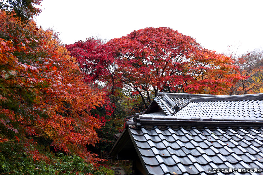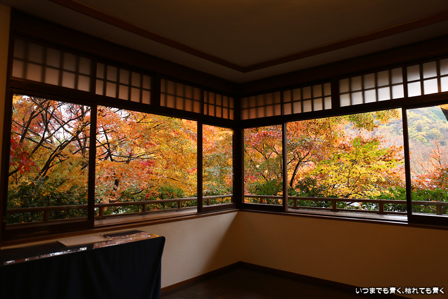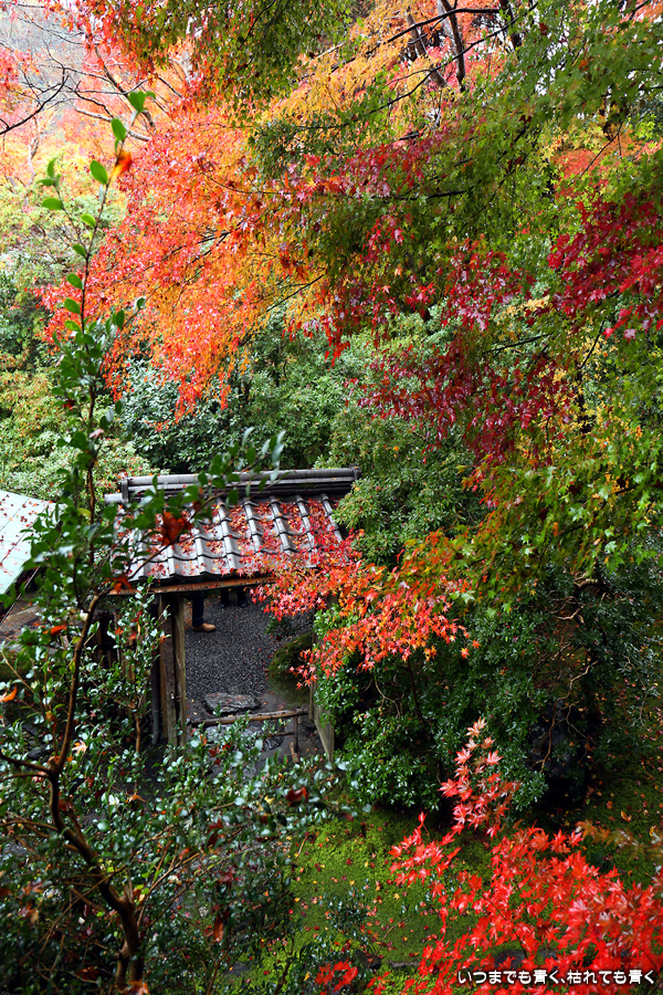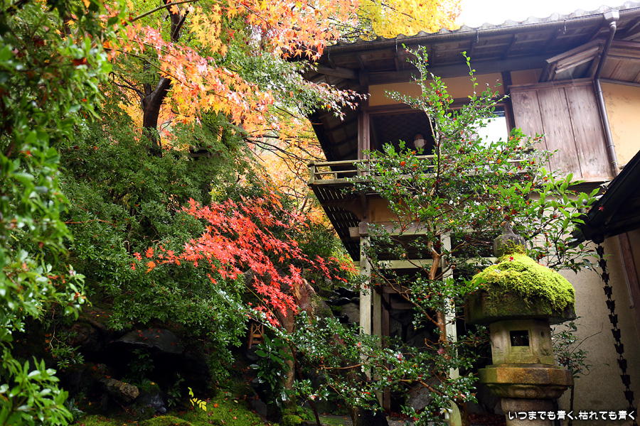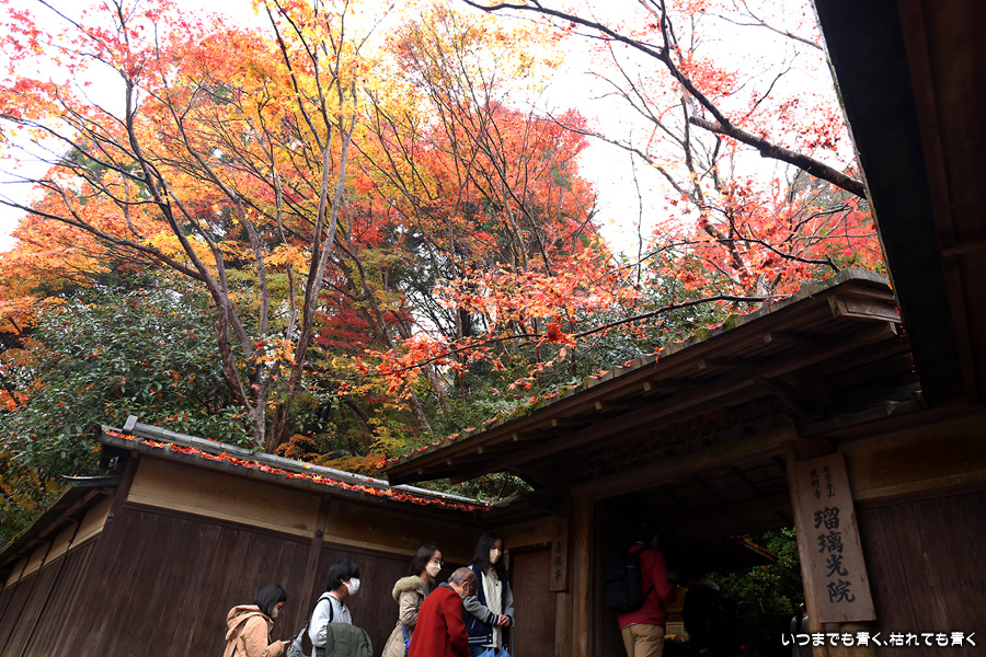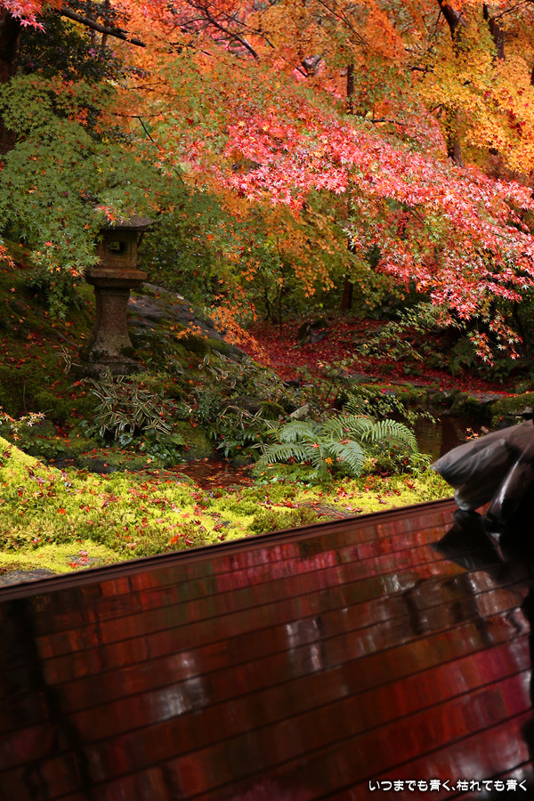 瑠璃光院は、コロナ以前から予約制であったことと拝観料が2,000円と高いということで、なんとなく「見せてやる」というような高飛車的なイメージを持っていました。なので今年も最初は行くつもりなかったのですが、5泊6日京都ぶらり旅の出発日前日の11月19日時点でちょうど真ん中の11月23日が本降り雨予報でどうしようかと考えた時に、瑠璃光院ならば室内だし行ったことがないので行ってみるのもいいかということで拝観を決めました。すぐに予約を調べると、23日は祝日ながら天気予報が良くないせいか13時にまだ空きがあり予約もできました。そういう経緯で拝観した瑠璃光院ですが、思っていた以上にとても良かったです。どこからも絵になる情景ばかりで眺めて写真を撮っていたらあっというまに1時間は経ってしまいます。ただ、時間制でも追い出されたりすることはなく、ゆったりと楽しむことができました。真面目な私は長居はよくないと思って後ろ髪引かれる思いで出てきましたが、もう少し長居をさせていただいて構図をいろいろと考えればいい写真が撮れたかもしれません。特に雨に濡れた庭は風情を感じられて素敵でした。また、机に映り込む有名な写真の撮影は、私が撮った位置よりももう少し下から撮るのが正しかったようです。お寺の方の対応は、事前に勝手に抱いていた高飛車的な対応とはまったく異なり、とても丁寧で親切でした。たぶん、来年から瑠璃光院ははずせない場所になりそうです。