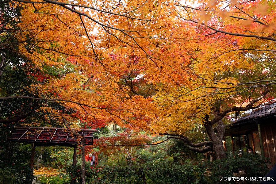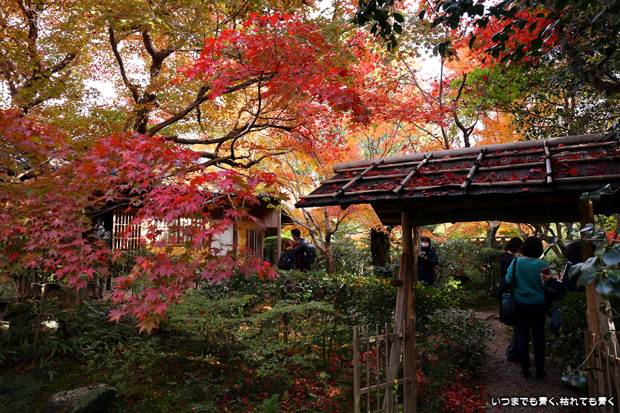厭離庵は一度も拝観したことがなく、今回も予定には入れていませんでしたが、宝筐院から二尊院に向かう途中にあった紅葉の美しい看板をみて立ち寄ってみました。厭離庵は臨済宗天龍寺派の寺院で一般公開は紅葉の時期のみです。藤原定家の小倉山荘跡で、定家が百人一首を撰したところだと言われています。狭い庭園ですが趣があってとてもいいところです。思っていたよりも人は多くて、写真はどうしても人がはいってしまうことが多かったですが、それも雰囲気を残せていいかなと思います。